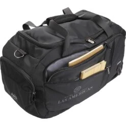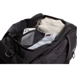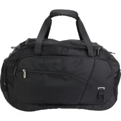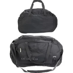 Jet black performance polyester fabric that is lightweight, water repellent, and super durable. Deep roomy interior with attached hideaway safety pocket. Side access shoe or laundry pocket. Expandable side pocket. Exterior carabiner great for attaching your favorite stowaways. Two generous front panel organizer pockets. Comfort padded shoulder strap.
