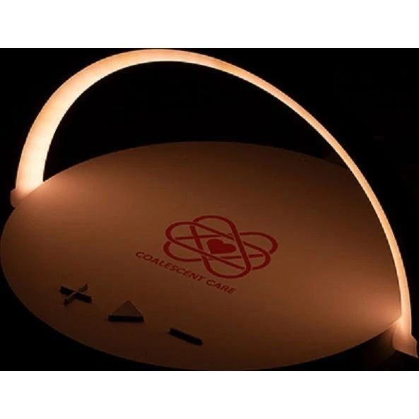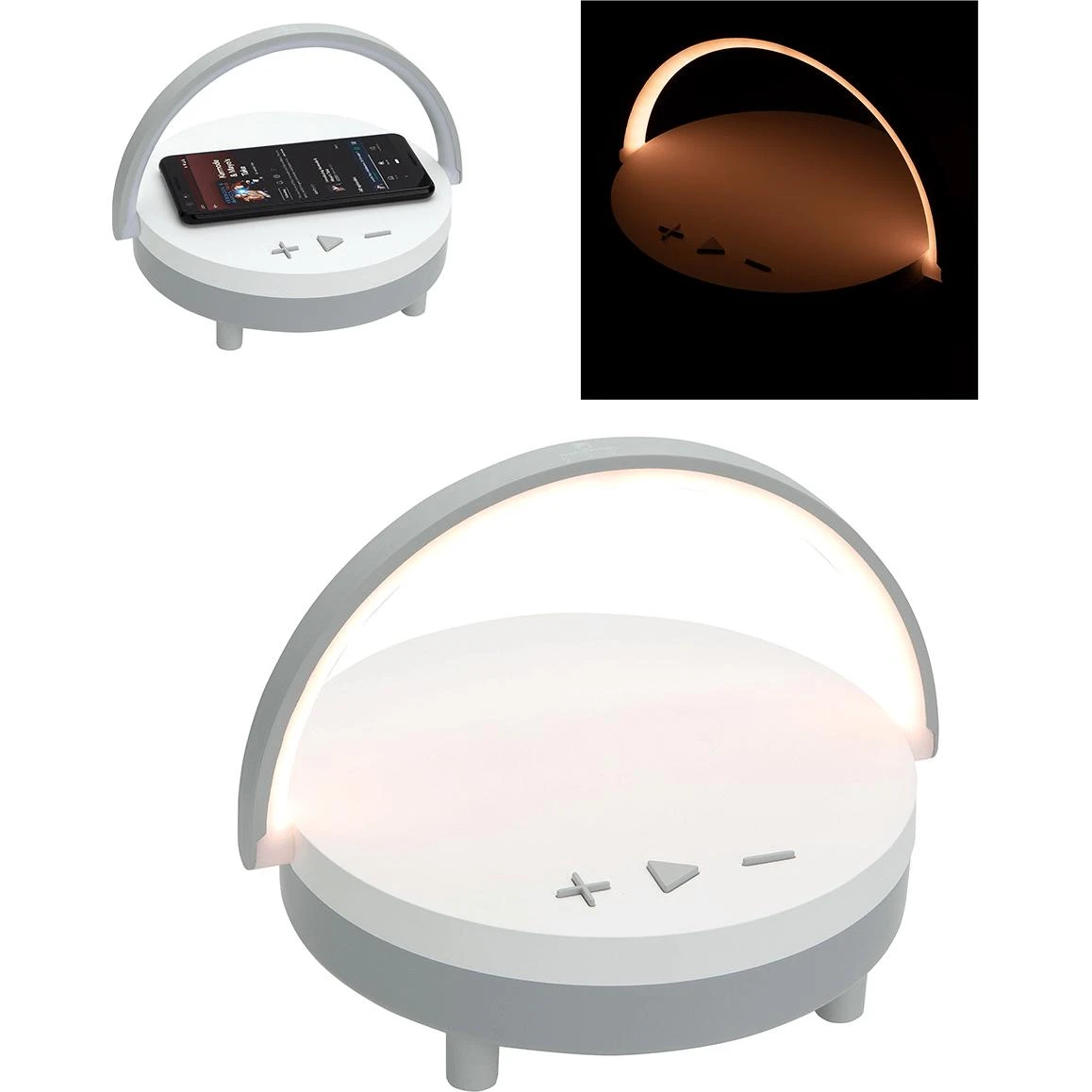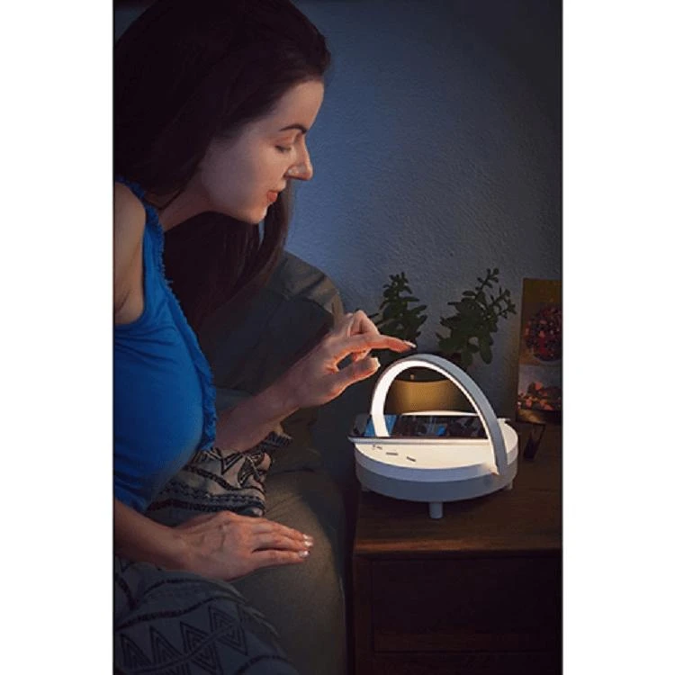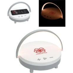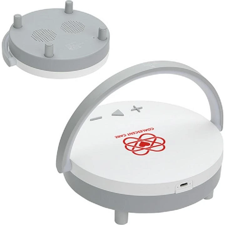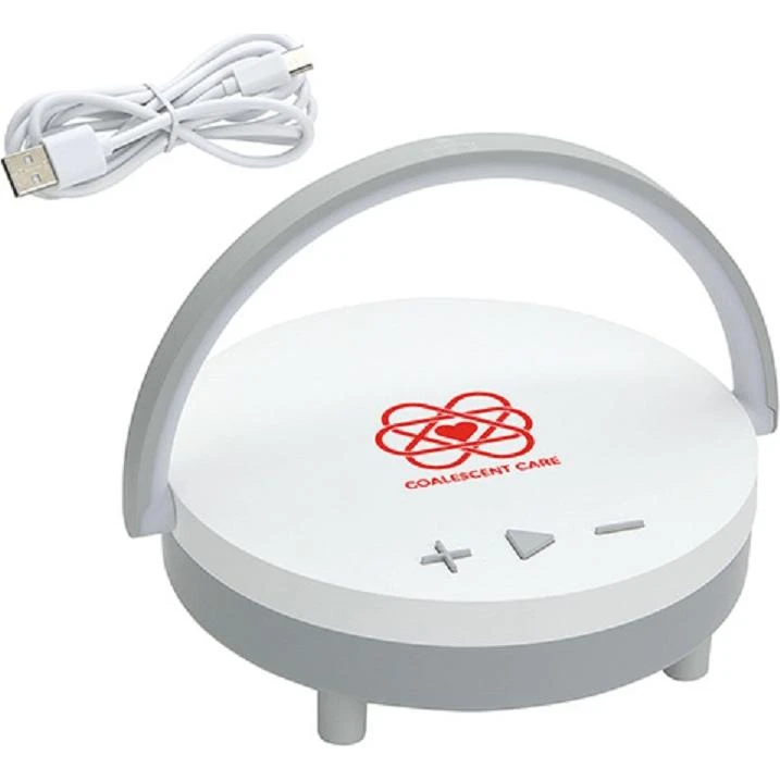3W wireless speaker with woofer. 5W wireless charging pad on top. Multi-functional to use for bedside light or as a phone stand with handle flipped up for use on desk. Change light brightness by tapping the top of light handle to choose from three light modes. LED: 200 Lumens. Wireless charging output: 5W. Input: 5V/3A. Includes USB to USB-C cable. FCC certified.