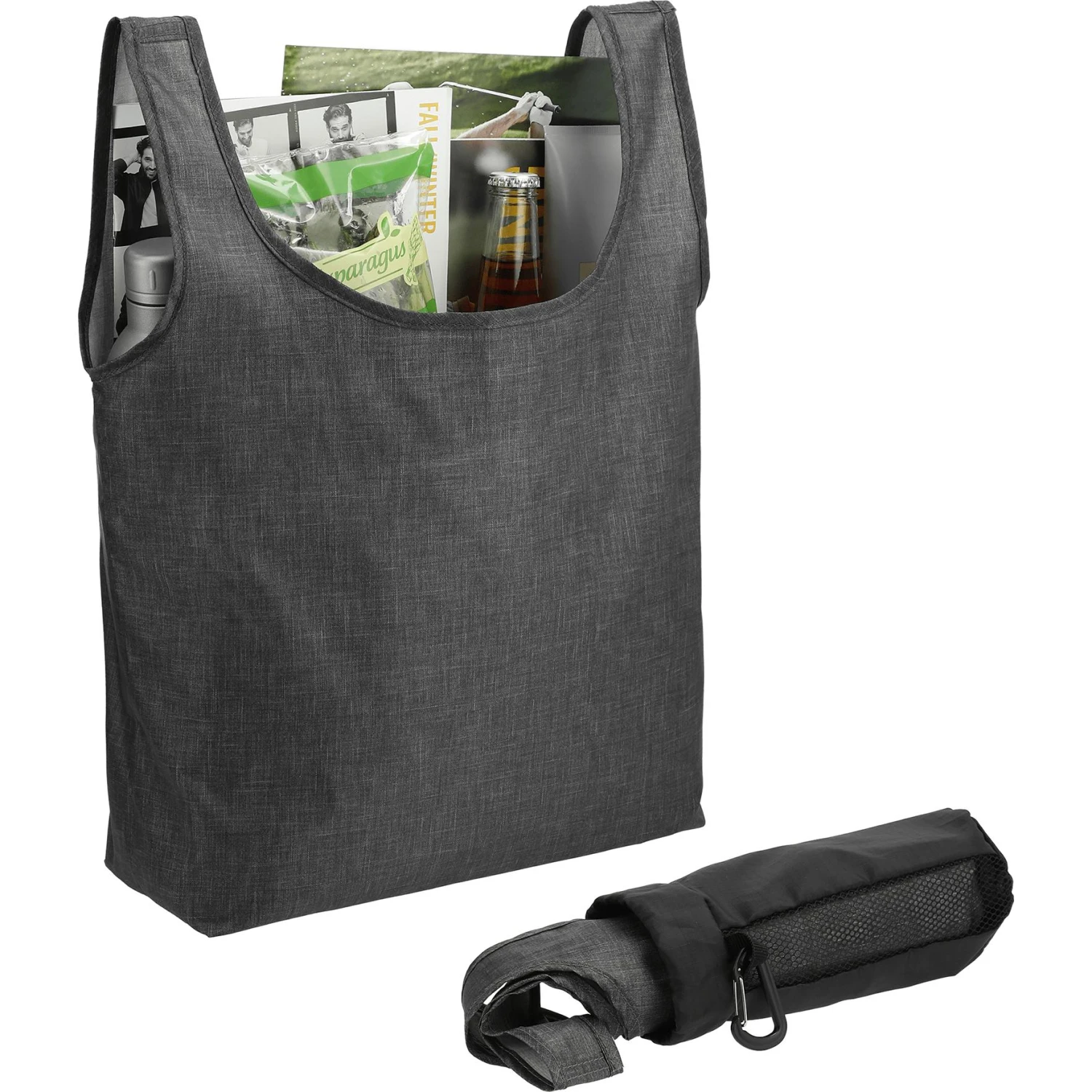 Tired of your shopping totes taking up so much room when not in use and causing clutter? The Ash 3-pack of totes is your convenient solution. The ripstop pouch features a wide opening with shock cord to easily take the bags in and out. It also has a removable carabiner clip and mesh side panel. Each shopper bag measures 13″H x 12.5″W x 4.5″D with a 7″ handle drop and is made of easily wipeable RPET Polyester material.