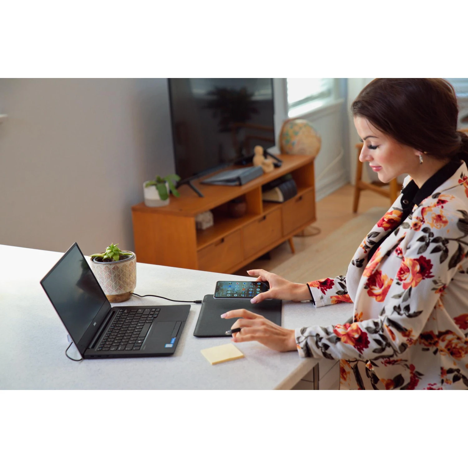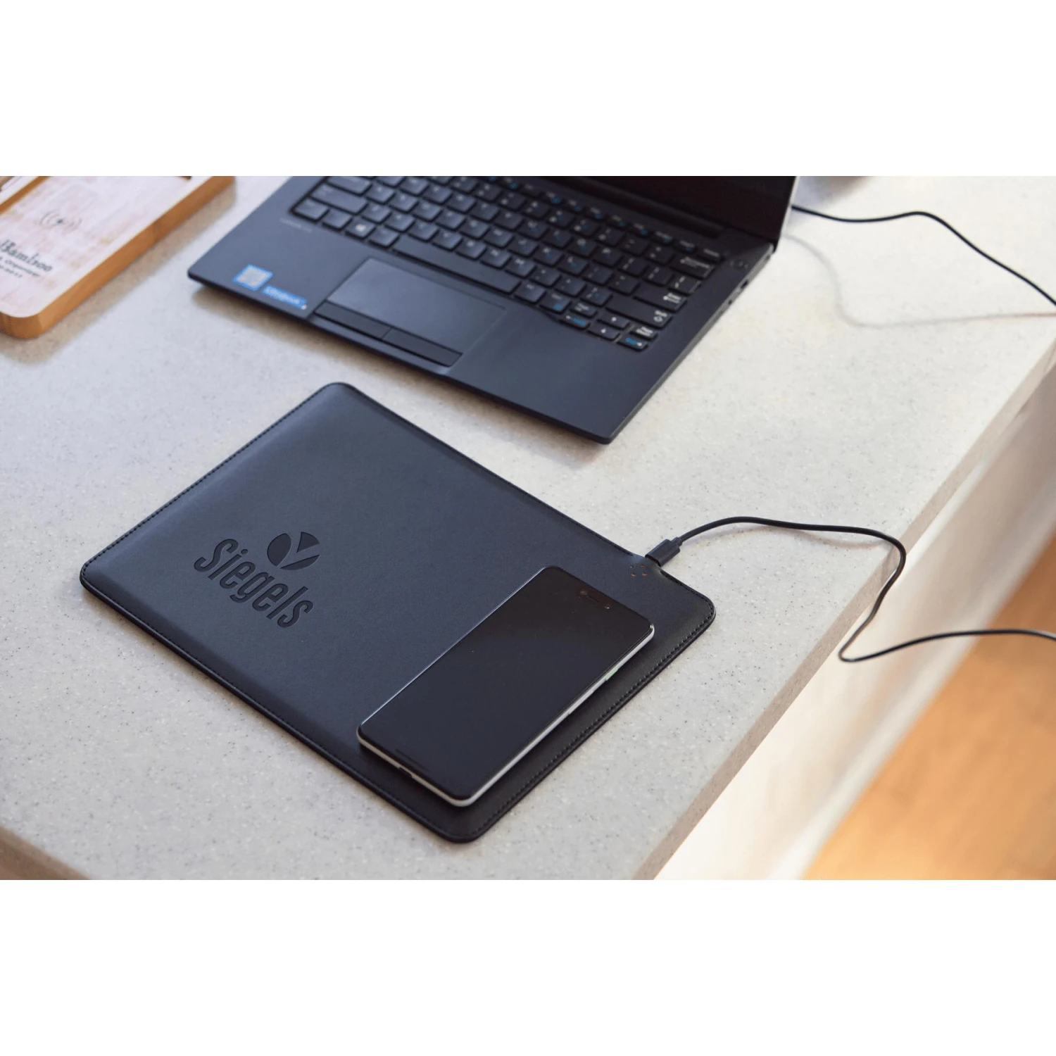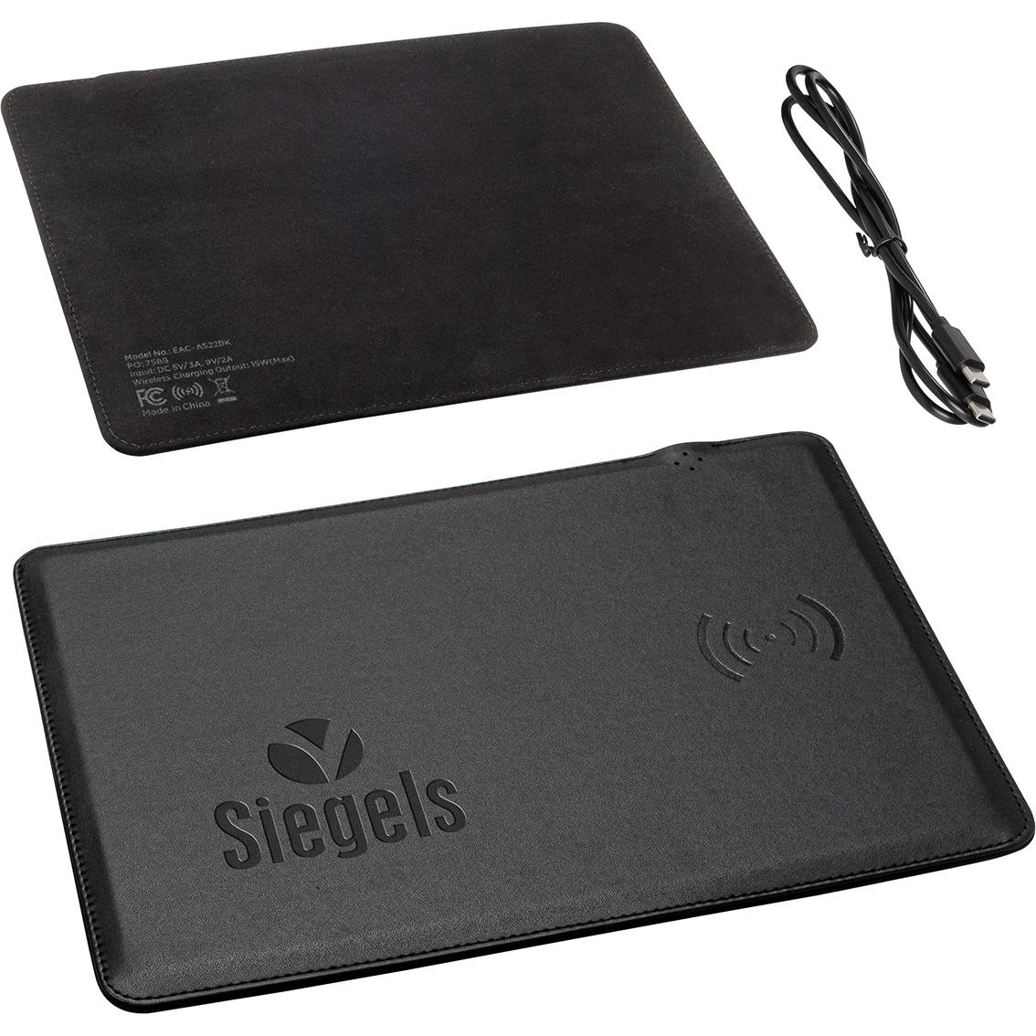 15W fast-charge wireless charger. Soft-touch faux leatherette mouse pad. Power indicator. Output: up to 15W (Android) and up to 7.5W (iPhone). Input: 5V/3A to 9V/1.67A. Textured non-skid back. Includes USB Type-C to USB Type-C cable.