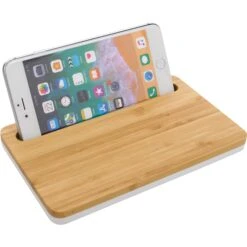 This stylish, beautiful bamboo wireless charging pad is made of real bamboo. It allows you to charge your Qi-enabled devices while also acting as a phone stand or desk accessory. Supports wireless charging for (but not limited to) iPhone 8/8Plus/X/XS/XS Max/XR *Samsung Galaxy Note5/S6/S6 Edge/S6 Edge+/S7/S7 Edge/S8/S8+/S9/S9+/Note 9 * Google Nexus 5/6/7 * HTC Droid DNA, 8X * LG G3/G4, Lucid 2/3 * Nokia Lumia 920/930 *. Provides 5W Qi wireless charging capabilities. Made from real bamboo for a natural, stylish look. Organize your desktop with the built-in phone or device holder. Spectacular imprint area to display your ad. Operating Power: 5W.