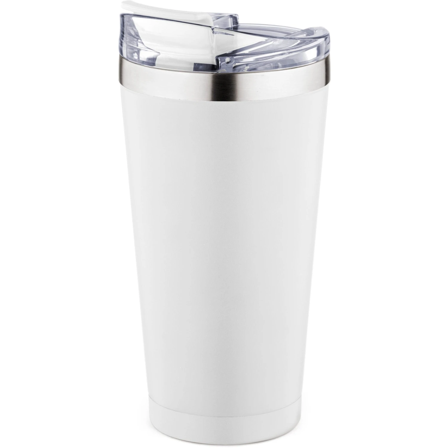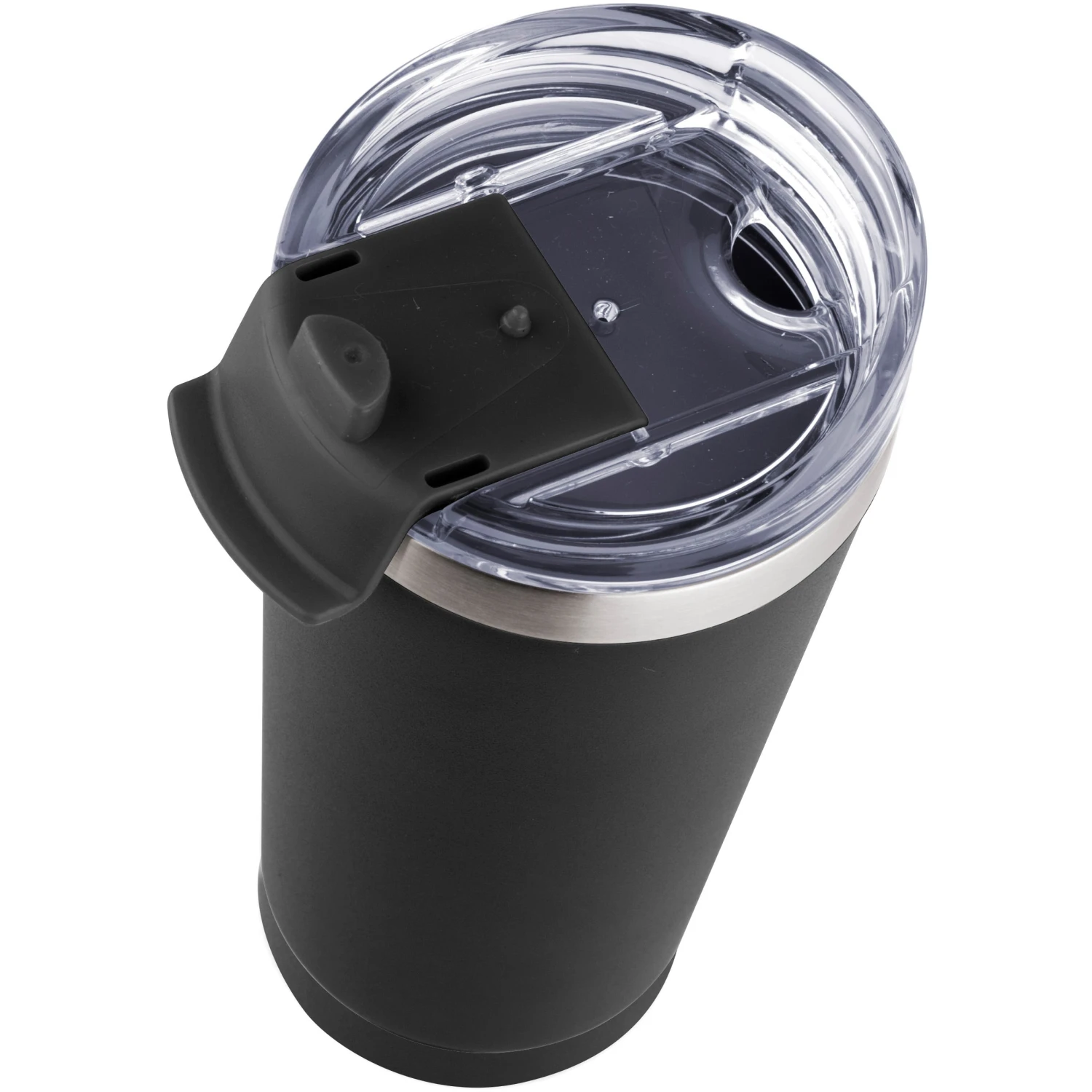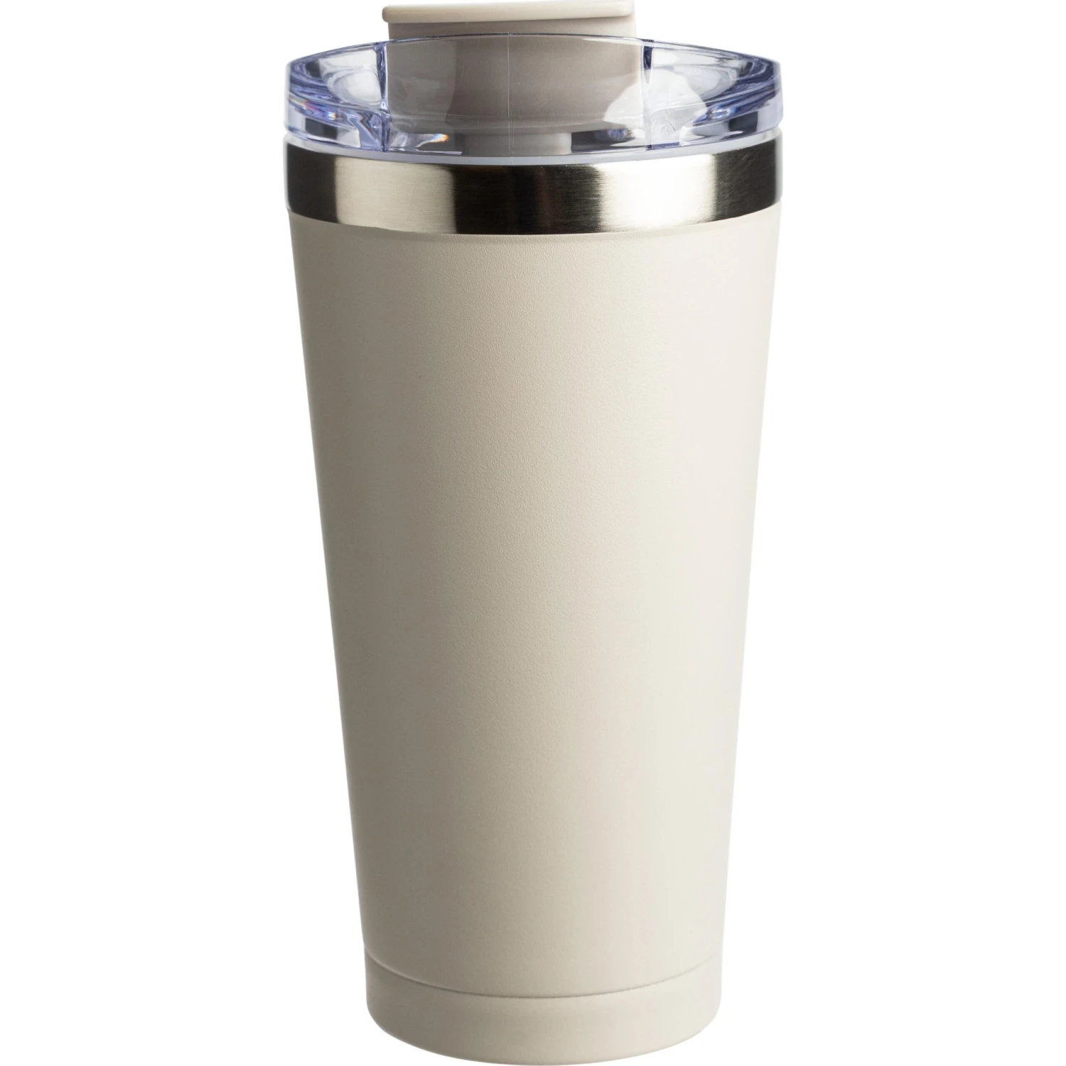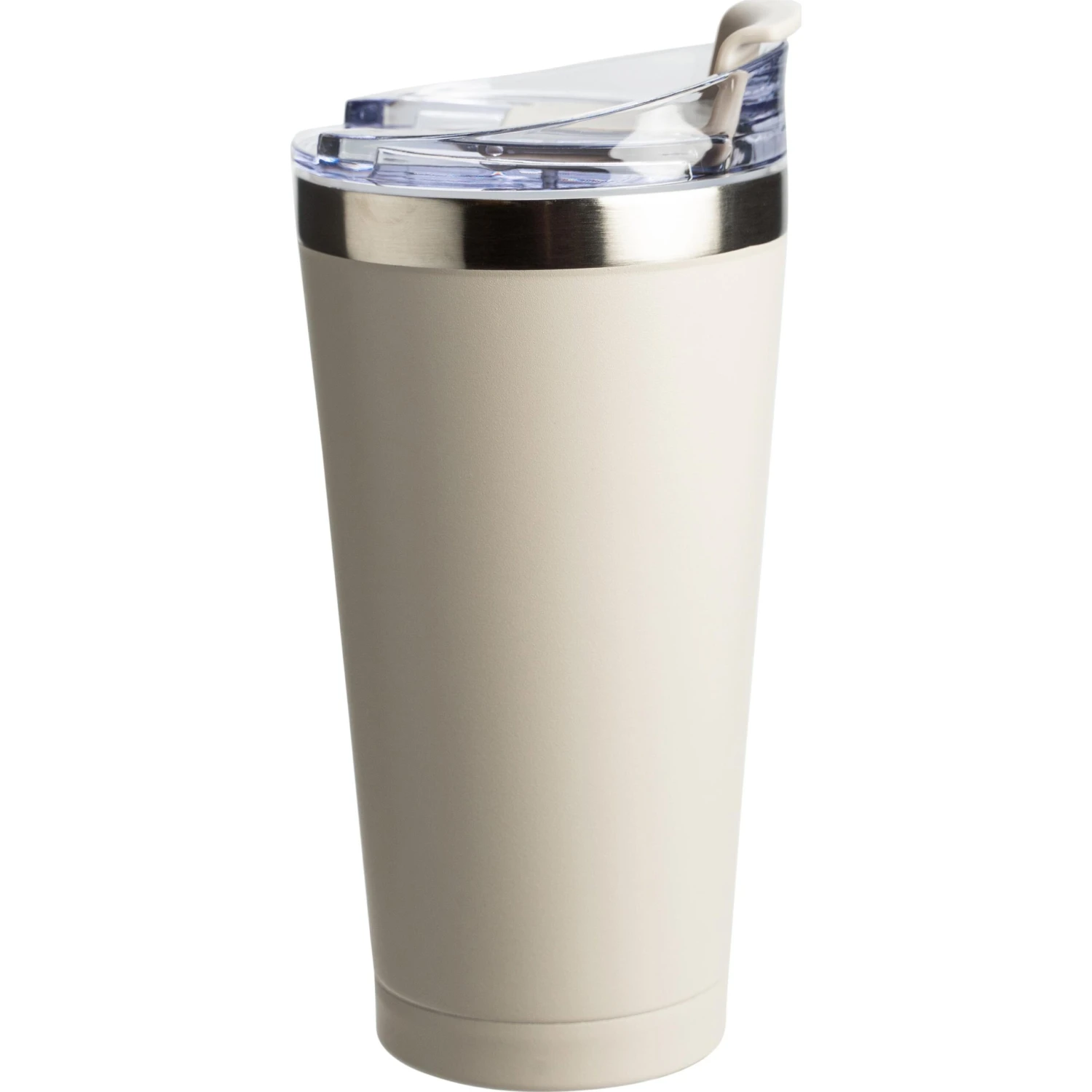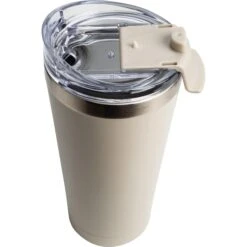 20 ounce double wall, stainless steel, vacuum insulated tumbler. Features a clear AS plastic screw-on lid with color matched PP flip top spout cover. Powder coat finish with copper lining and brushed silver accents. Keeps contents cold for 12 hours or hot for 6 hours. Fits in standard cup holders. Not microwave safe. Hand wash only.
