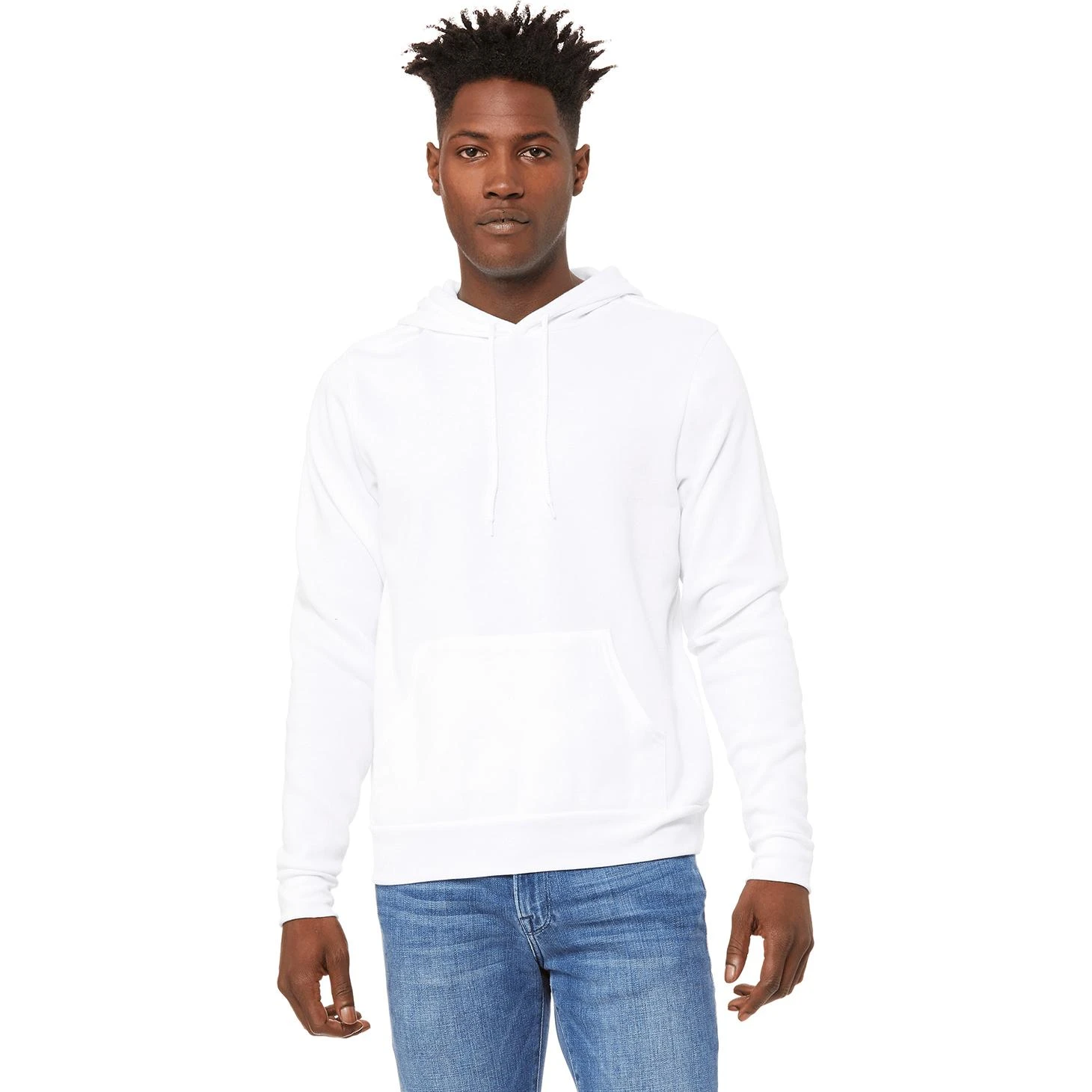 White cord drawstring. Unisex sizing. Retail fit. Kangaroo pockets. Ribbed cuffs and waistband. Tearaway label.