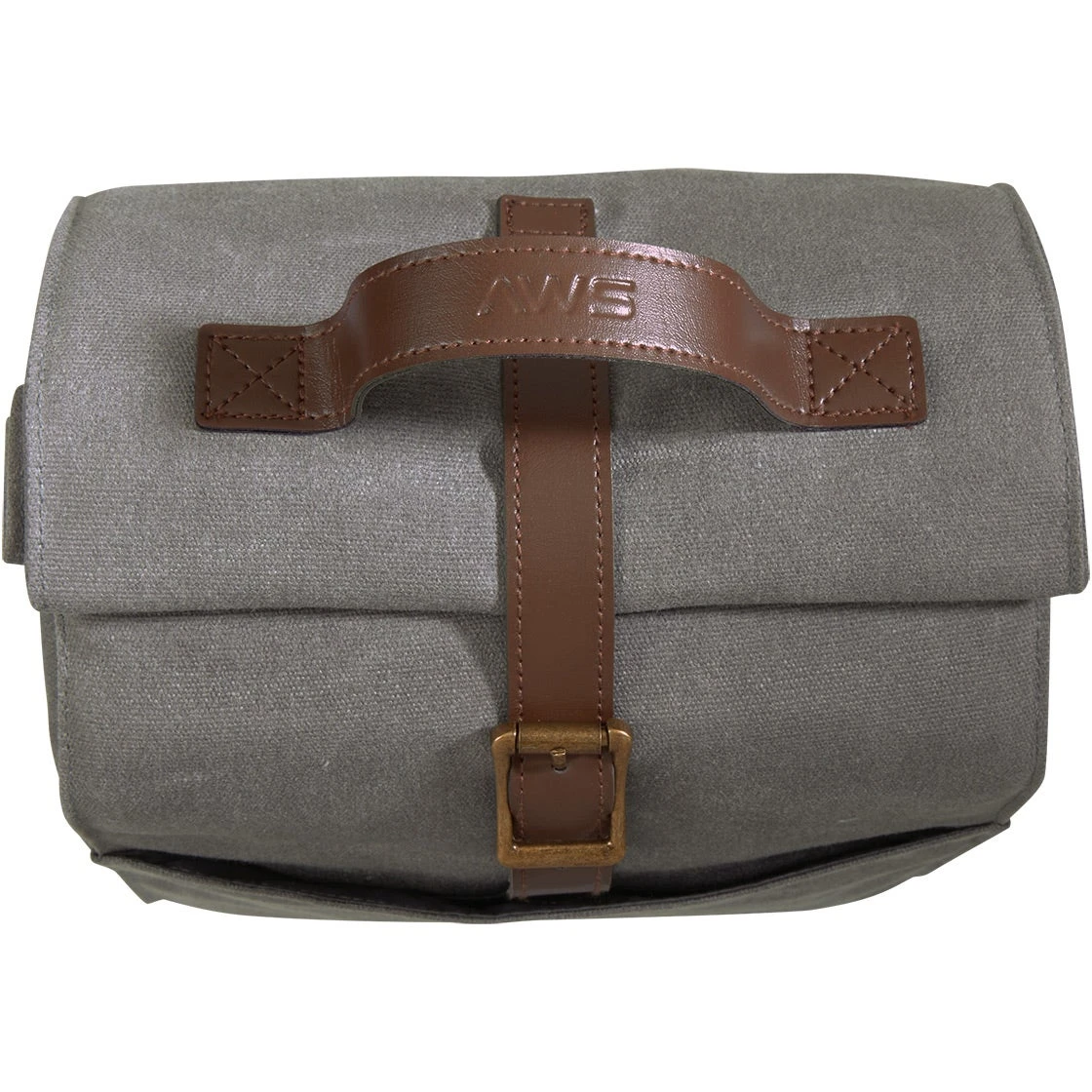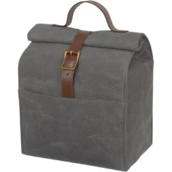 Made of durable, waxed 12 oz. cotton canvas. PEVA lining. Leatherette carrying handle. Adjustable leatherette strap with brass-look buckle closure. Hook and loop closure main compartment. Front pocket. Spot clean, air dry.