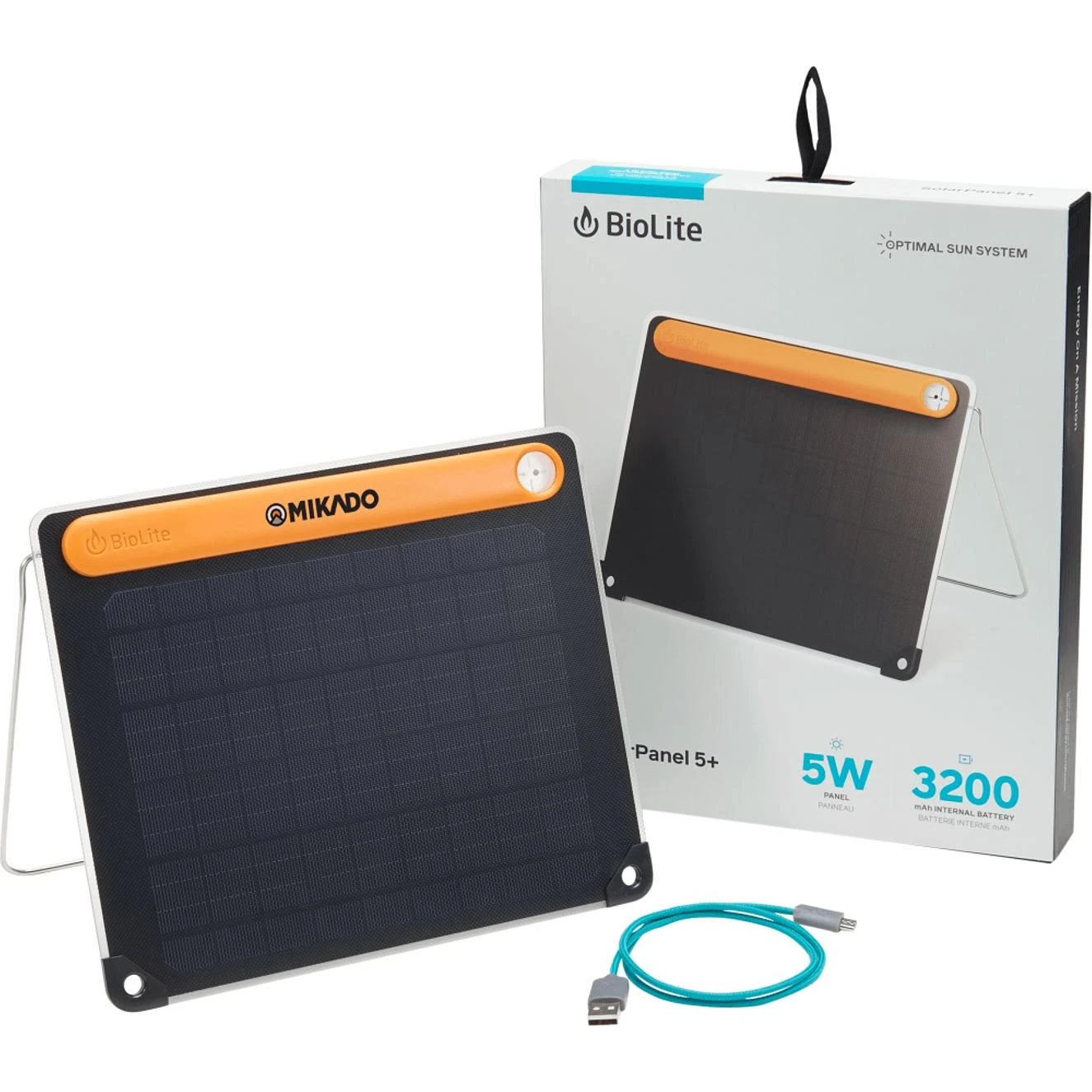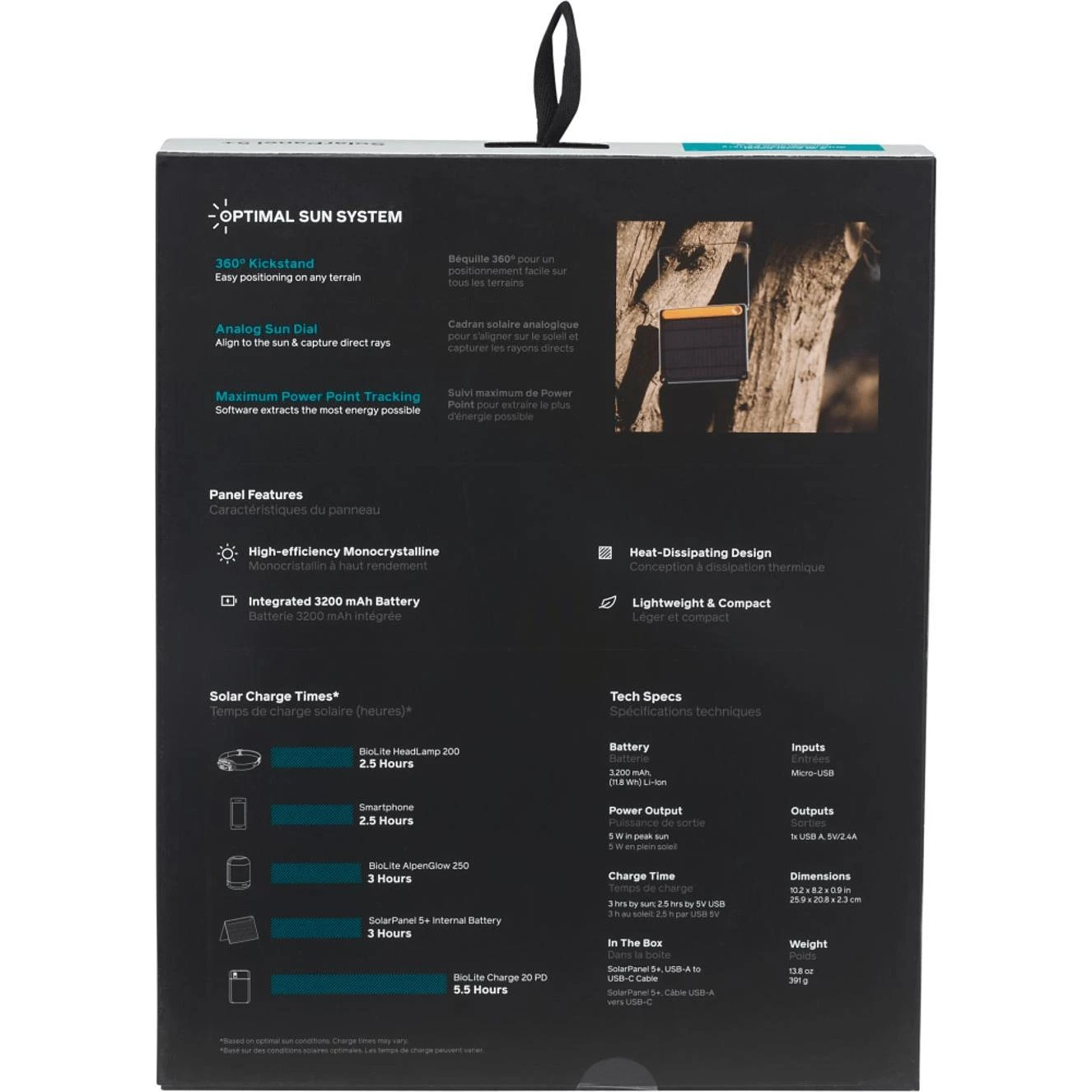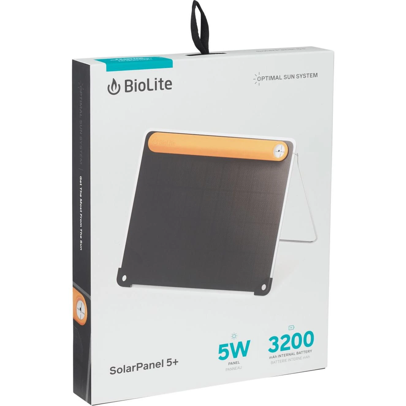 Get the most from the sun with the lightweight and portable BioLite SolarPanel 5+. Featuring BioLite’s Optimal Sun System, an integrated sundial aligns you to the sun to capture direct rays while a 360-degree kickstand simplifies positioning on uneven terrain. The 3,200mAh onboard battery stores energy for later, allowing you to charge devices when you need it most. Power phones, tablets, and BioLite gear with this ultra slim 5-Watt panel. 5 watts of usable power via USB output. 360-degree stand featuring Optimal Sun System. Integrated 3,200mAh on-board battery.