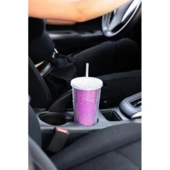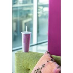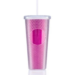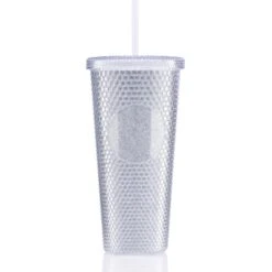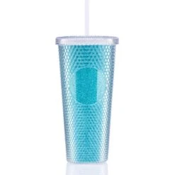 Made from 100% recycled SAN plastic. Studded reusable tumbler with lid and straw. Clear bottle with glitter insert. Hand washing this item is recommended.