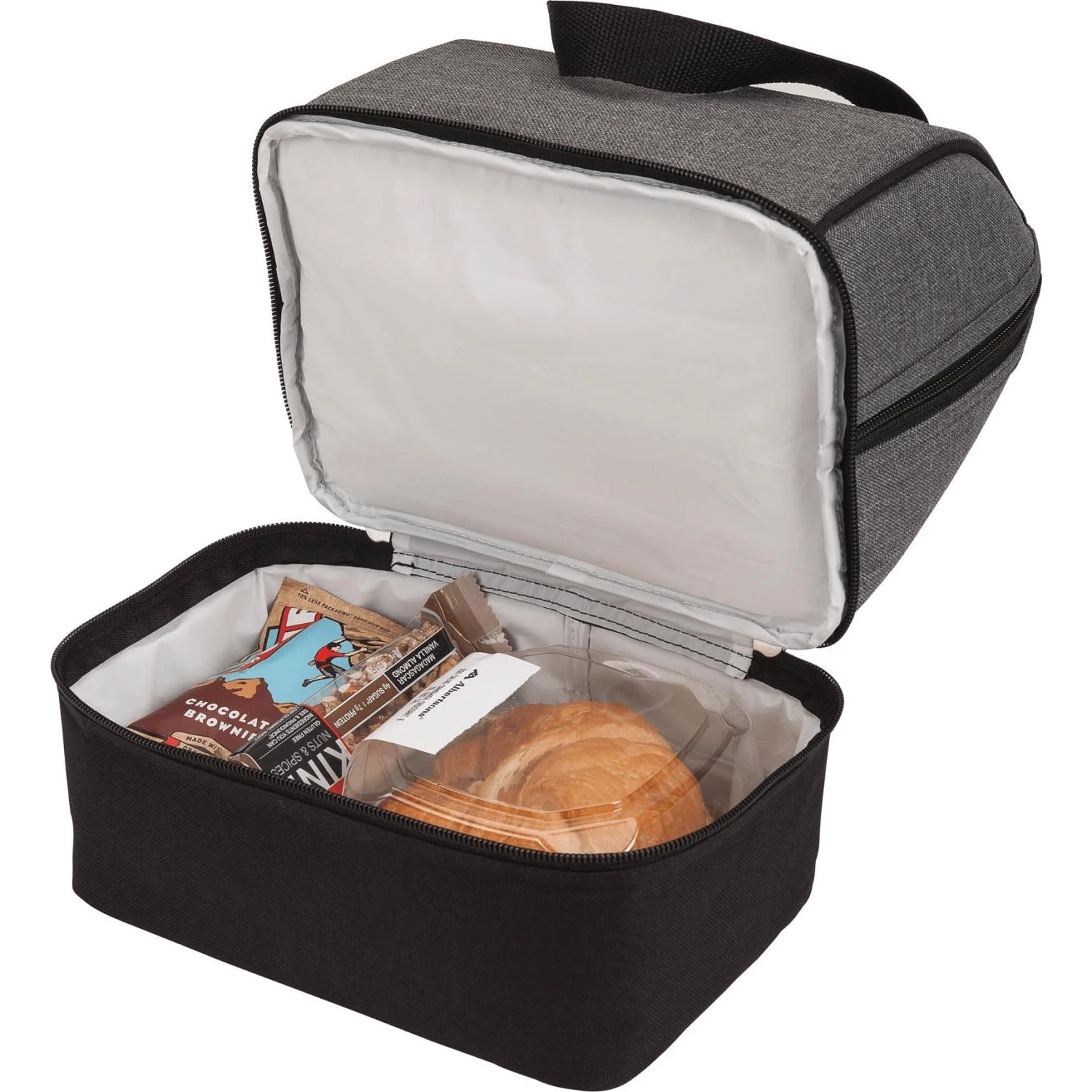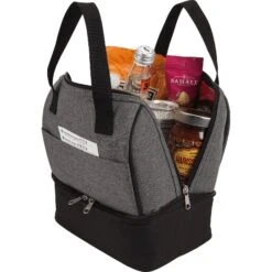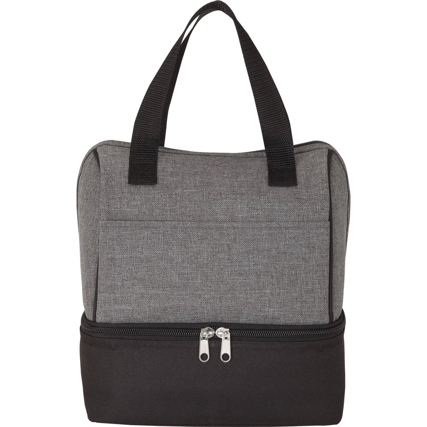 The Canyons Lunch Sack and Cooler is perfect for keeping your food, snacks, and drink cool on a hot day. Made from durable 600D polyester with a two-tone grey denim finish on top and black base and trim. It features separate upper and lower insulated zippered compartments with PEVA lining and padded foam insulation. Six can capacity in upper cooler compartment. It also has a front pocket and carry handles.