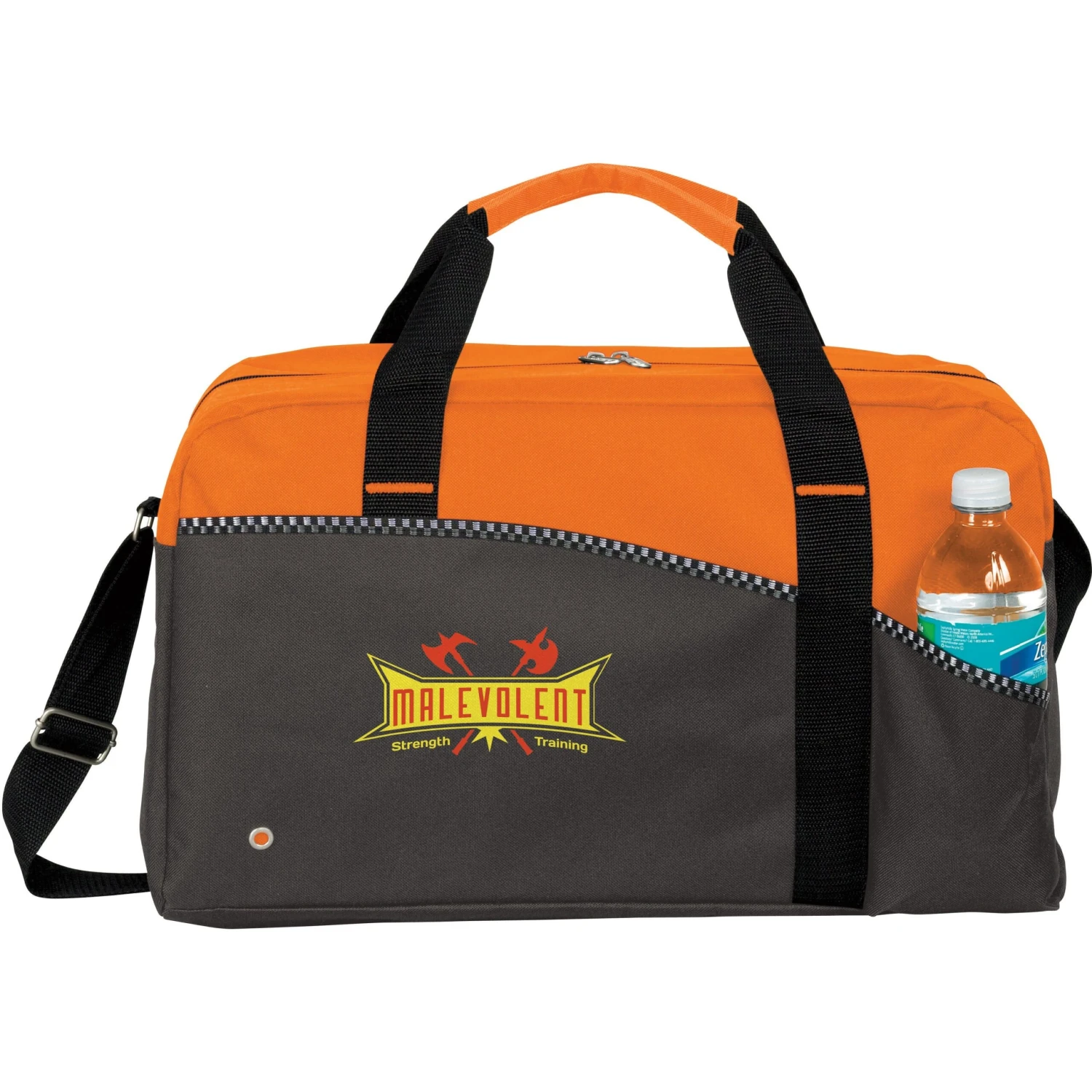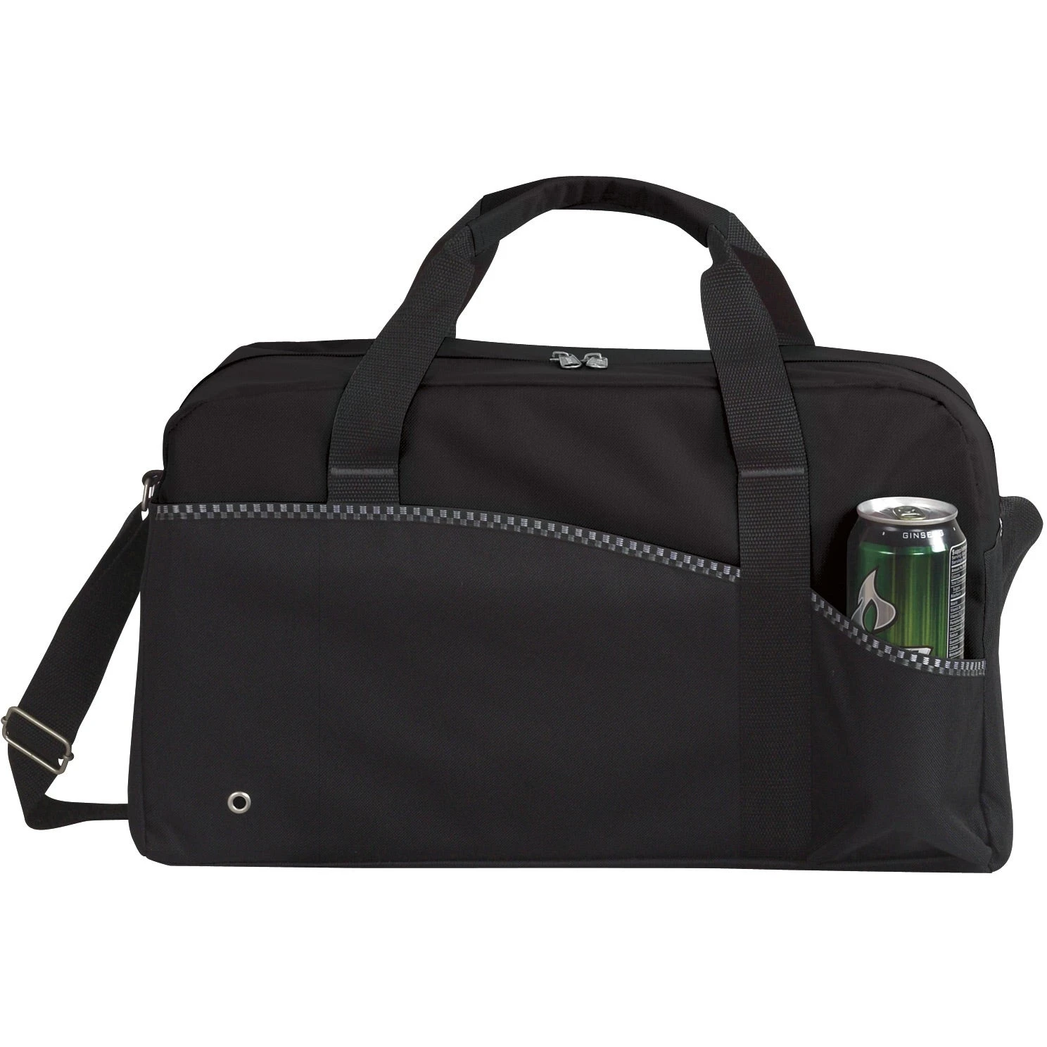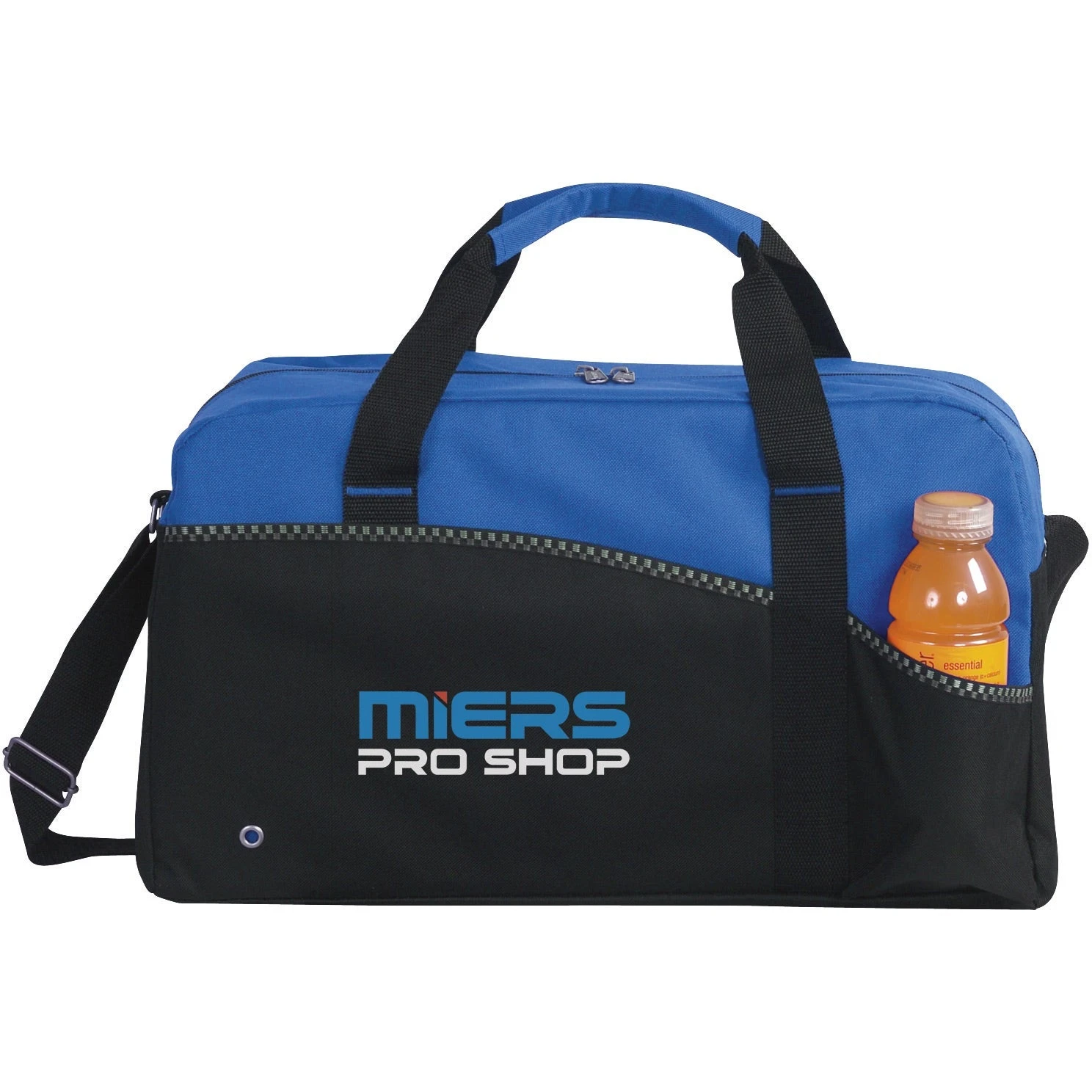 These terrific, versatile bags are great for sports as well as for travel and feature fabric wrapped handle grips, a comfortable adjustable shoulder strap, full front slip pocket, and a front water bottle pocket. In other words, our custom Center Court Duffels are just what your clients need to carry all their favorite belongings all over town!
