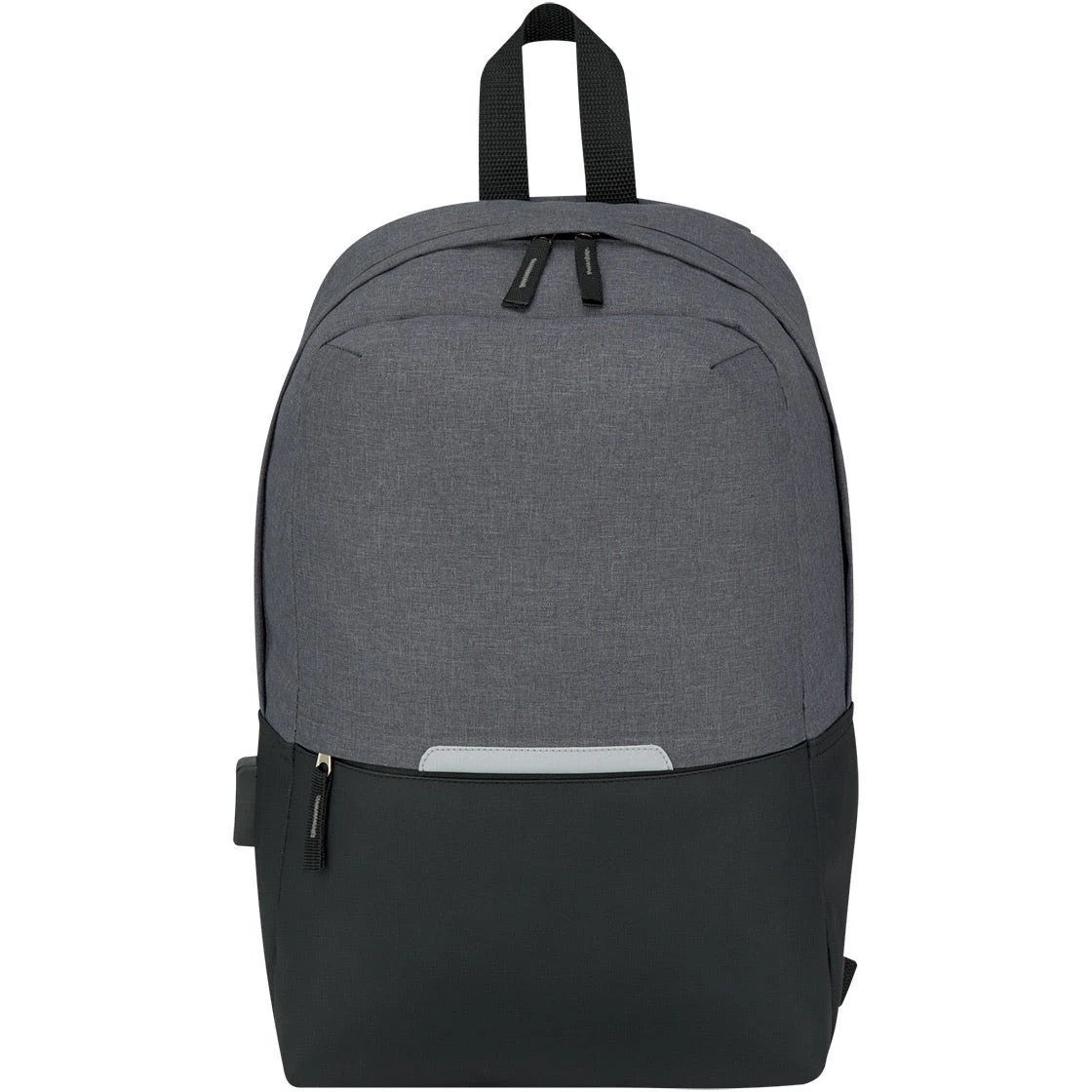 Made of 600D polyester. Adjustable padded shoulder straps and web carrying handle. Front and back zippered pockets. Inside zippered pocket, larger pocket and padded laptop pocket. Features 39″ USB cord inside with outside charging port for easy charging access. Double zippered main compartment with padded back. Reflective accent on front. Accommodates most laptops up to 15″. Spot clean/air dry. Power bank not included.