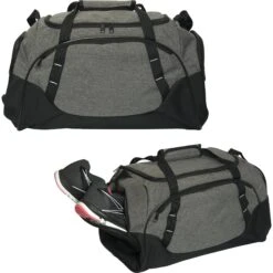 600D polyester with two-toned polyester. Full-length outside zippered pocket with inside key clip. Business organizer inside pocket. Section for mp3, iPod or cell phone complete with grommet hole for headphone wires. iPod is a registered trademark of Apple, Inc.