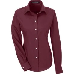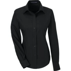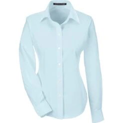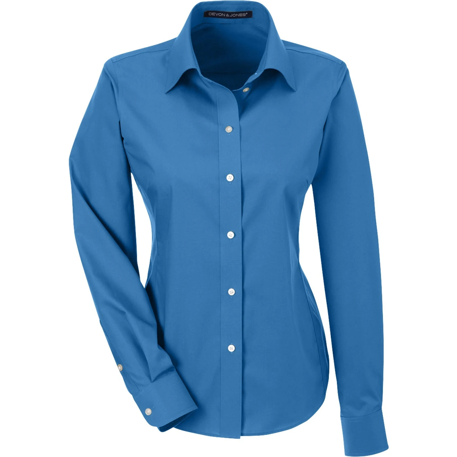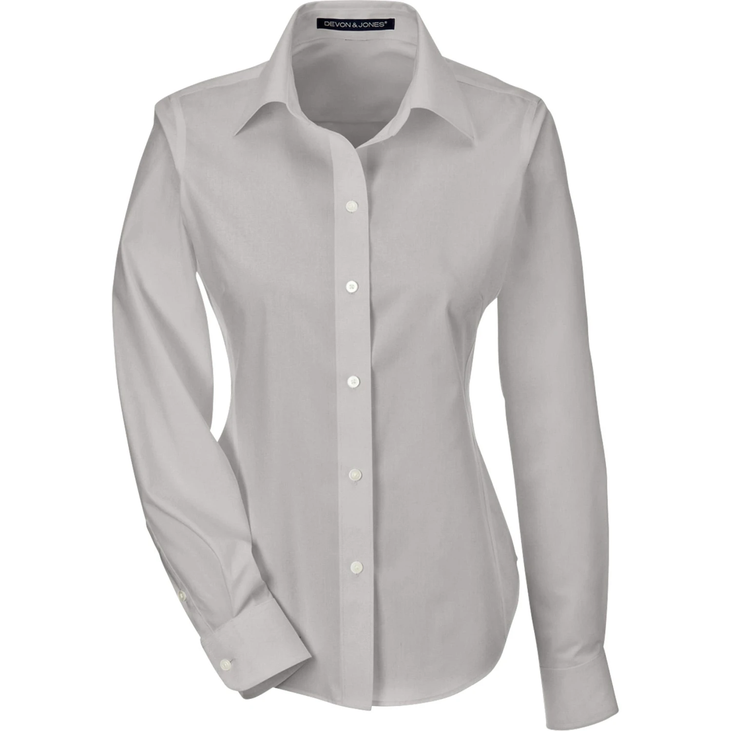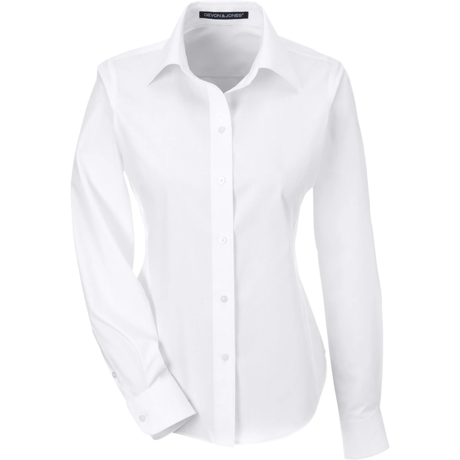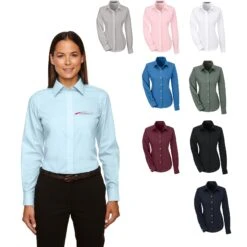 Ladies cut woven shirt made of 55% cotton (3.4 oz.) and 45% polyester broadcloth with stain release finish. Fine yarn count shirting. True non-iron performance straight from the dryer. Pearlized buttons. Patented pucker-free taped seams. Specially fused collar, cuffs and placket. Split back seam with bias cut back yoke. Straight collar. Front and back princess seams and bust darts for a feminine fit.