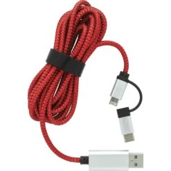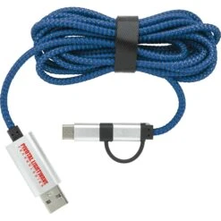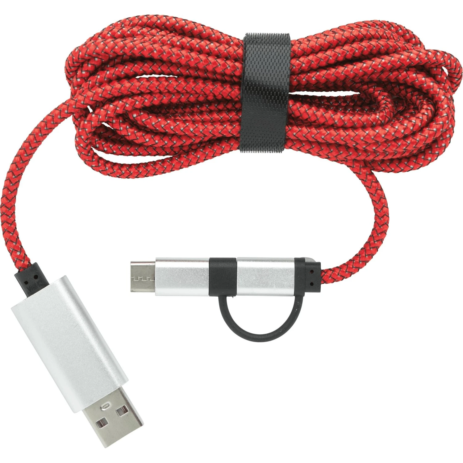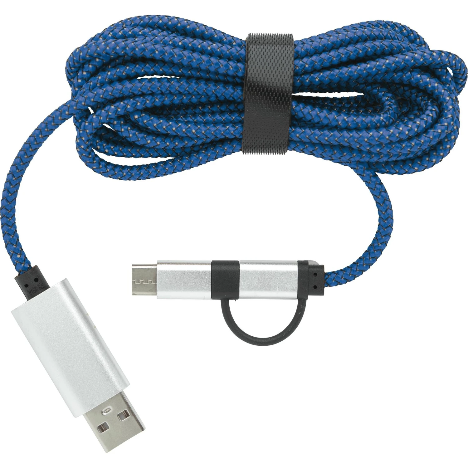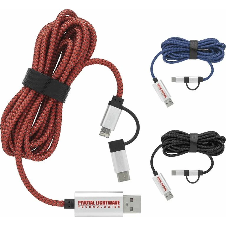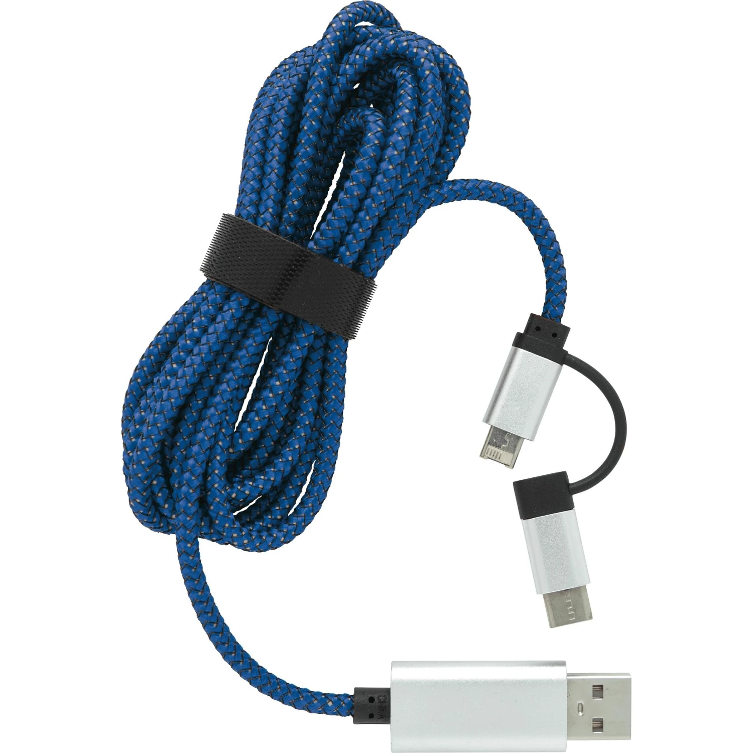 This dual charging cable is long enough to stretch to that hard-to-reach outlet. You can duck it, tuck it, hide it, or ride with it. It also has a strap to help keep it together when not in use. Compatible with Apple 8-Pin, Micro-USB, and USB type C devices. Cable measures 8 feet, giving you ample length to find your nearest plug. Attached hook and loop to roll and store the cable easily. Durable braided rope will last the test of time.