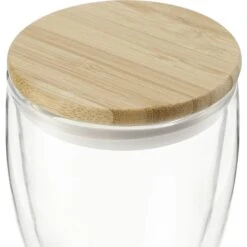 The Easton Glass Cup with Bamboo Lid (12 Oz.) features double-wall glass construction that lets you enjoy your favorite beverages without condensation forming on the outside of the cup. The push-on lid helps prevent spills and is made from FSC-certified bamboo. Recommended hand wash only. Keep bamboo lid dry when not in use. This cup is not dishwasher- or microwave-safe.