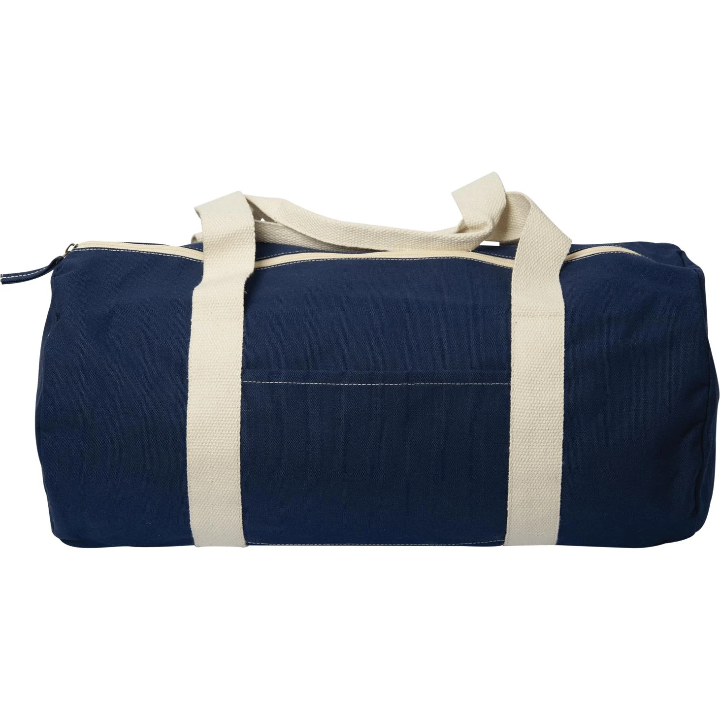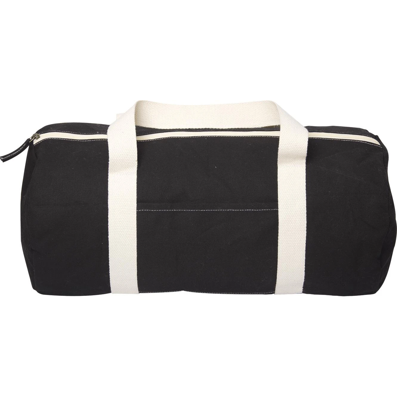 12 oz. cotton. Front open slash pocket. Natural webbed carry handles. Natural colored zipper. Barrel shaped with one main compartment. Old school design for a classic look. The timeless design will never go out of style.