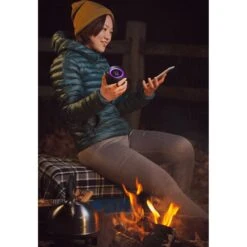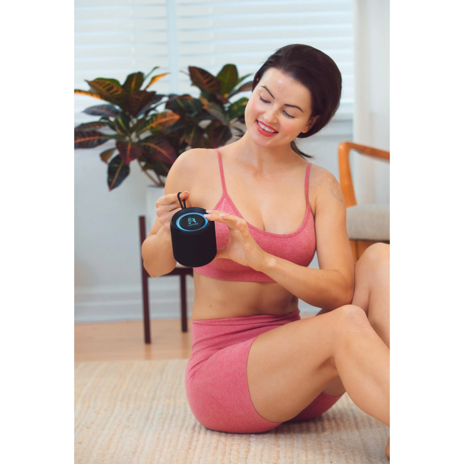 5W waterproof wireless speaker with seven color changing LED lights. IPX6 waterproof protects against water splashes from all directions. Not protected from submersion in water. Playing time up to 4 hours at max volume. Charging time 2 hours. Connection range up to 33 feet. Includes carabiner and USB Type-C charging cable. FCC certified.
