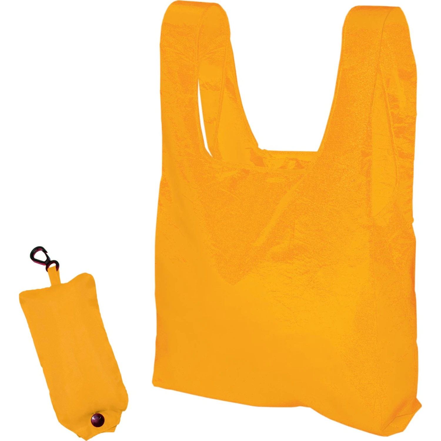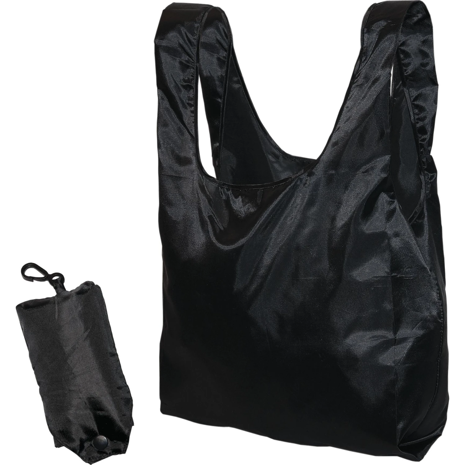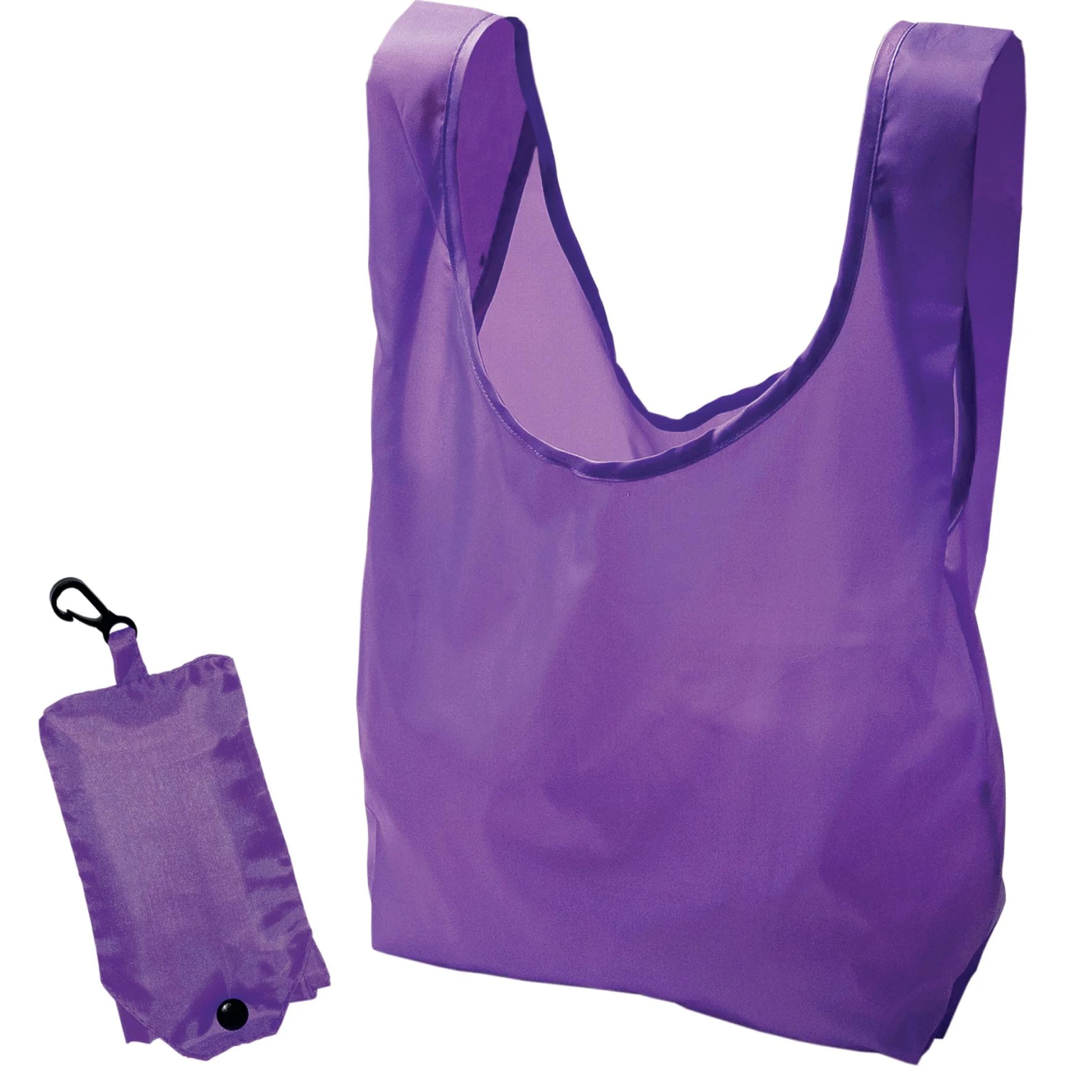 Lightweight 190T polyester. Folds into a separate pouch. Pouch has snap closure and plastic clip to attach to bag or purse. Stylish, lightweight, and reusable. Great trade show giveaway. Bags shipped open (not folded).