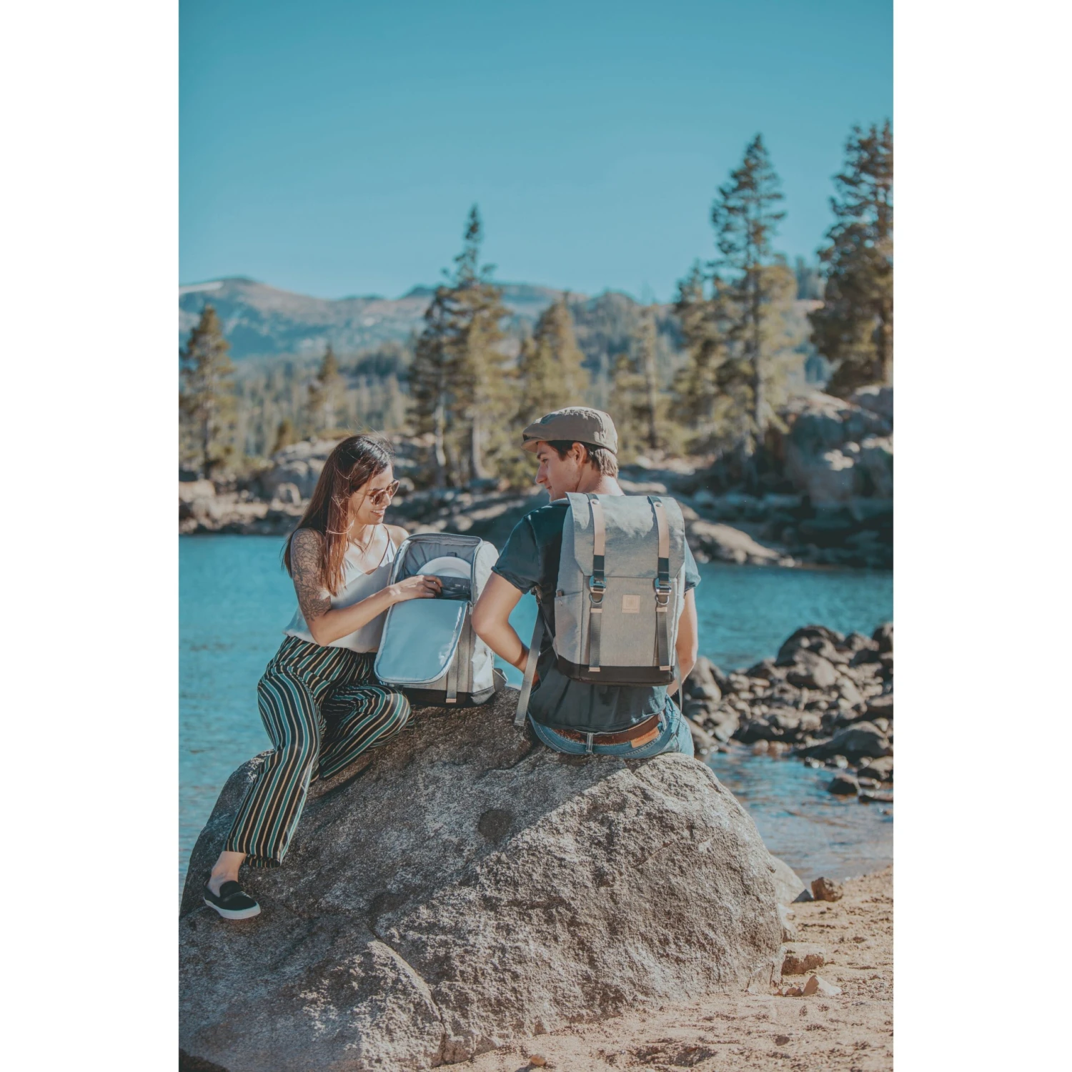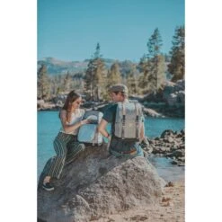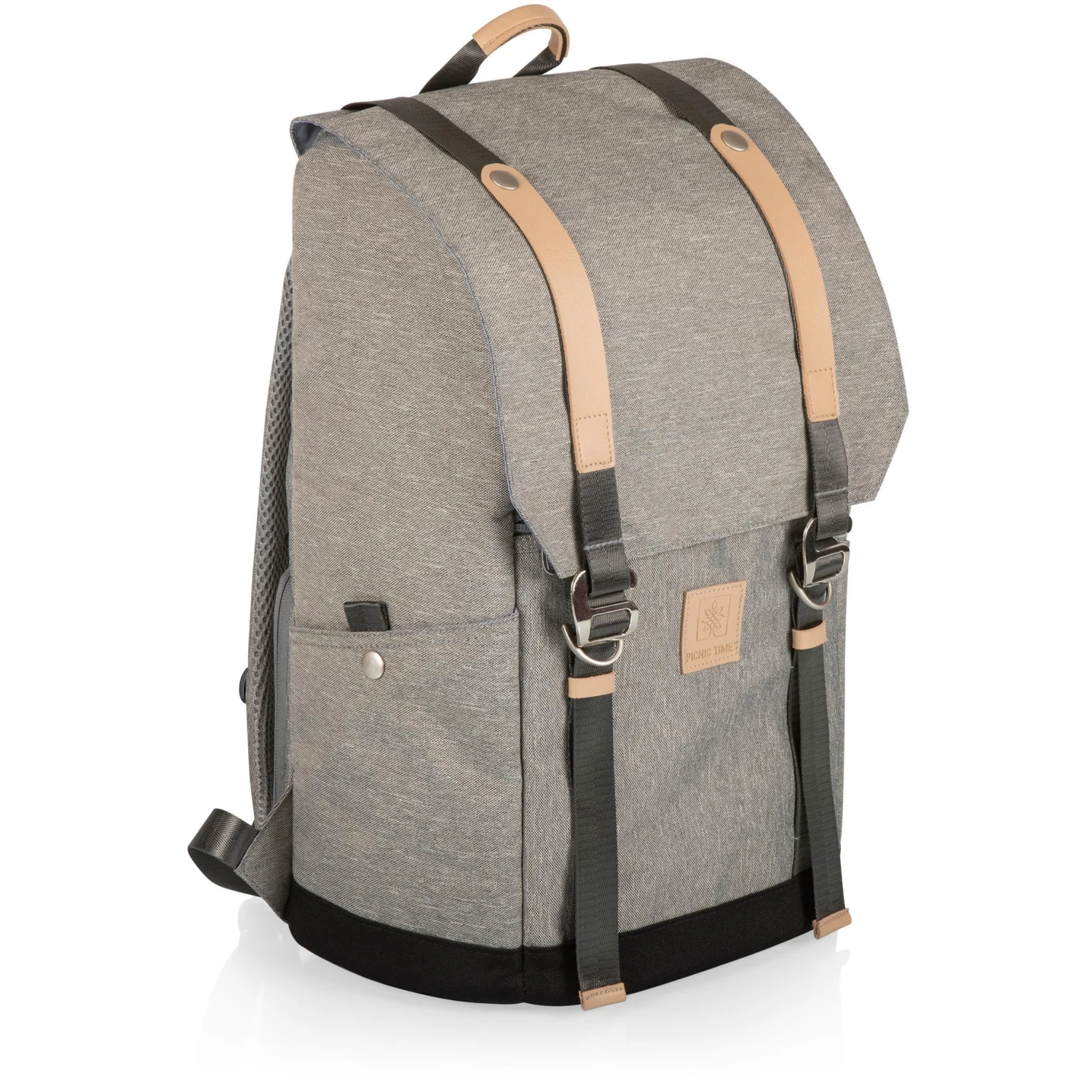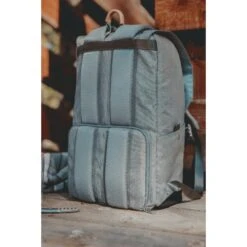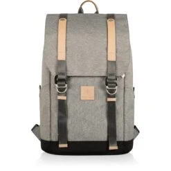 Two-tiered backpack with adjustable padded straps. Heat-sealed cooler on bottom and dry compartment on top. Adjustable front straps for additional storage. Two water and wine pockets on each side. Back-of-the-bag cooler access with a convenient fold out design. Includes the following: