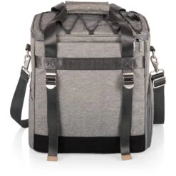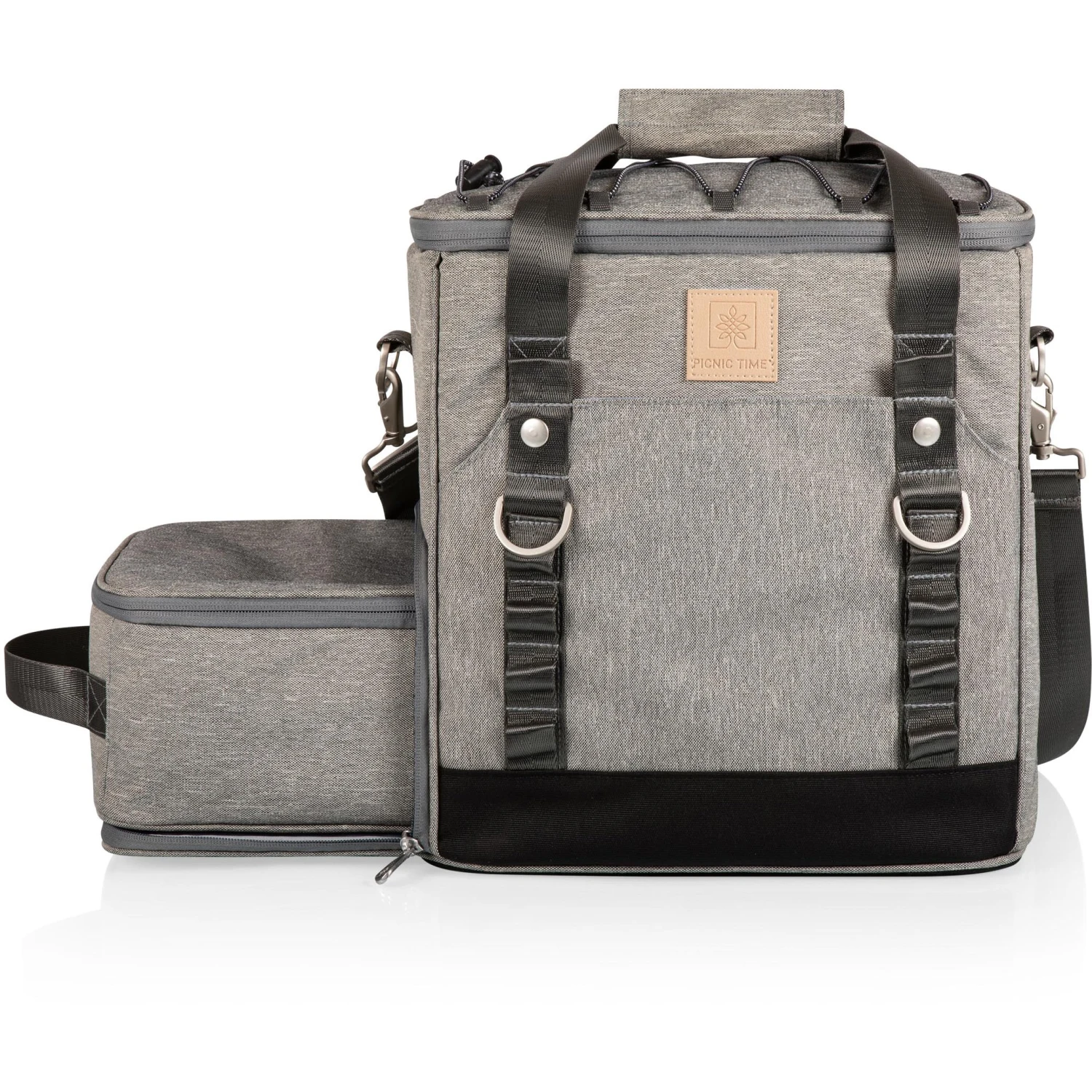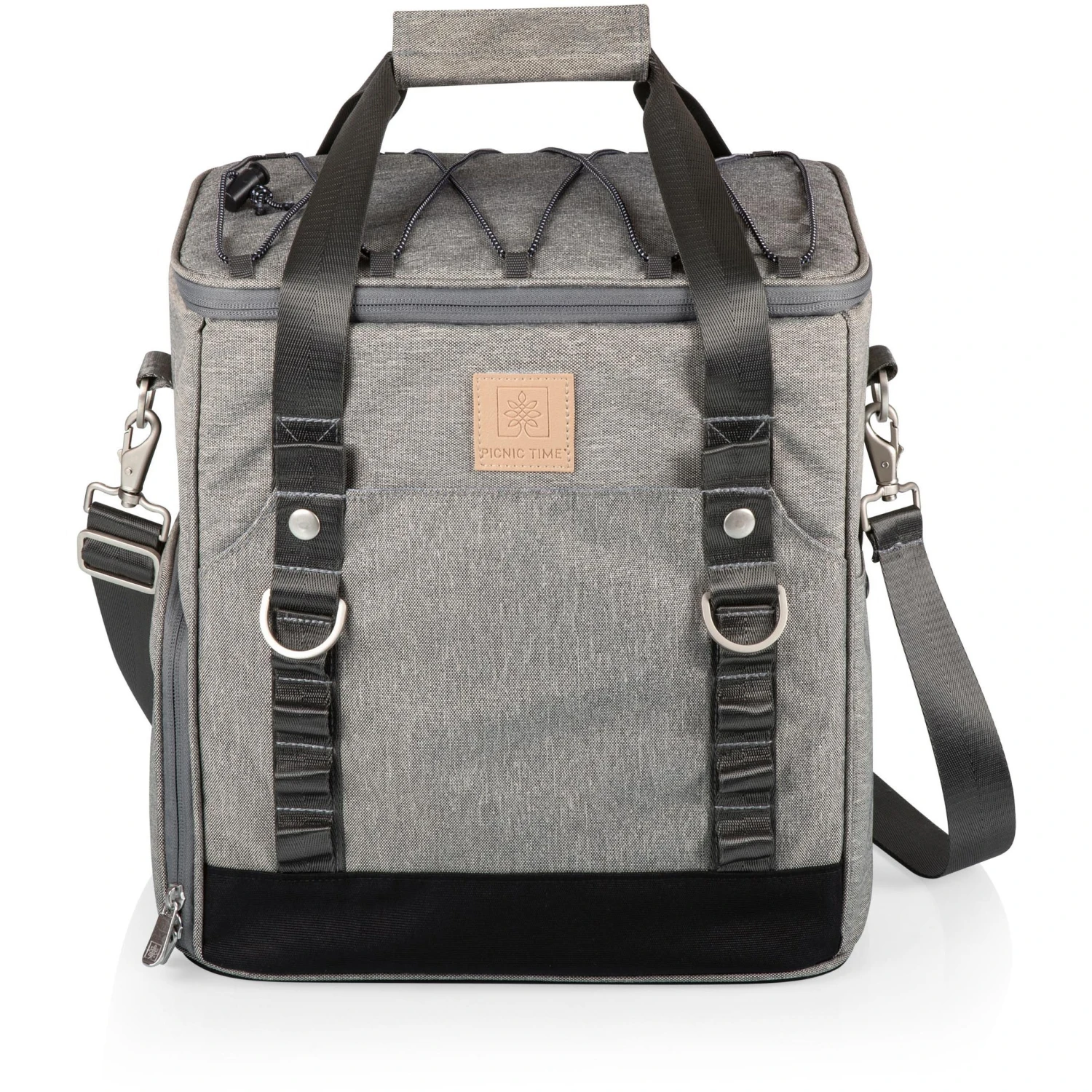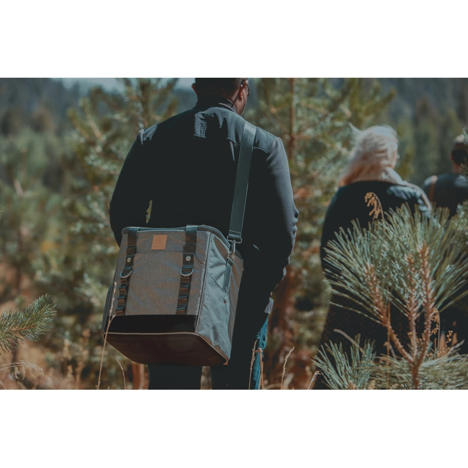Two-tiered shoulder bag with adjustable straps on back for extra storage. Stretch cord on top secures a jacket, blanket or towel. Removable heat-sealed cooler. Water and wine pocket on side. Includes the following: