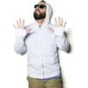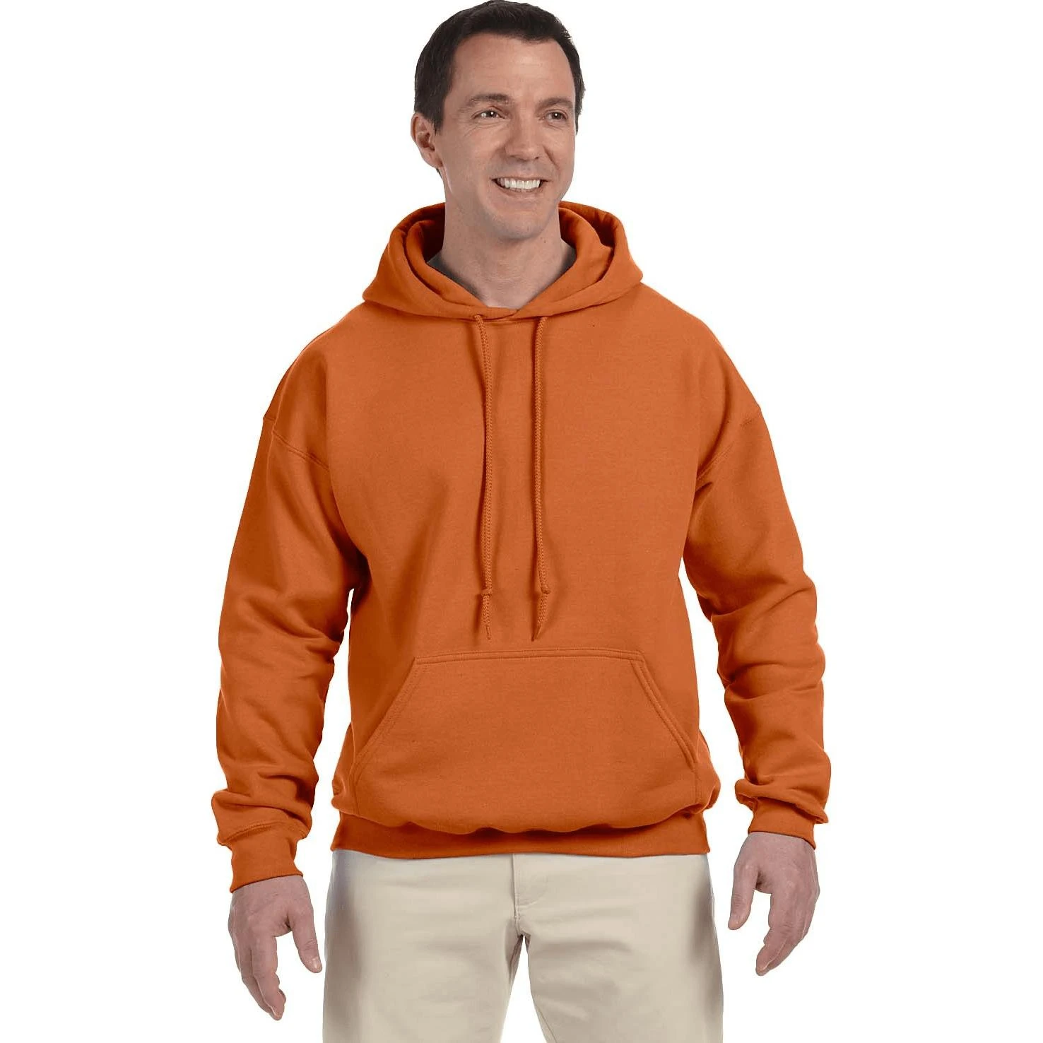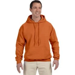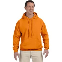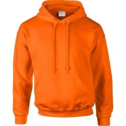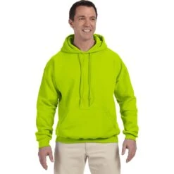 50% cotton, 50% polyester. DryBlend wicking performance. Safety colors (green and orange) are ANSI/ISEA 107 High Visibility Standards compliant. Fully cover seamed. Pill-resistant air jet yarn. Double-lined hood with matching drawstring. Transitioning to a gray tearaway label. Double-needle stitched pouch pocket. 1×1 spandex ribbed cuffs and waistband.