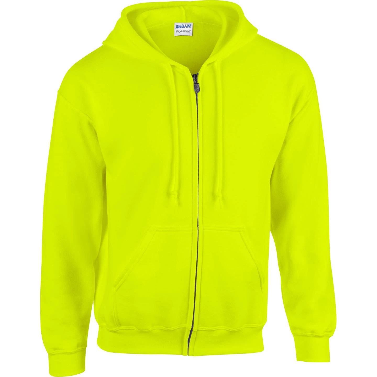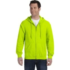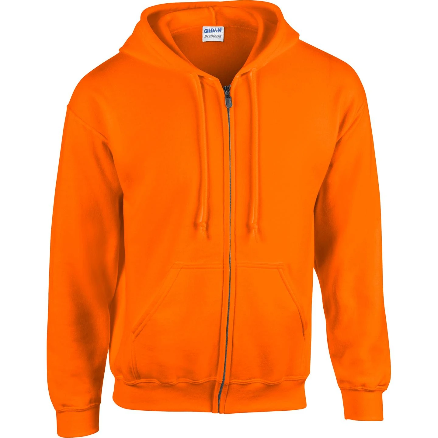 50% cotton, 50% polyester. Pill-resistant air jet yarn. Unlined hood. Set-in sleeves. Pouch pockets. Hood with matching drawstring. Metal zipper. 1×1 ribbed cuffs and waistband with spandex; double-needle stitching throughout. Safety Orange color is compliant with ANSI – ISEA 107 High Visibility Standards.