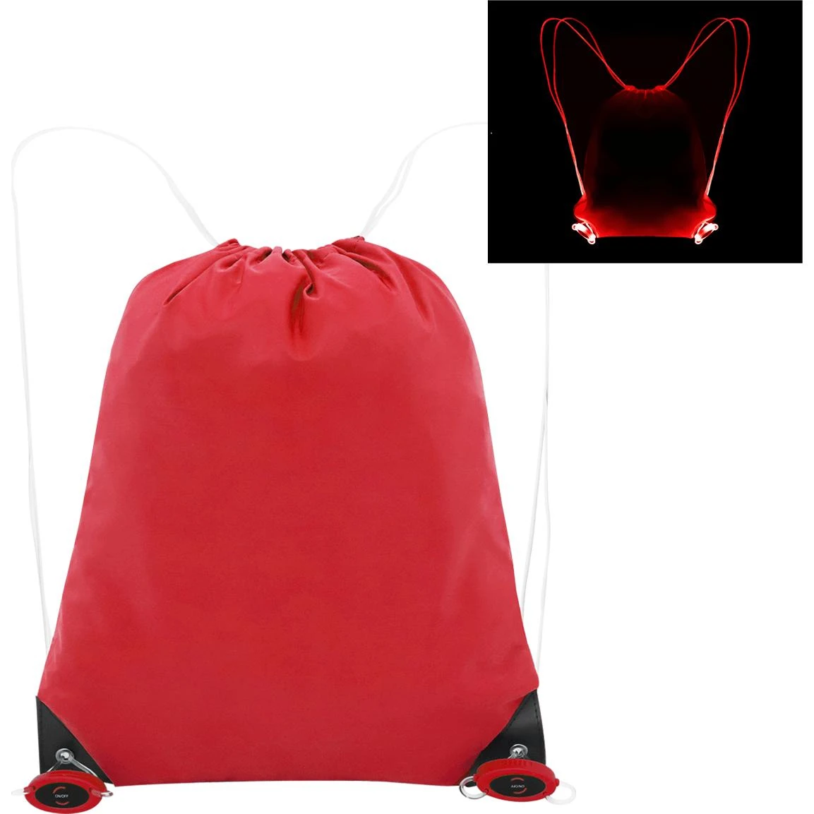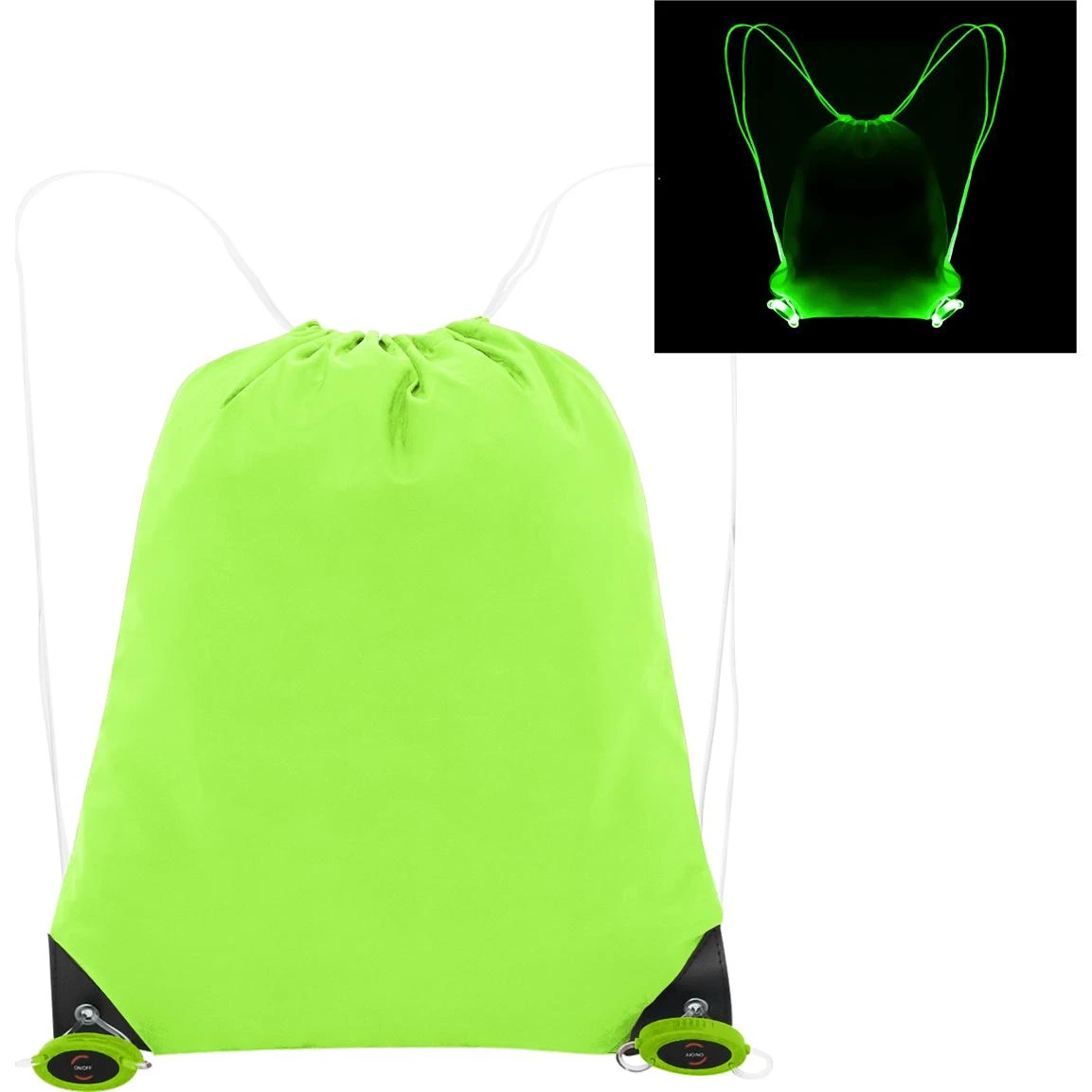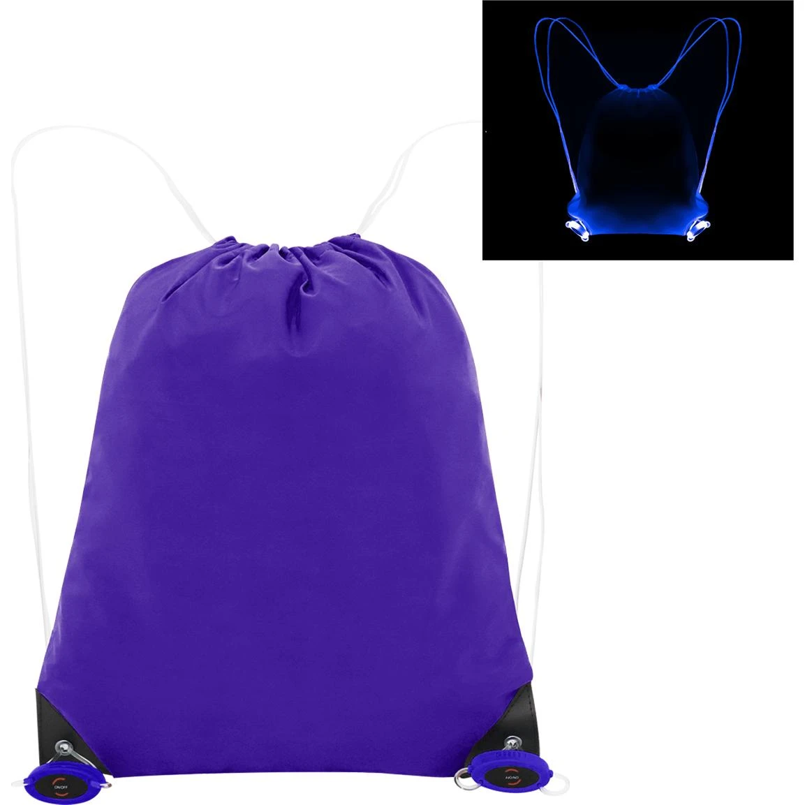 Made of 210D polyester. Drawstring closure. LED lights illuminate drawstring straps when turned on. On/off switch with replaceable button cell battery included. Spot clean and air dry.