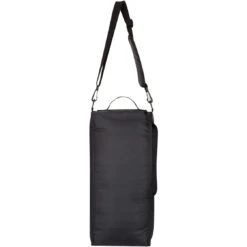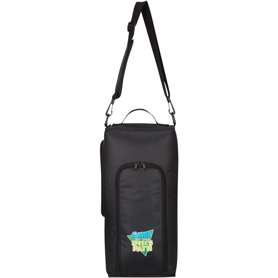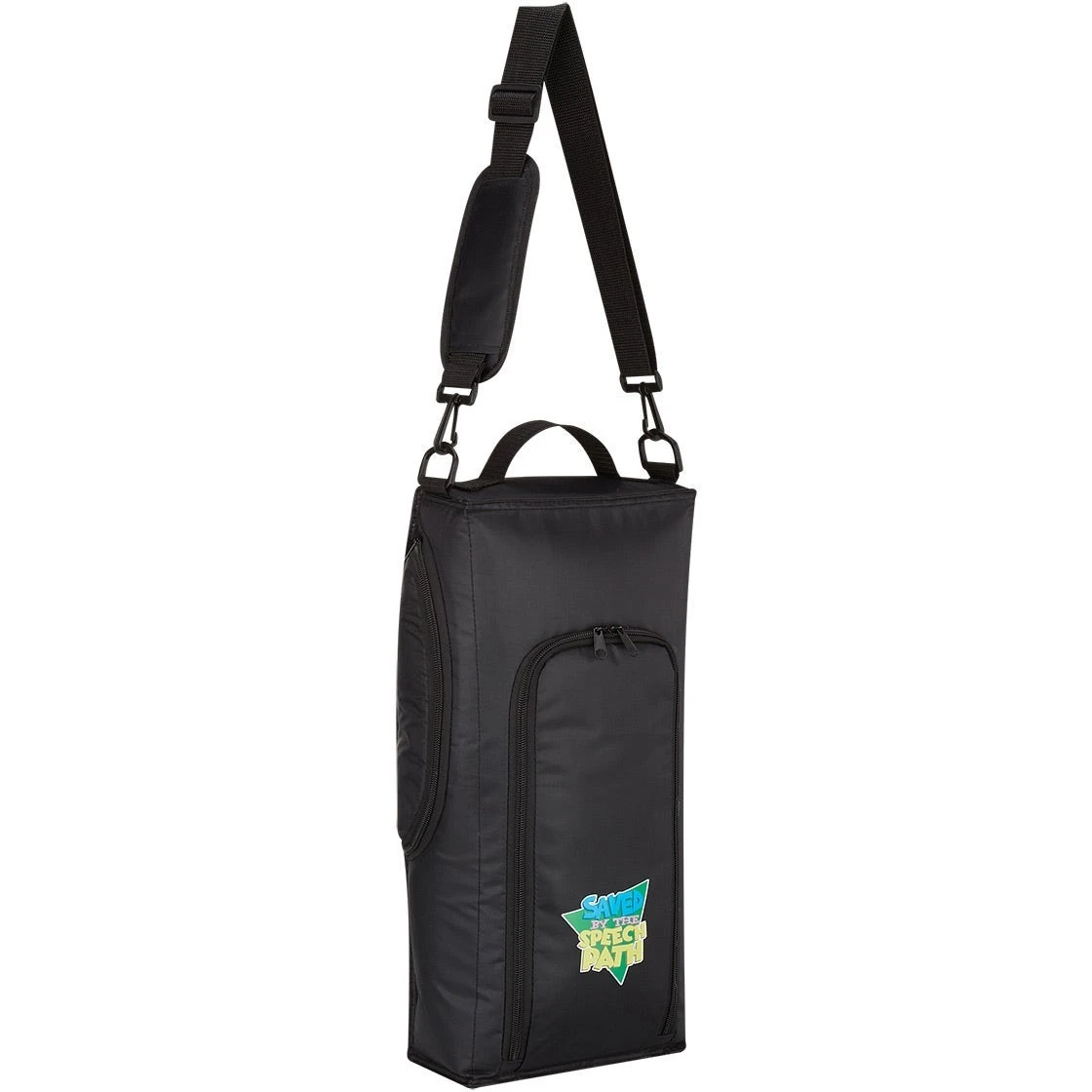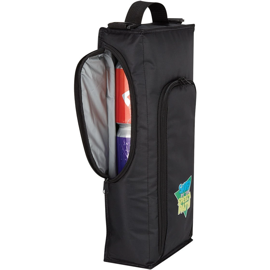Made of 420D polyester. PEVA lining. Detachable and adjustable padded shoulder strap and web carrying handle. Side zippered main compartment for easy access. Front double zippered pocket. Reusable ice pack included. Holds up to 9 cans. Spot clean and air dry only.