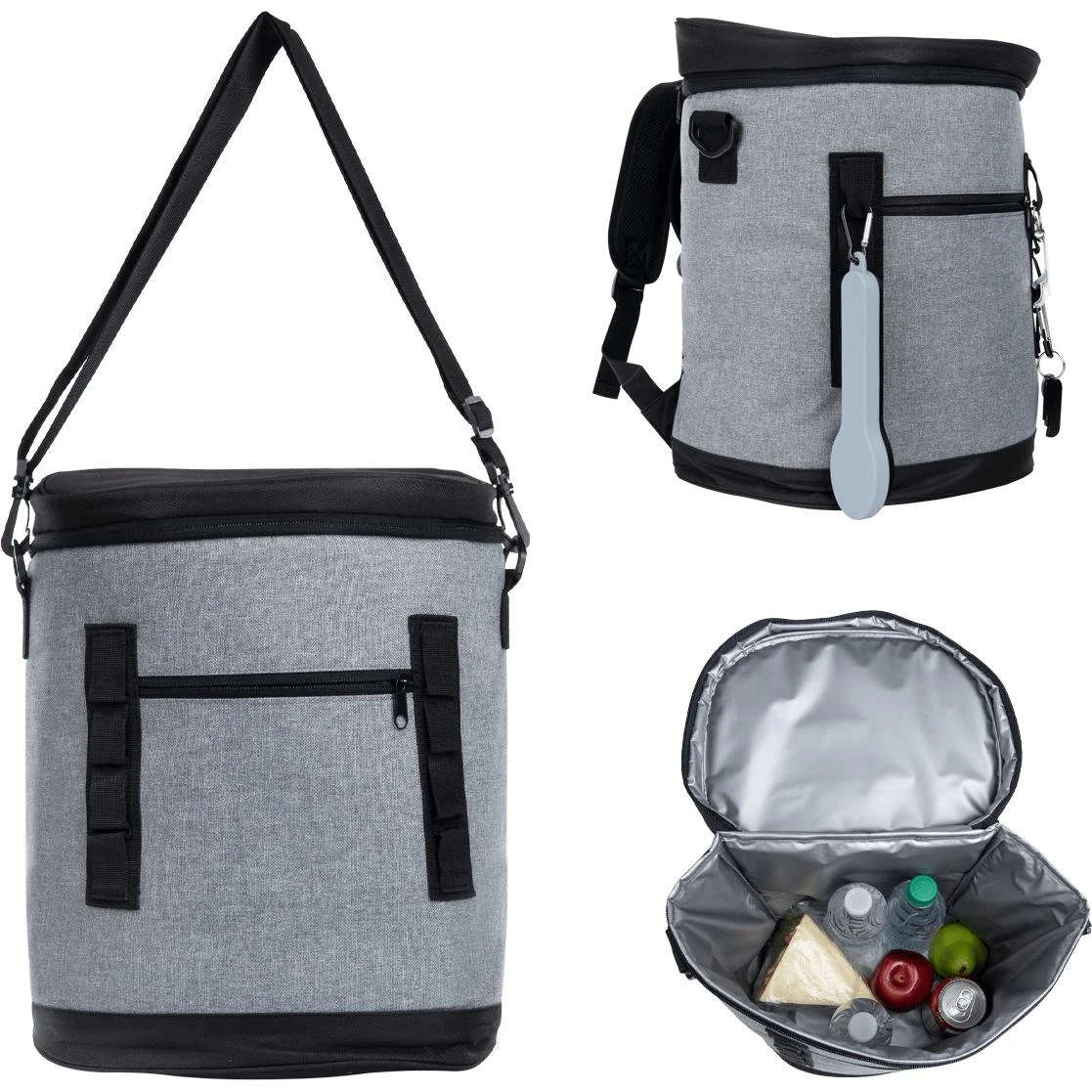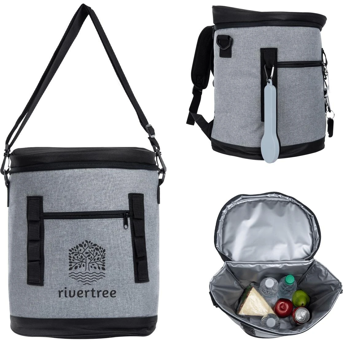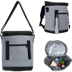 Made of heathered 600D polyester. Grey PEVA lining. Padded back and adjustable, padded backpack straps. Adjustable shoulder strap. Double zippered main compartment. Front zippered pocket. Two daisy chains for attaching extra gear. Holds up to 20 cans. Spot clean and air dry.
