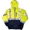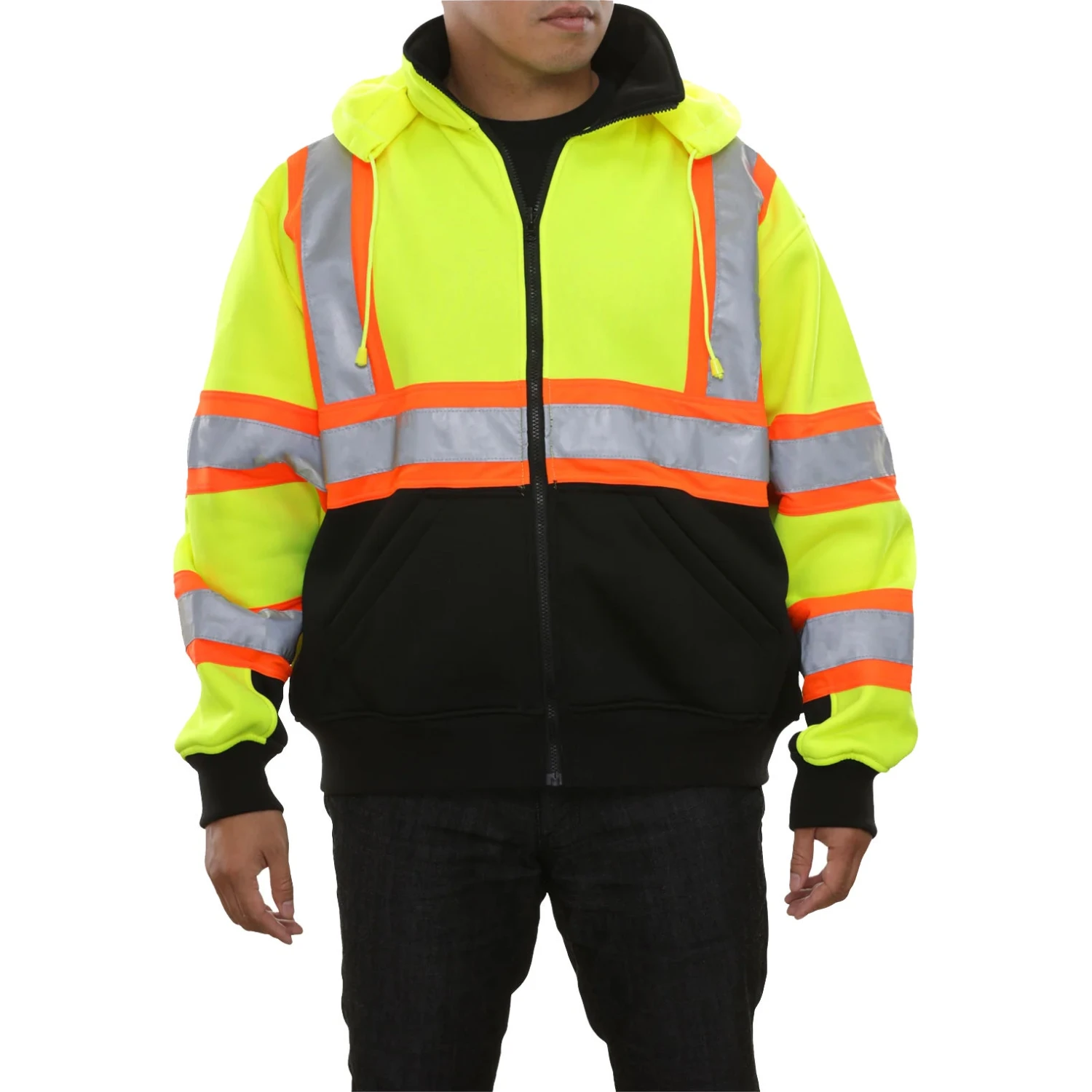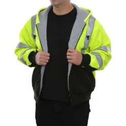 The high visibility ANSI III compliant sweatshirts are 100% spun polyester microfiber fleece. 2-tone safety lime fluorescent and black, weighing in at 10.5 oz. The zip-hooded style has metal snaps so the hood can safely detach if snagged. It features a rugged YKK zipper, two pouch pockets for warming hands-on chilly mornings, and reflective material. You may wear the sweatshirt alone or zip it into the lining of the 431 parka to form a waterproof systems jacket. 2″ retro reflective tape with 360-degree reflective coverage. Reflective material is certified to meet ANSI/ISEA 107-2020 clause 9.1 and 9.2 for coefficient of retroreflection. California Prop 65 compliant.