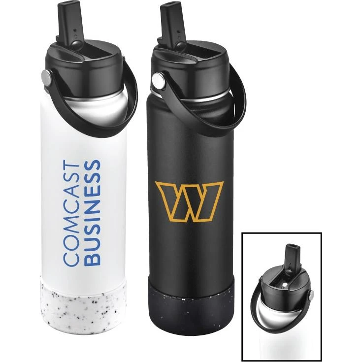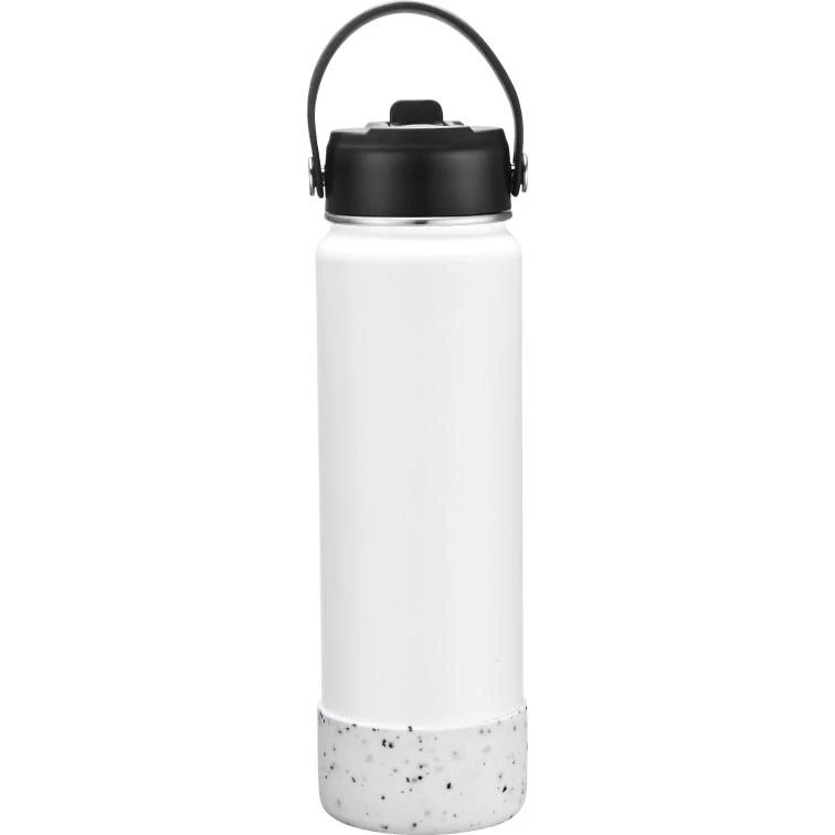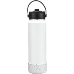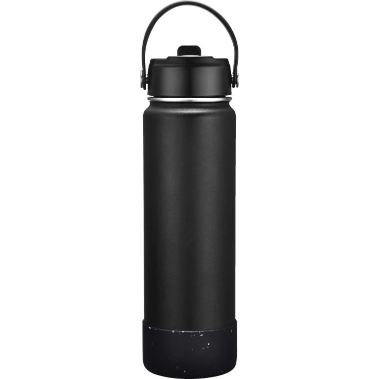 27 oz. wide mouth double walled vacuum insulated stainless steel water bottle that will keeps your drink icy cold or super-hot all day or night. Powder coated finish with removable screw-on leak resistant sipper lid with straw and built in hook loop. Features a matching removable silicone grip base BPA free.