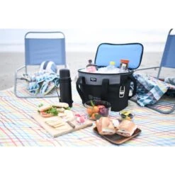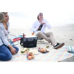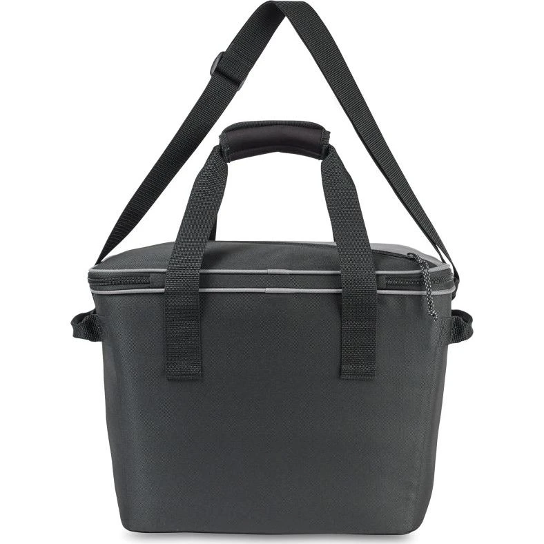 Leak resistant, antimicrobial liner that’s easy to clean. Dual zippered opening to large main compartment. Dual side grab handles for easy carrying when fully loaded. Carabiner bottle opener conveniently attached for on-the-go use. Front and top zippered pockets for additional storage. Dual carry handles with padded handle wrap. Adjustable shoulder strap. EPPE heat-sealed lining. PVC free. Phthalate free. 32 can capacity.