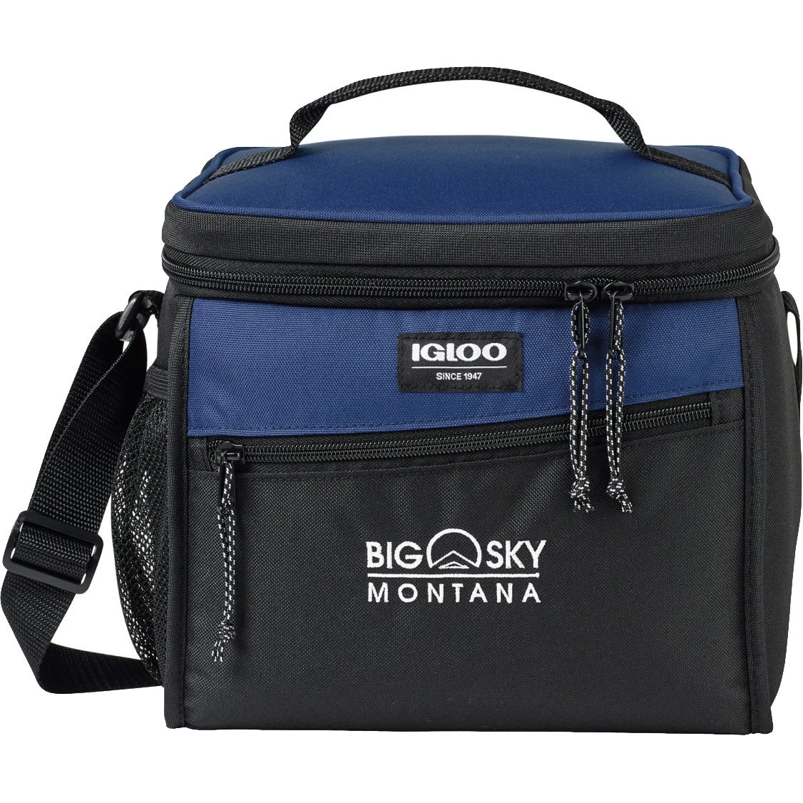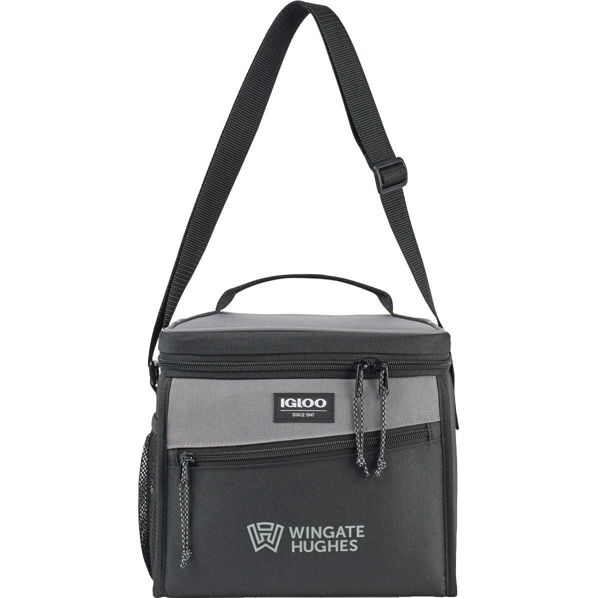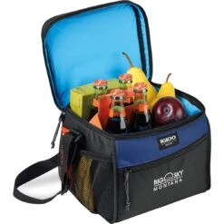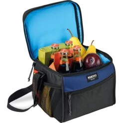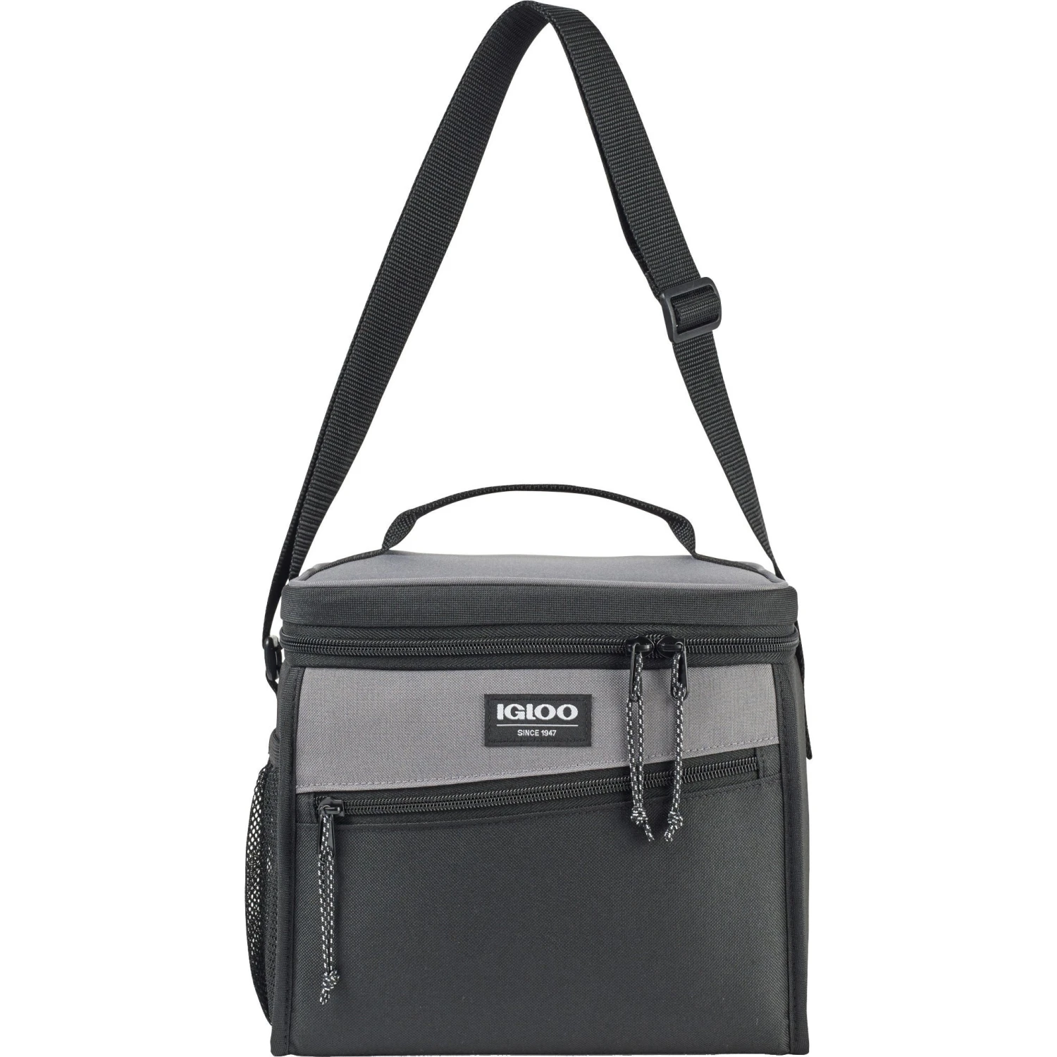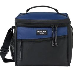 Box cooler with 14 can capacity, dual zipper opening, side mesh pocket, top handle, and strap. Dual zippered opening to main compartment. Leak resistant, antimicrobial liner that’s easy to clean. Side mesh pocket for water bottle and other belongings. Front zippered pocket for additional storage. Adjustable shoulder strap. Top grab handle. PVC free. Phthalate free. Comfortably fits one Igloo large ice block. Ice blocks sold separately.