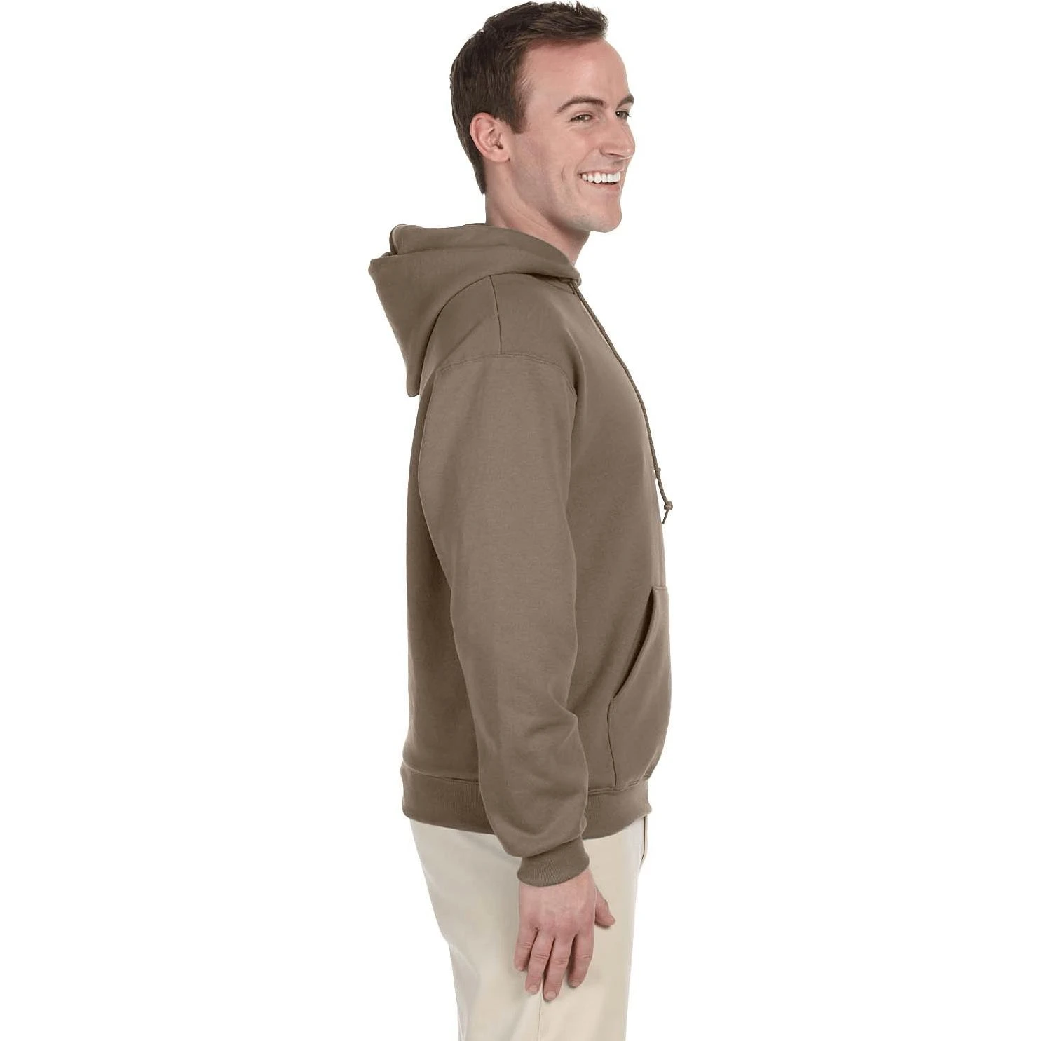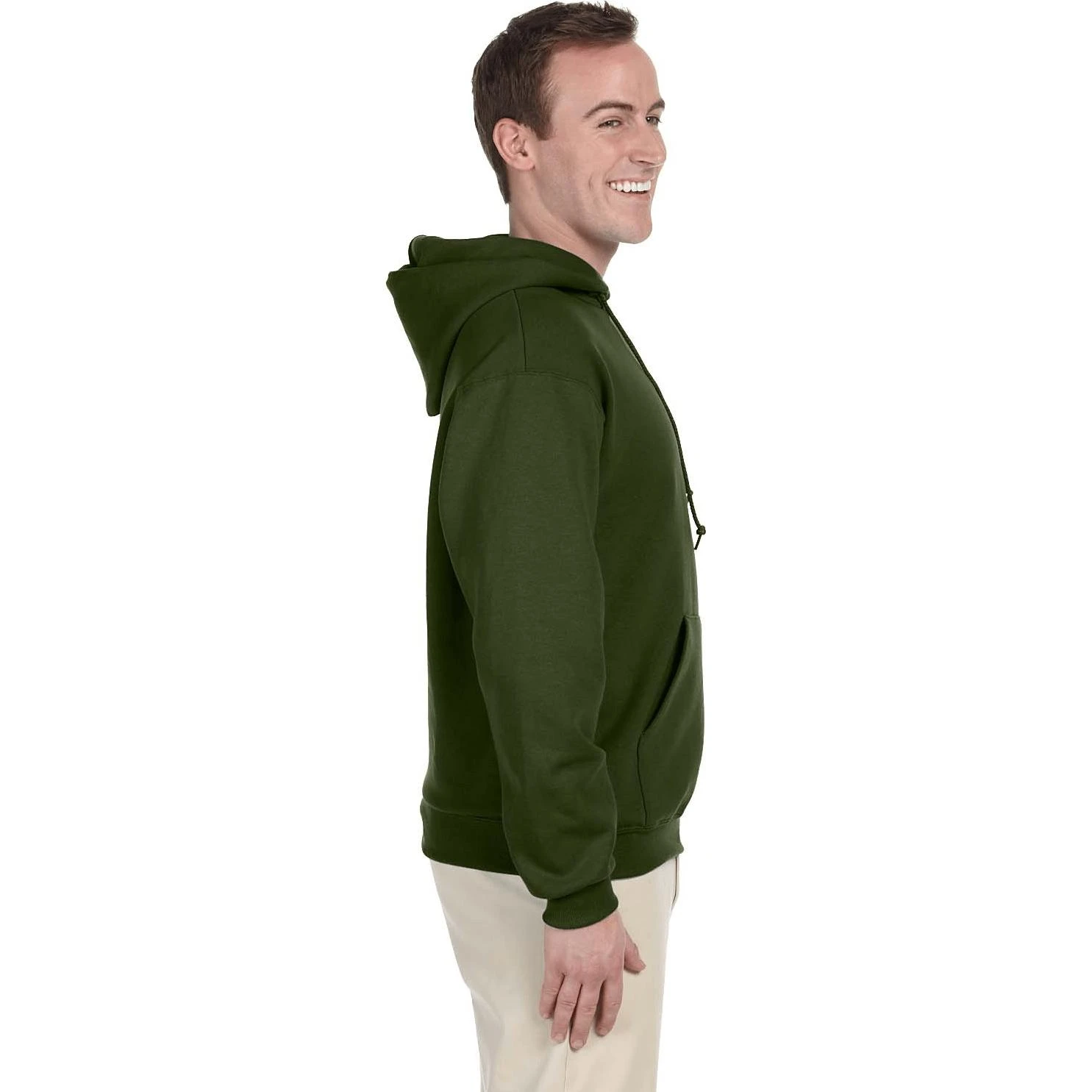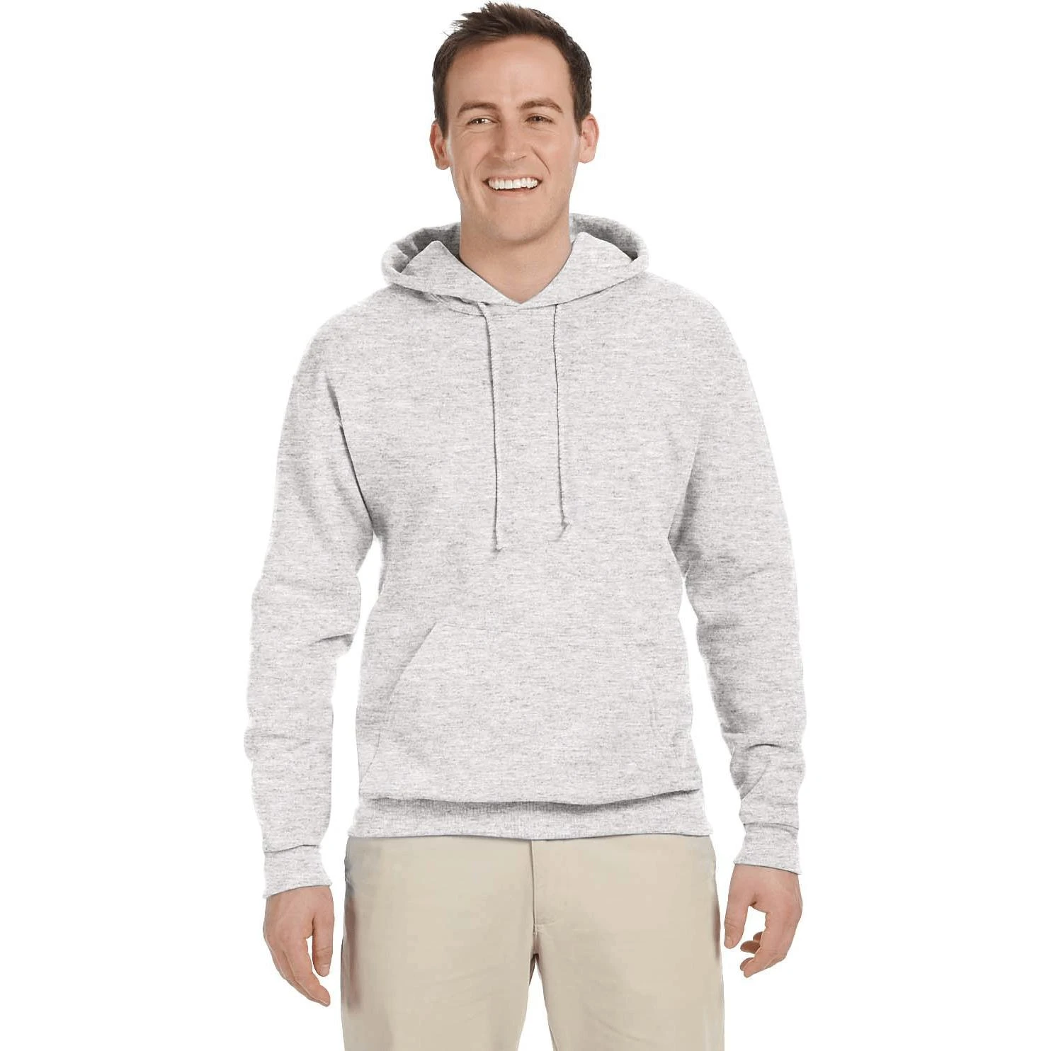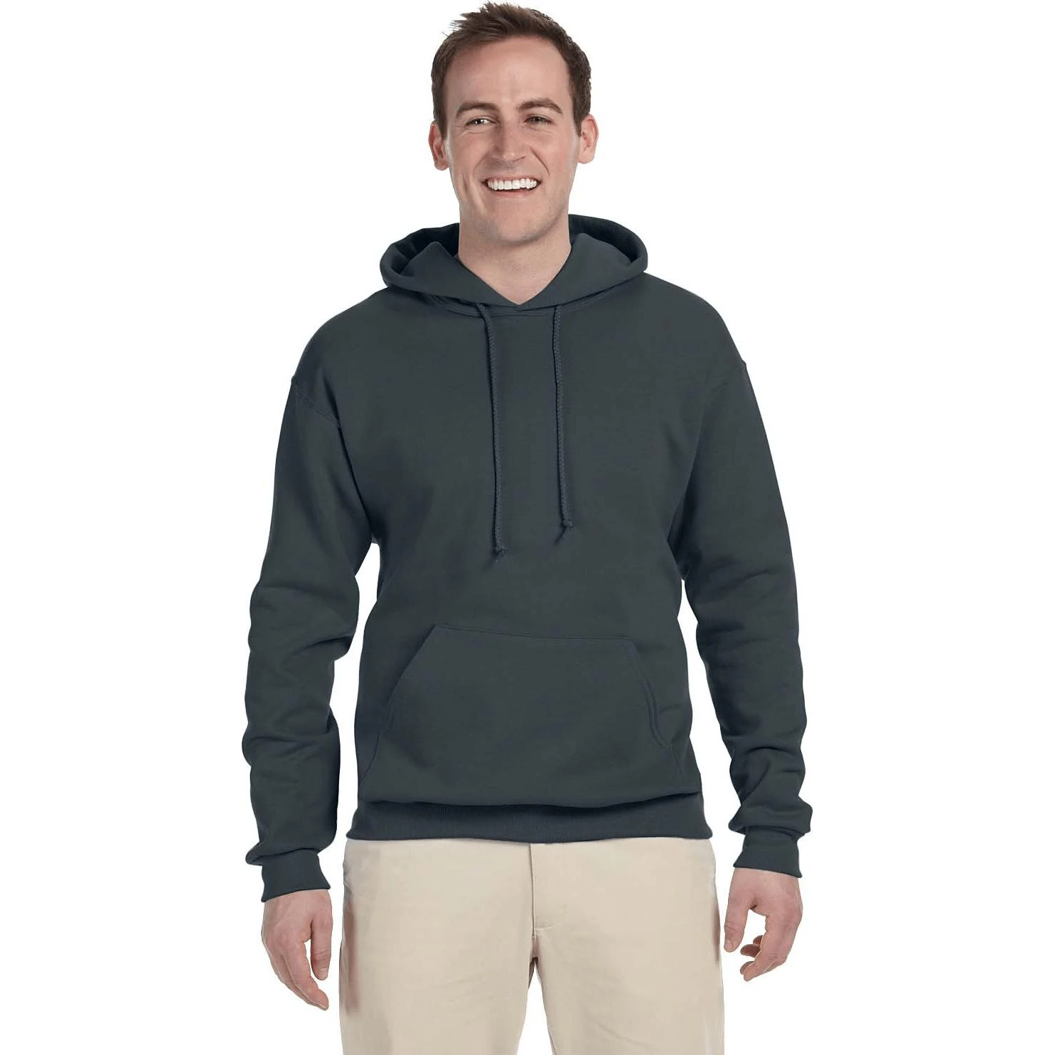 50% cotton, 50% polyester (Oxford color is 49% cotton, 51% polyester). Double-needle cover-seaming on neck, armholes and waistband. Seamless body with set-in sleeves. Virtually pill free. 1×1 ribbed cuffs and waistband. Concealed seam on cuffs. Pouch pocket. Double-ply hood with grommets and matching drawcord.