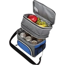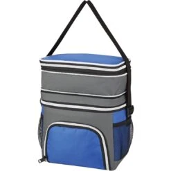 Made of a combo of 600D polyester and polyester jacquard. PEVA lining and adjustable shoulder strap. Zippered upper and lower compartments and expansion zipper that provides 2″ of additional space in the upper compartment. Front zippered pocket and 2 side mesh pockets. Holds up to 6 cans of your favorite beverage. Spot clean and air dry.