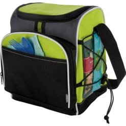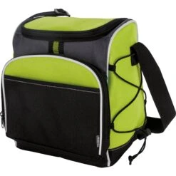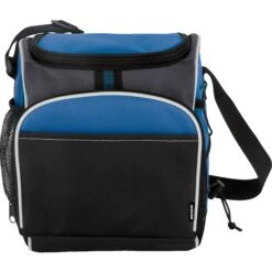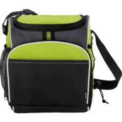 This cooler bag includes a unique bungee cord feature, convenient for those extra items on long road trips or days outside! Features main zipper compartment with U-shaped closure, front zippered pocket and front slip pocket, exterior bungee cord feature to hold additional items, side mesh pocket, and an adjustable shoulder strap. Heat-sealed PEVA liner. Keeps cool with ice packs.
