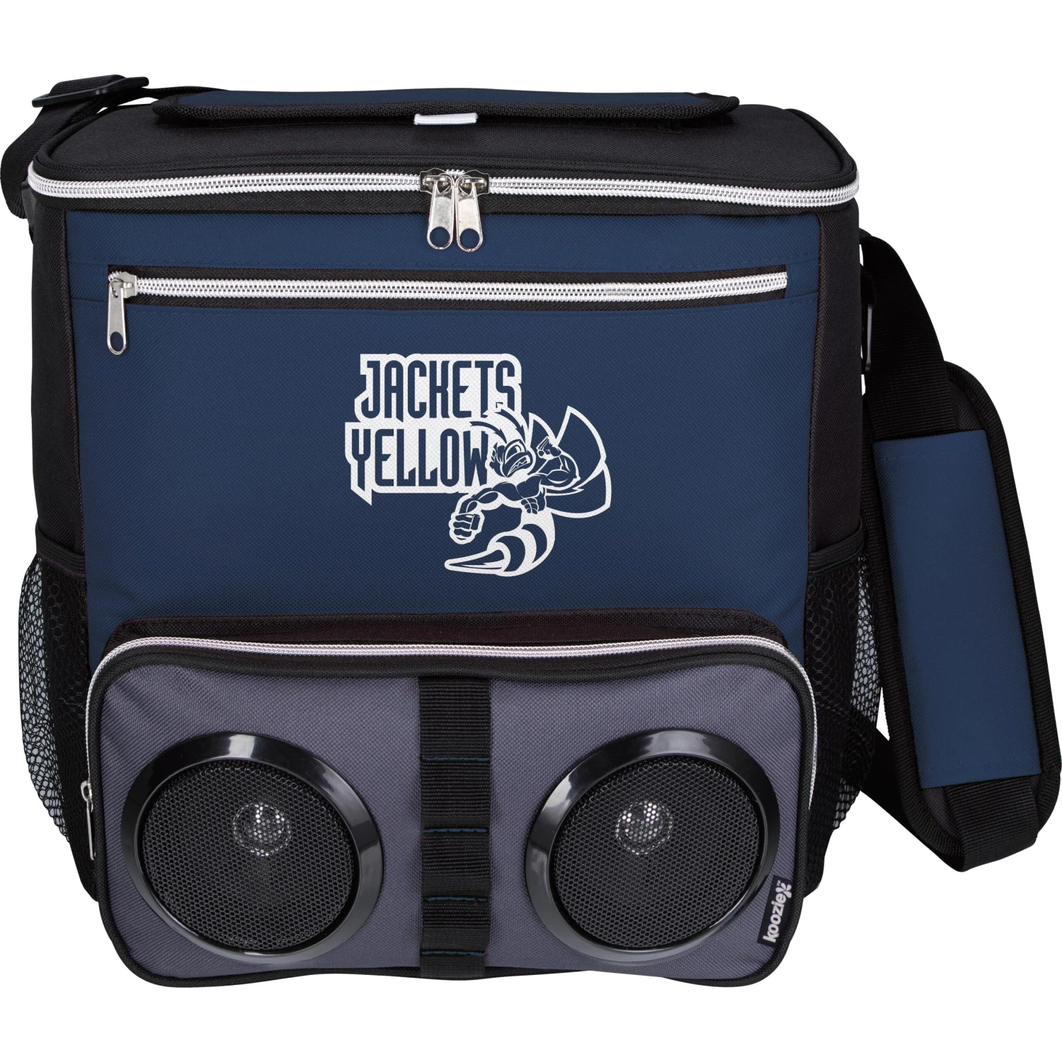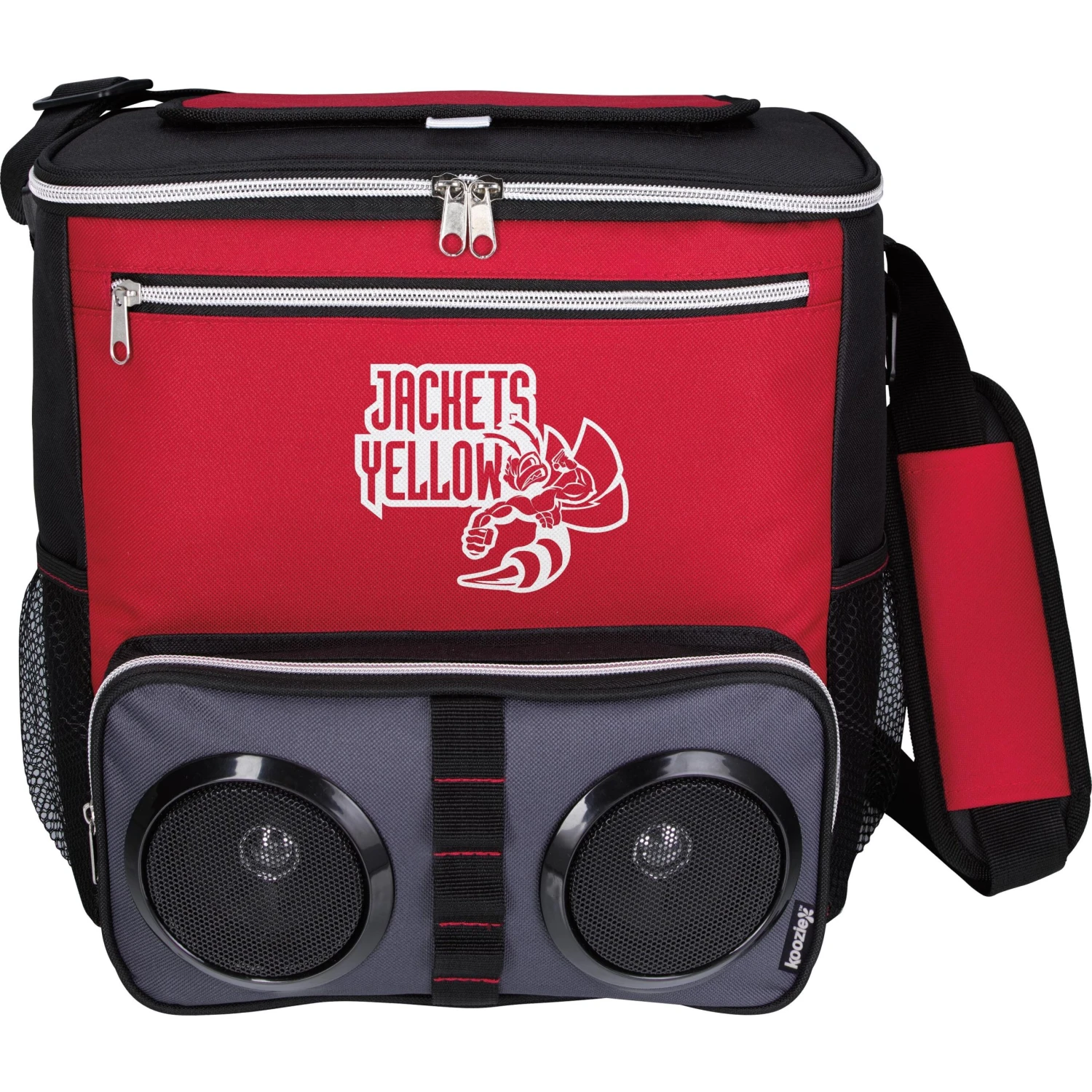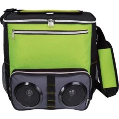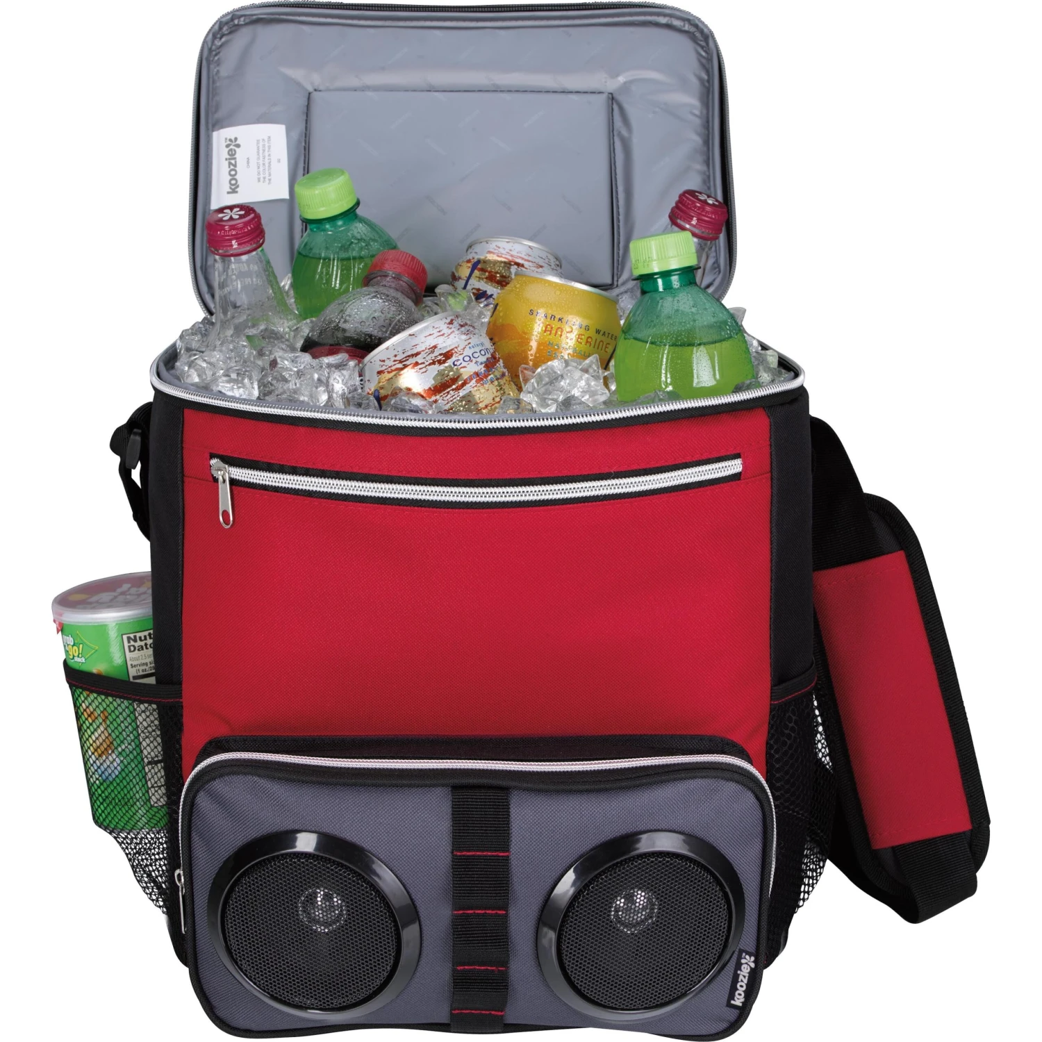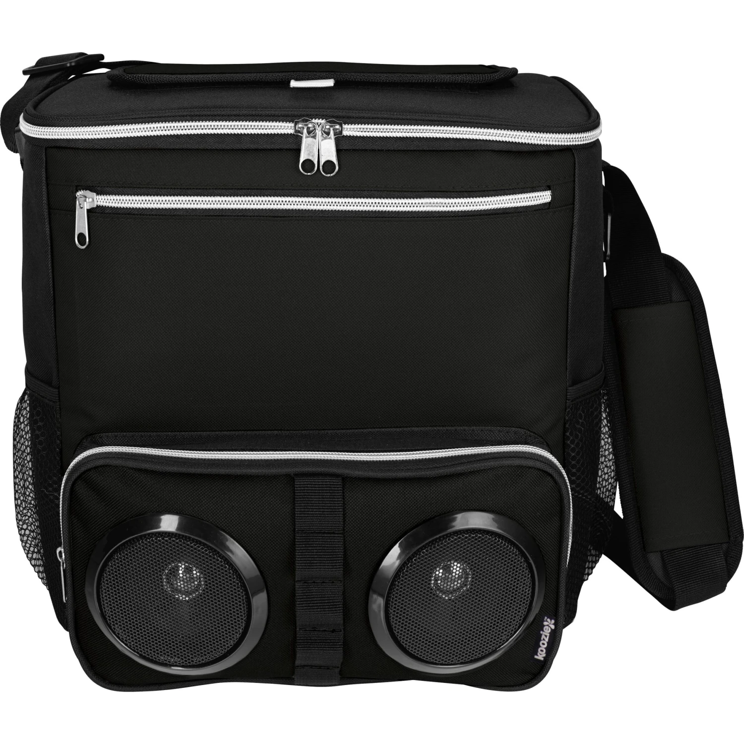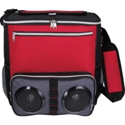 This unusual combo makes chillin’ at the beach or a backyard BBQ easy and fun. Fill the main zippered compartment with ice and your favorite beverages, pair the two Bluetooth speakers mounted in the front pocket to your device and relax the day away in style. Main zippered compartment featuring a top hook-and-loop opening for easy access. Front zippered pocket and two side mesh pockets. Attached bottle opener and adjustable padded shoulder strap. Heat-sealed PEVA liner.