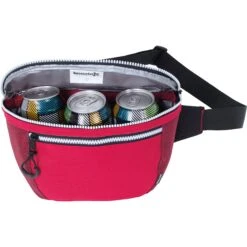 Keep your drinks cool while also looking cool in this insulated fanny pack! Main zippered compartment. Front zippered pocket. Adjustable waist strap with buckle closure. Heat-sealed PEVA liner. Keeps cool with ice packs.