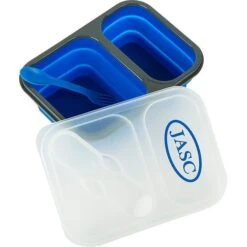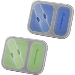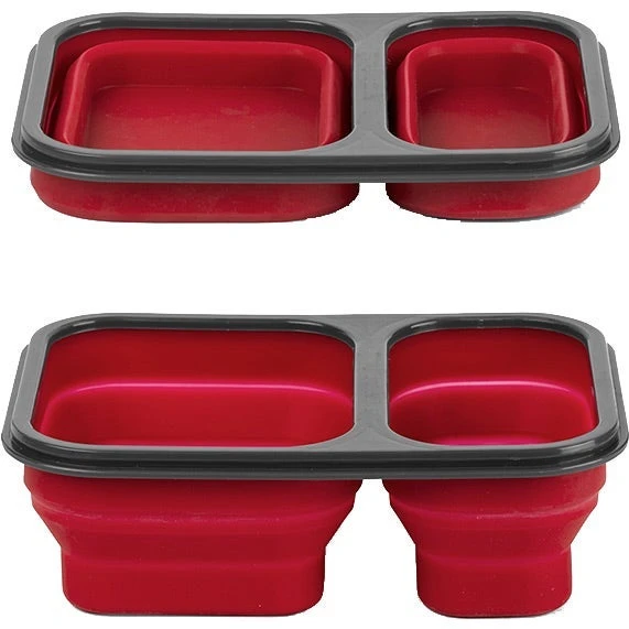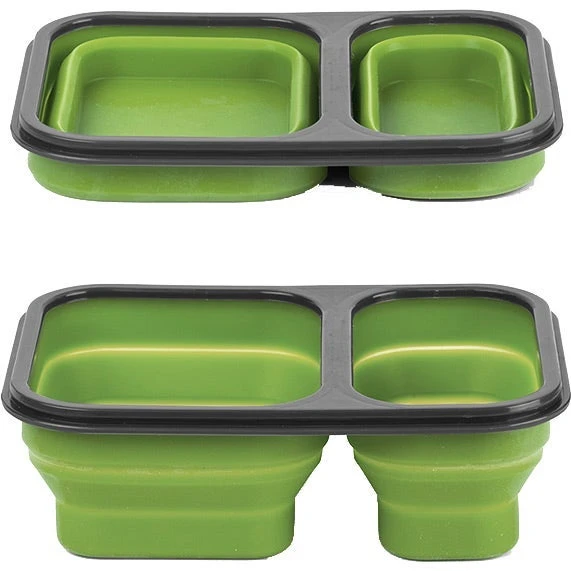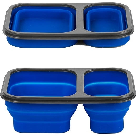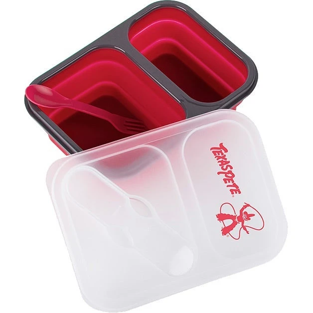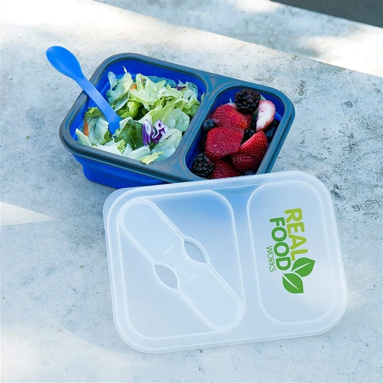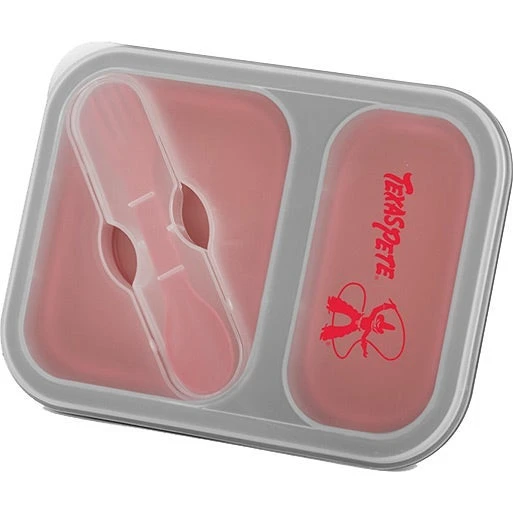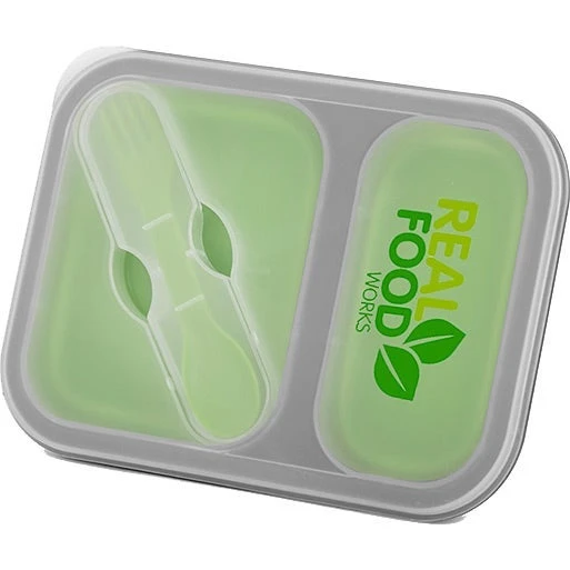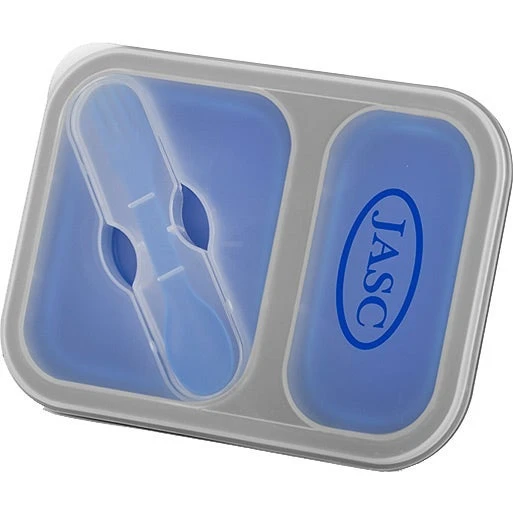 Compact PP and silicone lunch box with built-in fork spoon utensil and divided compartments. Features a soft-touch silicone base that collapses for easy storage and travel. Microwave safe.