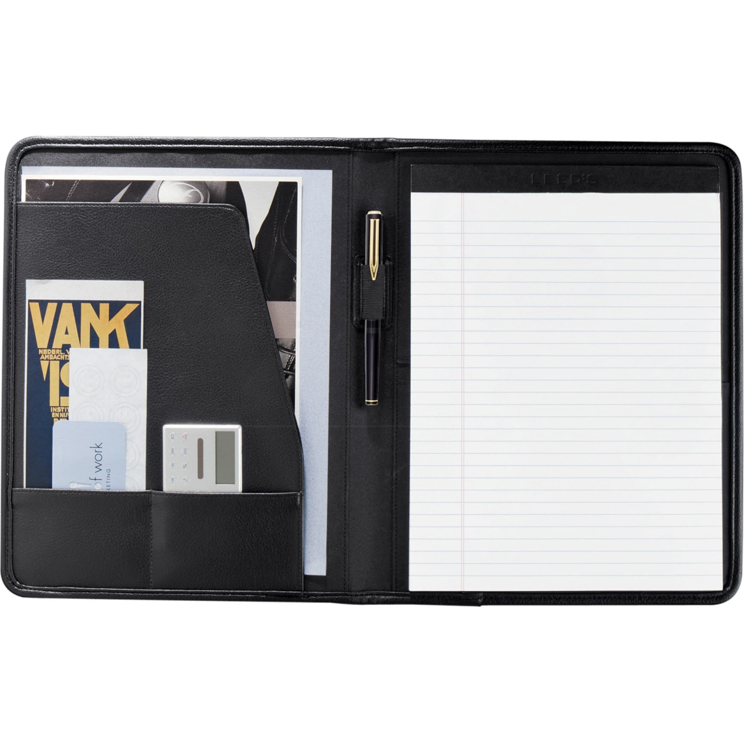 Consider it a low-tech alternative to the modern tablet or smart phone. A writing pad for jotting down notes. An interior organizer to hold documents and business cards. A stylish cover to protect everything. But unlike those devices, this item will never run out of power or need an expensive upgrade.