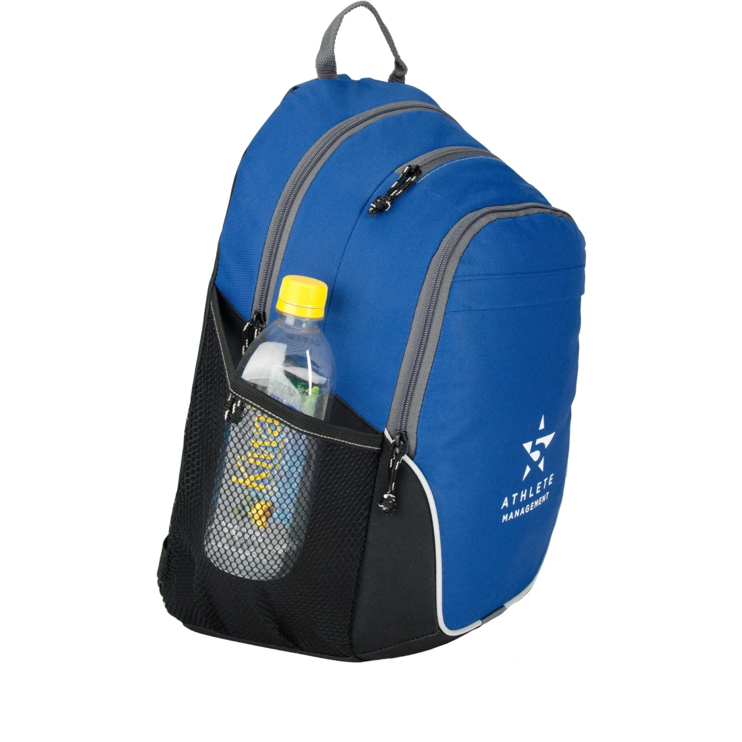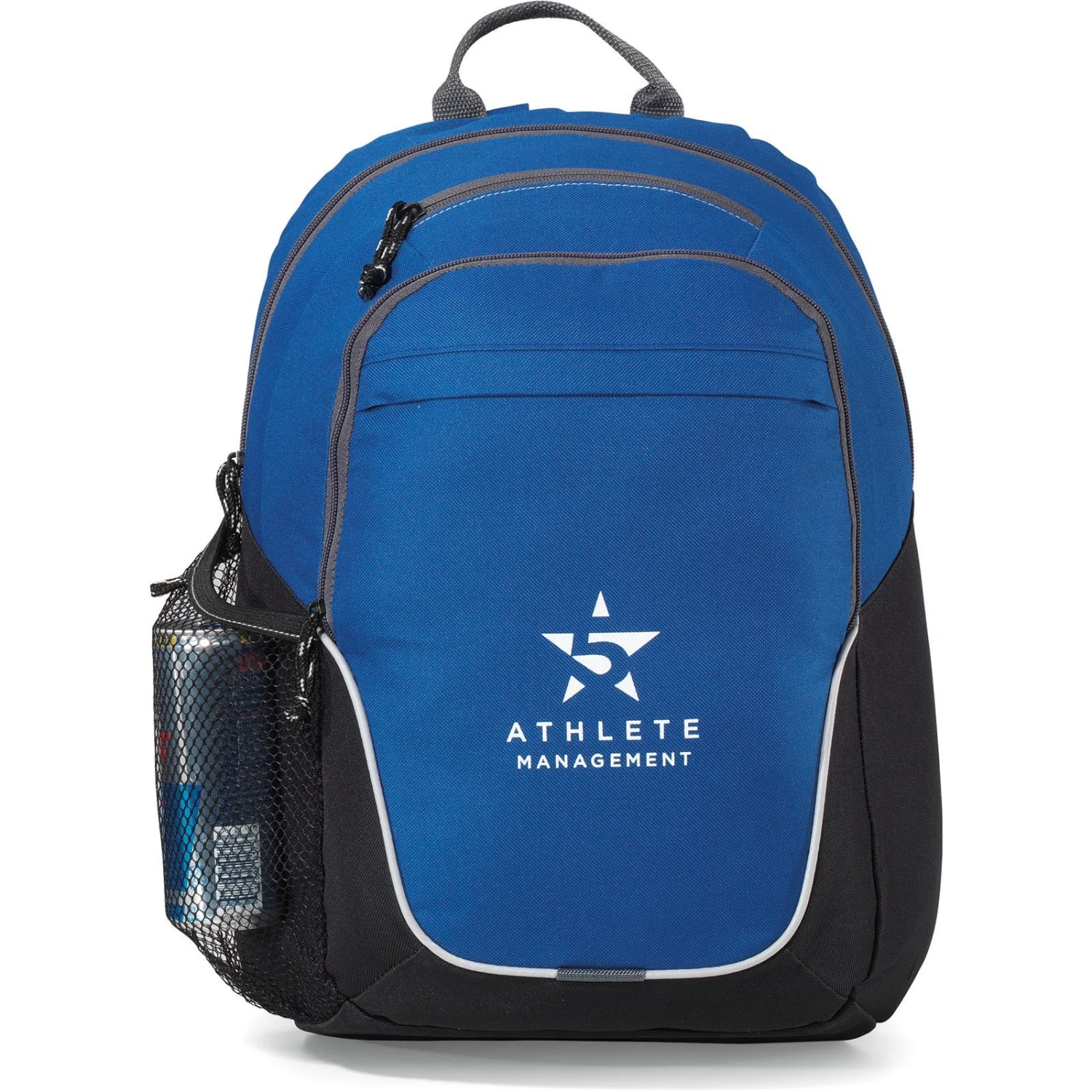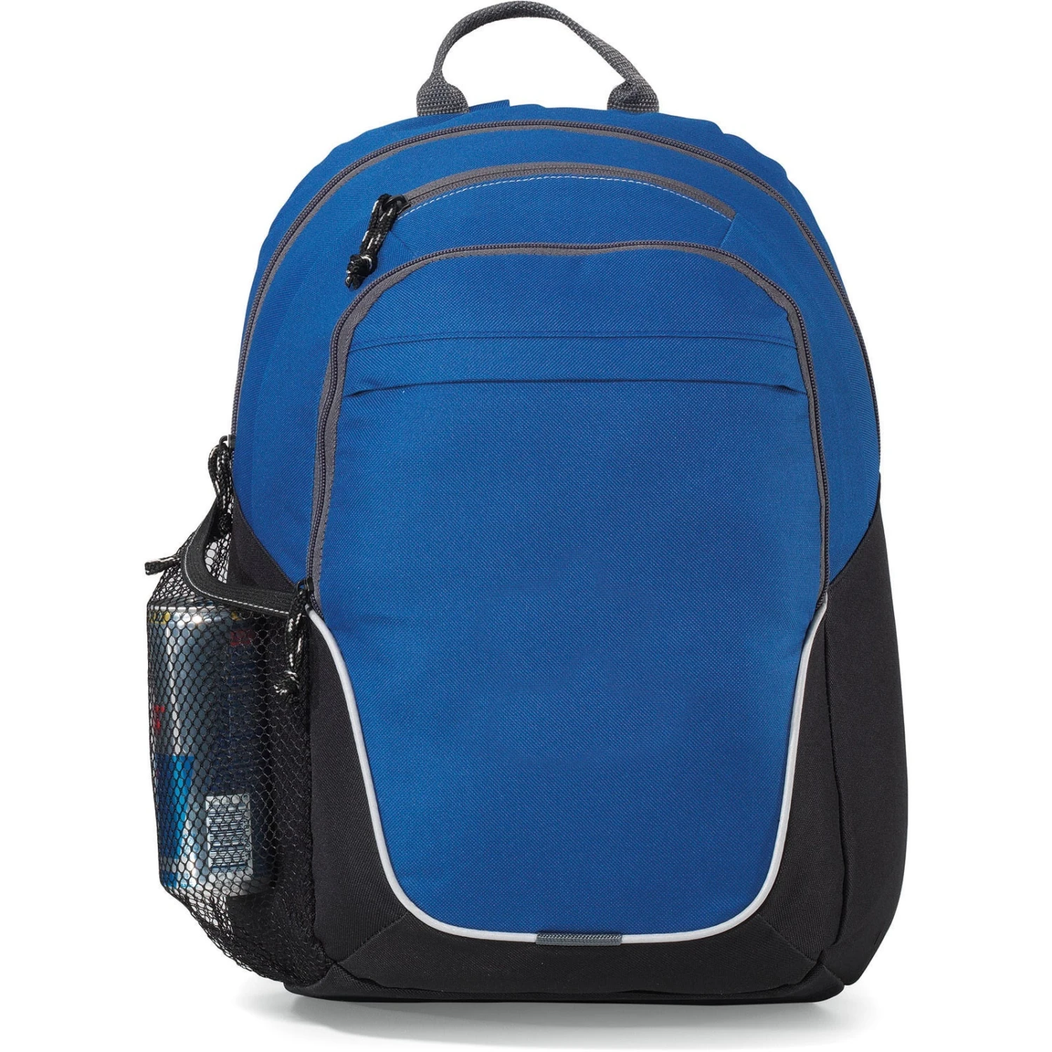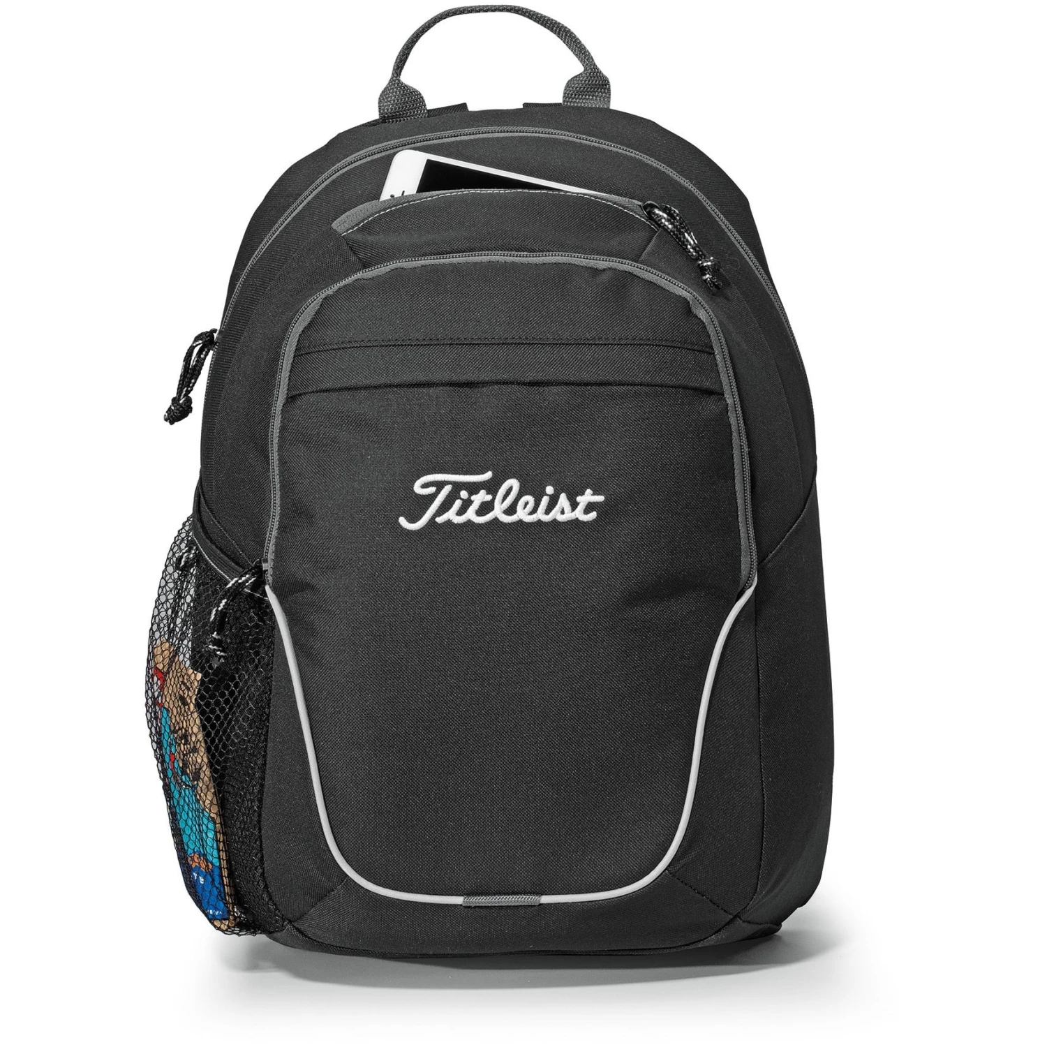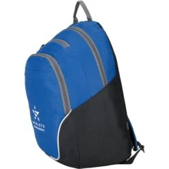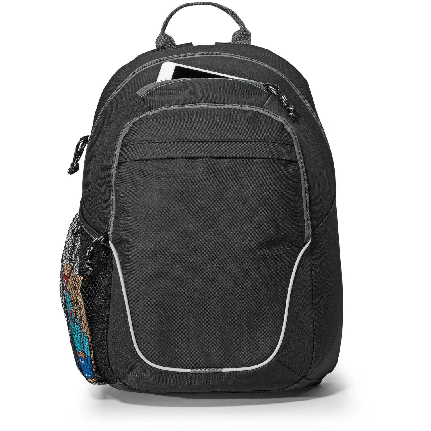 Generous main compartment. Front zippered compartment with multi-function organizer and tablet pocket sized to fit up to a 10″ tablet with a case. Front pocket with rain flap. Top zippered pocket ideal for storing a smartphone. Side mesh water bottle pocket. Top grab handle. Adjustable, padded backpack straps. Multiple decoration locations available.