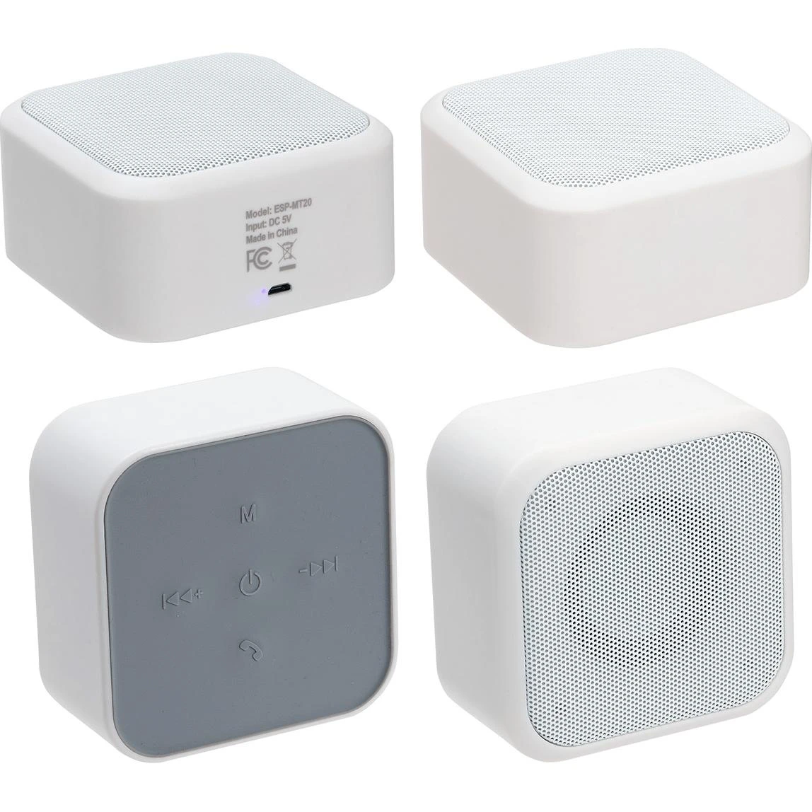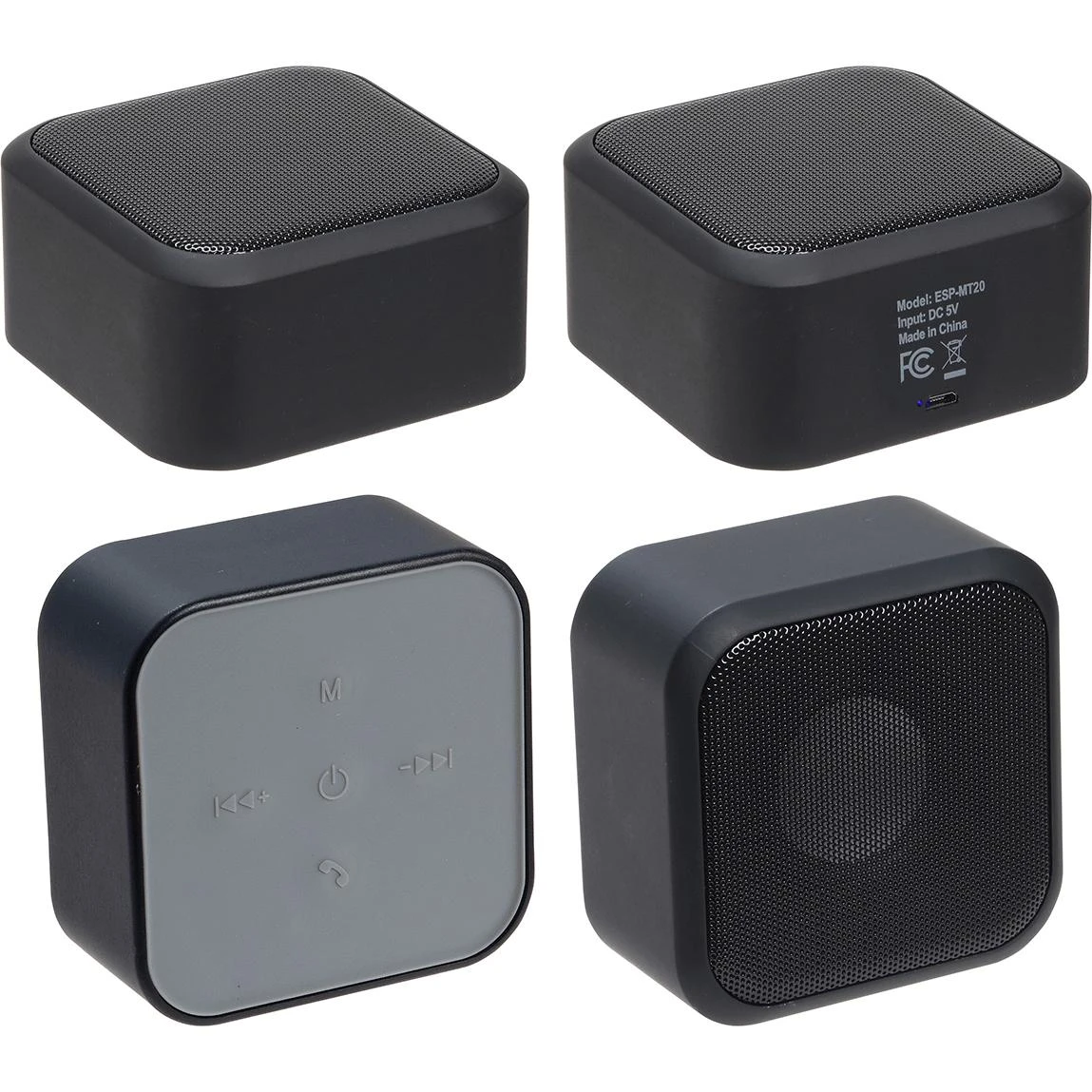 High-quality wireless 3W speaker. Music control buttons include play, pause, skip, or volume control. Playing time: 3 hours. Charging time: 1.5 hours. Includes micro-USB cable. FCC certified.