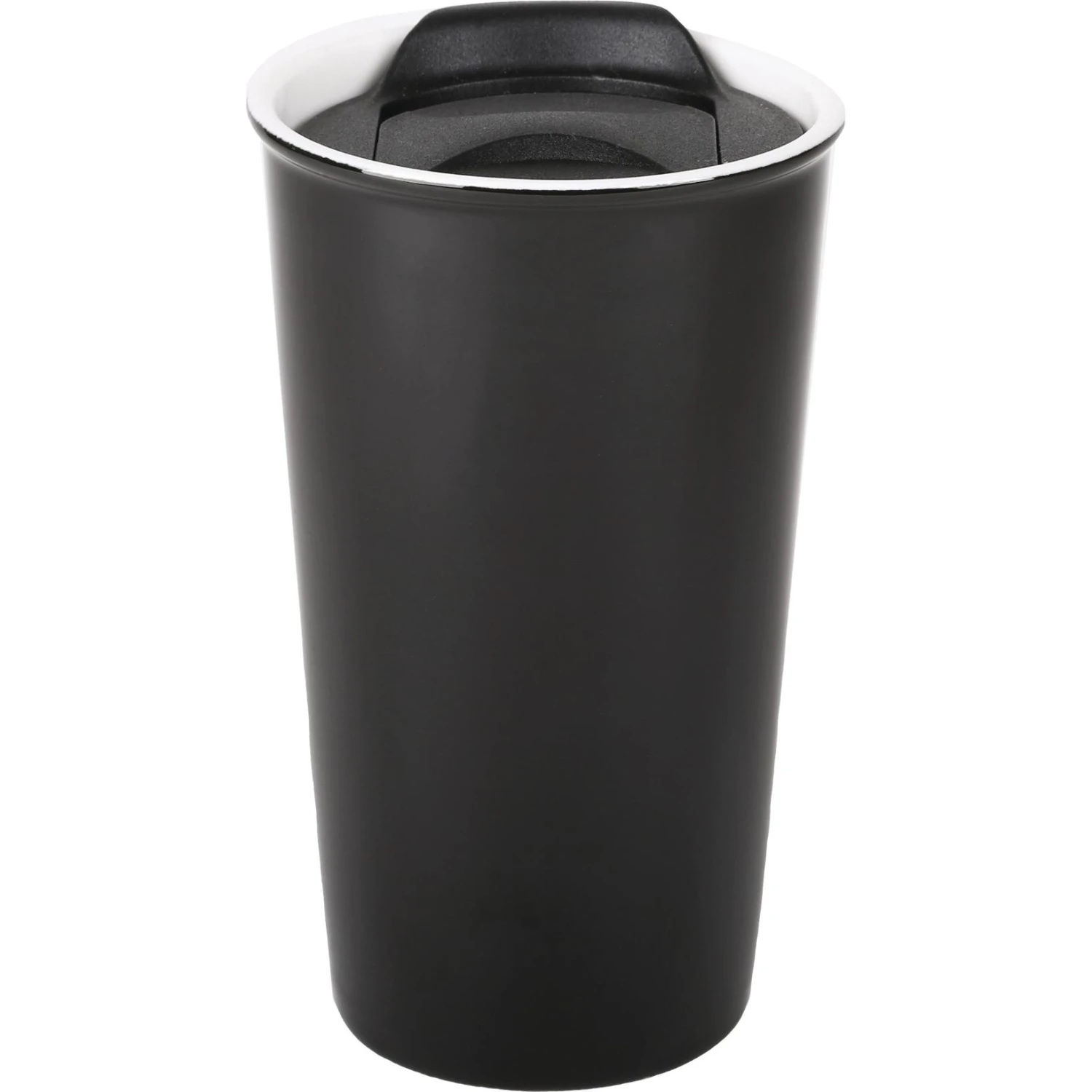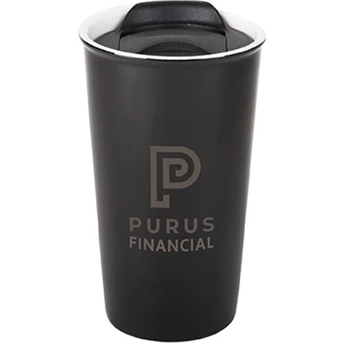 Ceramic quartz. Holds up to 450 ml. (15 fl. oz.). Double walled. Glossy black exterior with a glossy white interior. Black PP slide closure lid. Handwash recommended. Meets FDA requirements. BPA free. Microwave safe (mug only).