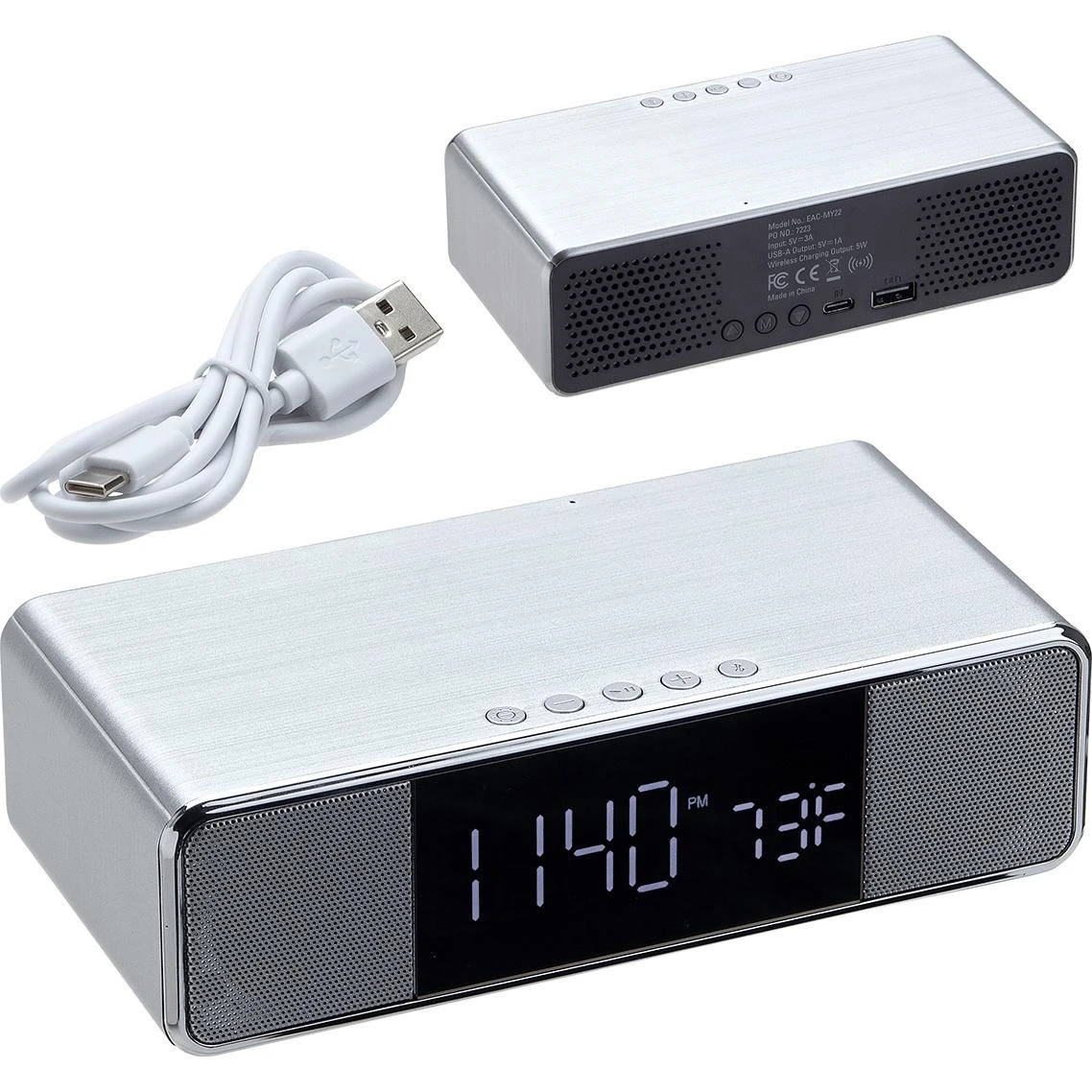 5W wireless charging pad and multi-function clock display with date, calendar, alarm, and temperature. High-quality dual 3W stereo wireless speaker supports hands-free calling. Display with backlight for easy view in the dark. Multi-tone alarm with snooze option. Output: 5V/1A, 5W (wireless charger). Input: 5V/3A. Includes USB Type-C cable. FCC certified.