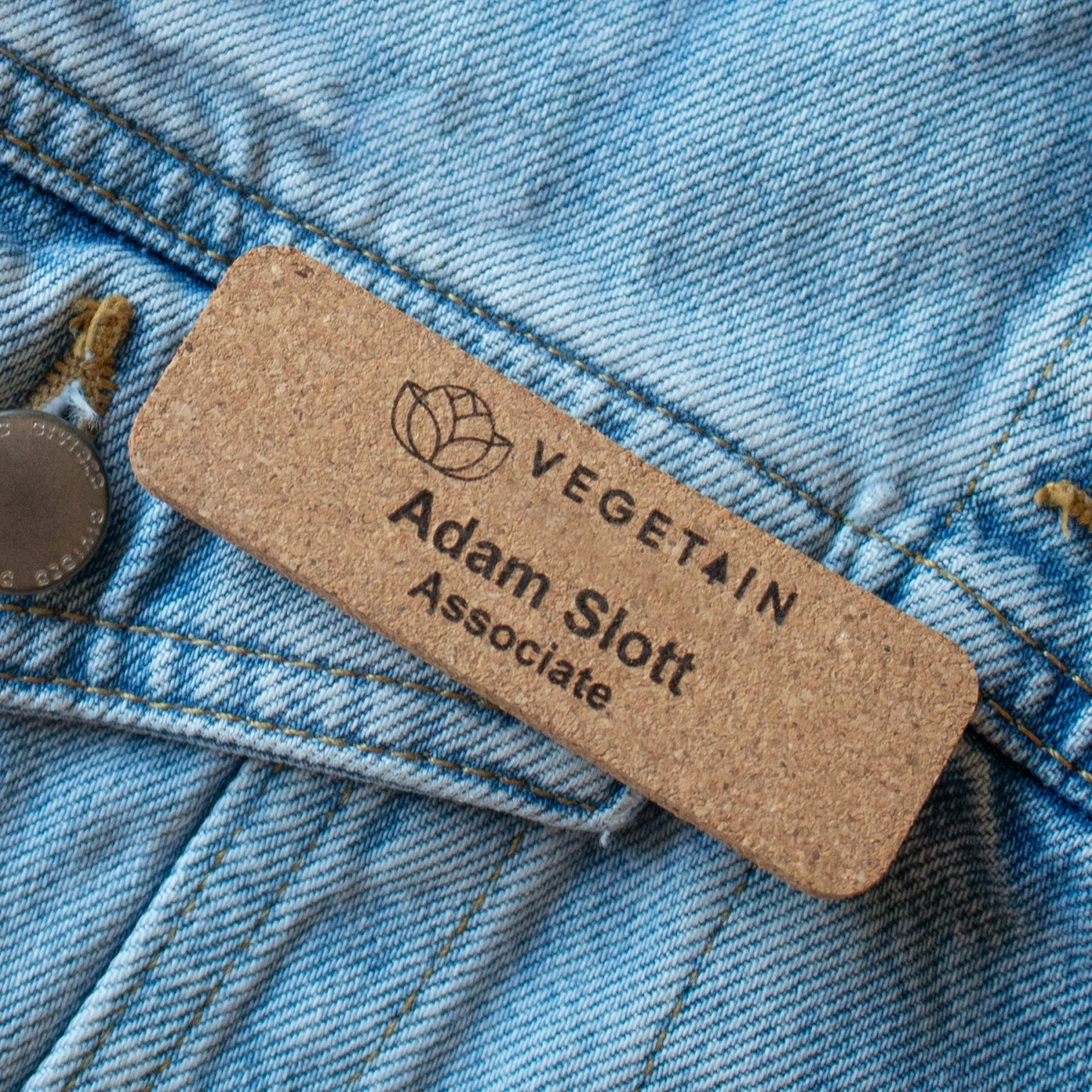 The lightweight, eco-friendly Napa Cork Name Badge will let your team stand out in any business or social gathering with a beautiful laser-etched logo and name. The cork is 100% renewable, making it a sustainable choice for your brand, and it comes with a standard jeweler’s pinback attachment.