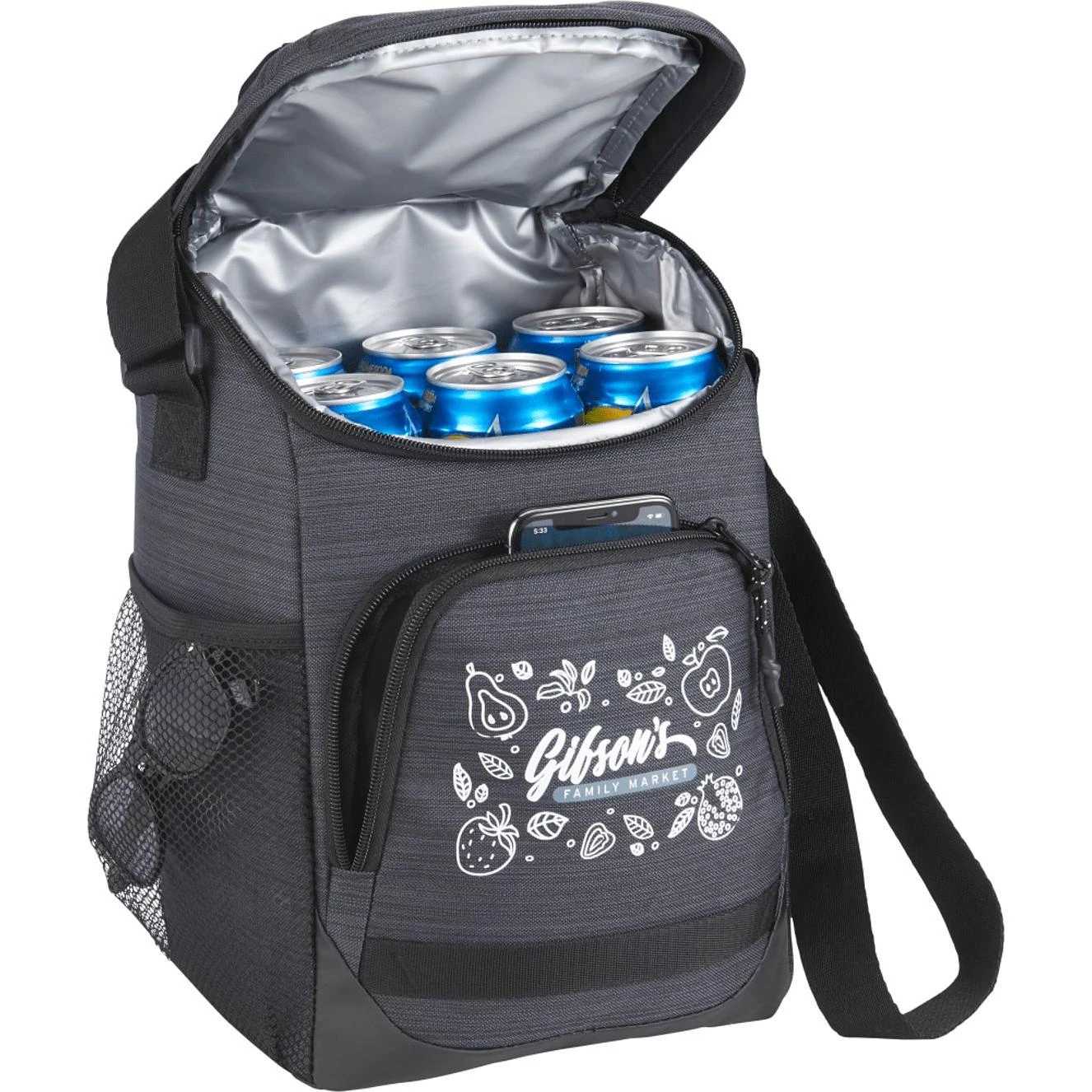 The NBN Mayfair 12 Can Cooler is ideal for group events and company outings. With a 12-can capacity, store snacks and beverages in the main compartment, zippered front pocket, or mesh side pocket. Its black zipper pullers can be swapped with red or olive pullers to provide a colorful, custom look. The NBN Mayfair 12 Can Cooler features a front vinyl lash-tab, a PEVA lining, an adjustable strap, and an interior ID label.
