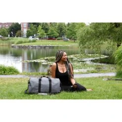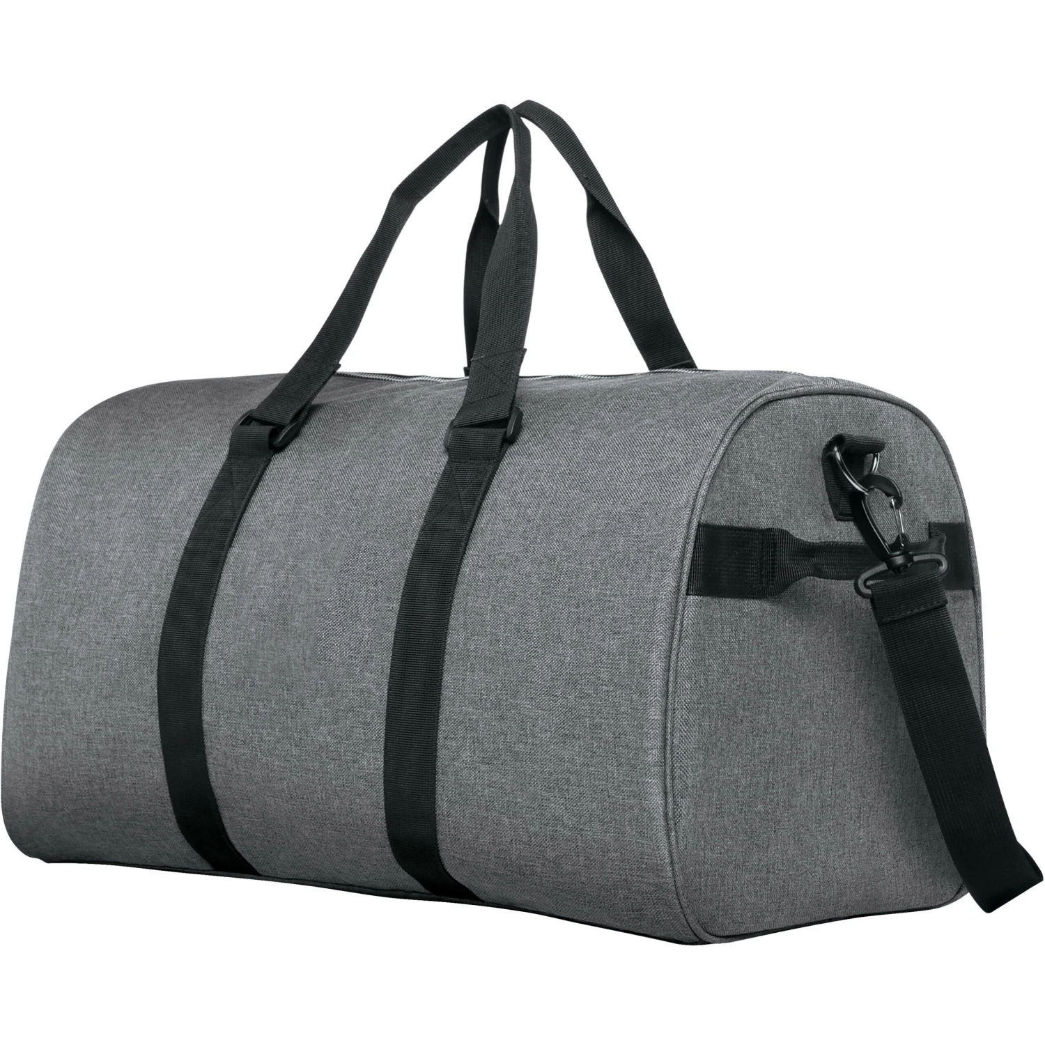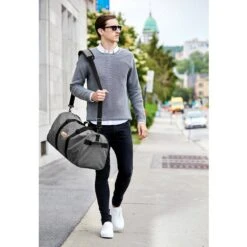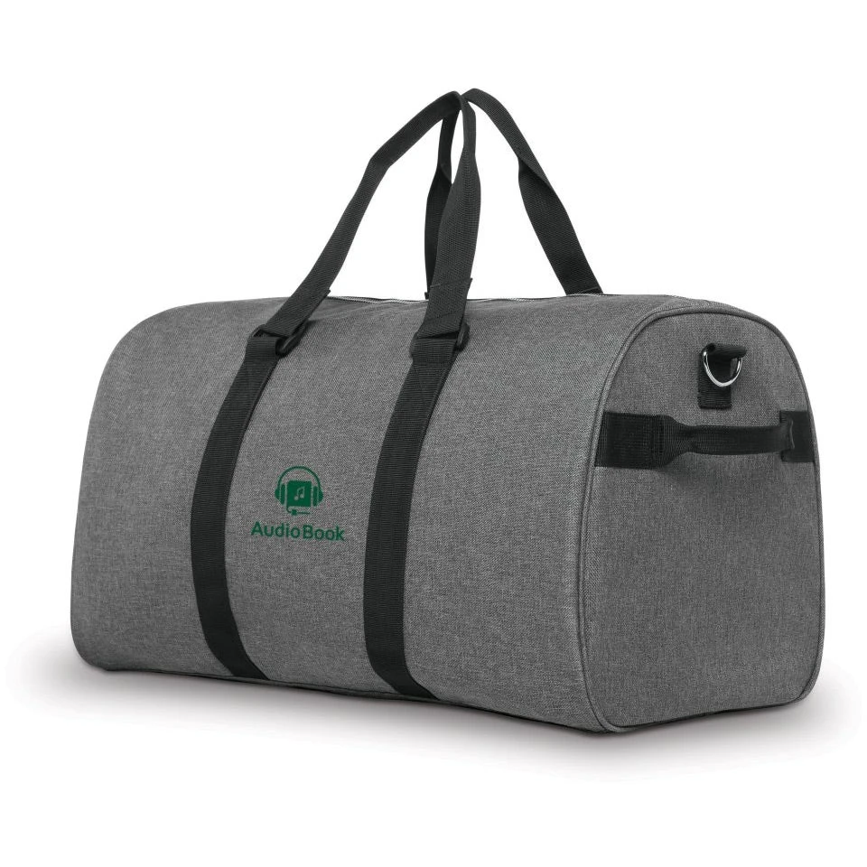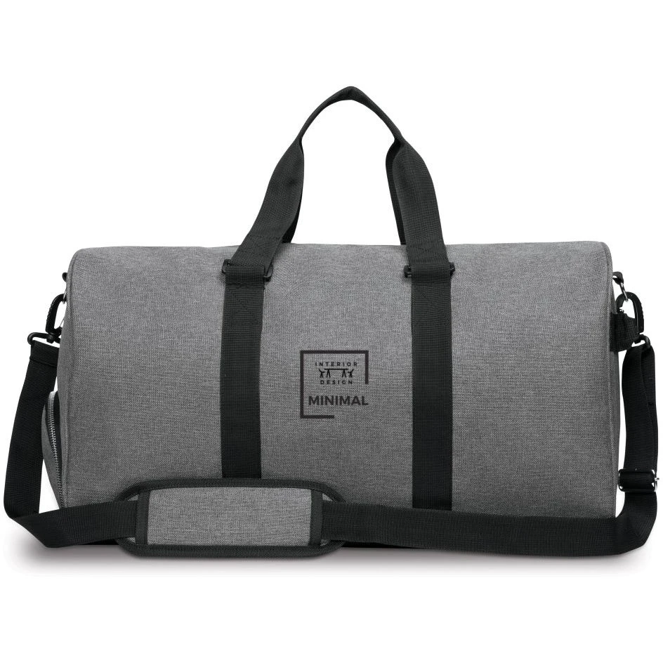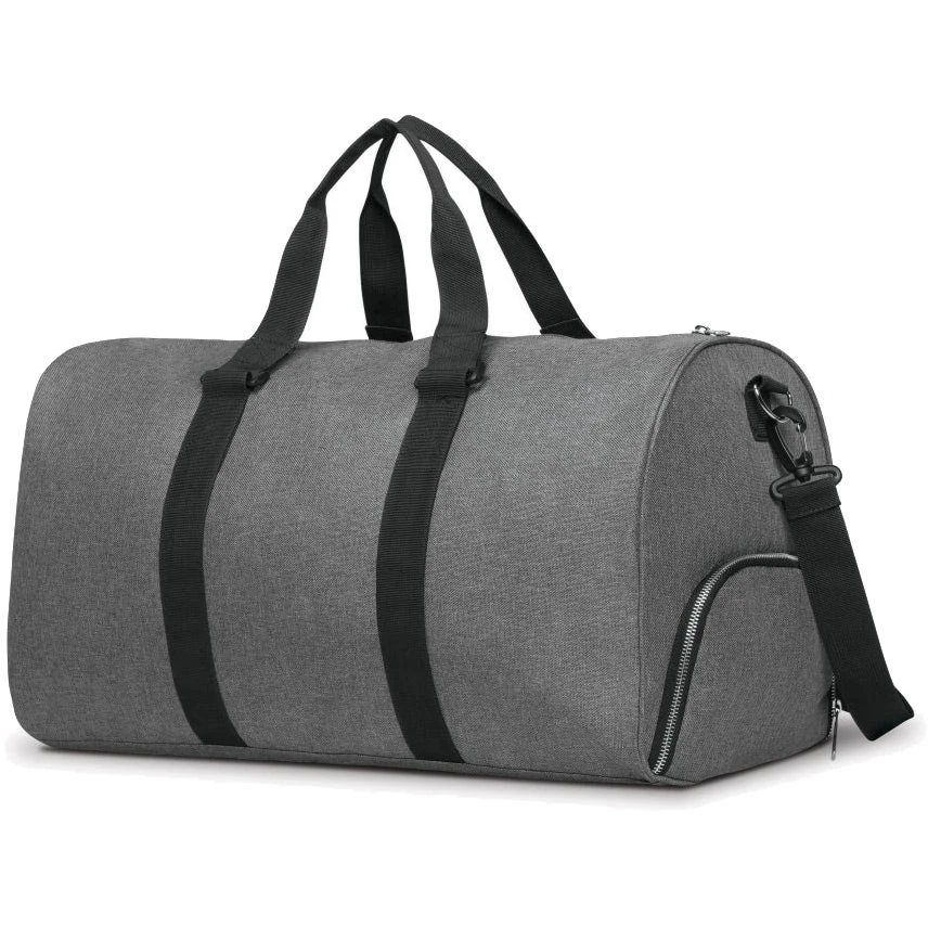 The large top-access main compartment has ample room for many outfits, accessories and toiletries. Shoes can be placed in the side-access storage, keeping the main compartment clean and sanitary. The two large inside clothing compartments are perfect for your undergarments and delicate fabrics. The inside mesh pocket is for great for storing your media items and cables. The side grab handle makes it easy to retrieve the duffel when stored overhead. The cross body strap is removable if you prefer holding the bag from the top handles. The strap stabilizer supports your shoulder when wearing the duffel as a cross body. The long strap has an adjustment slide for easy fitting. The bag can hold up to 30 lbs of weight. 600D heather gray polyester. 210D pin-stripe polyester liner. Integrated baseboard for stability.