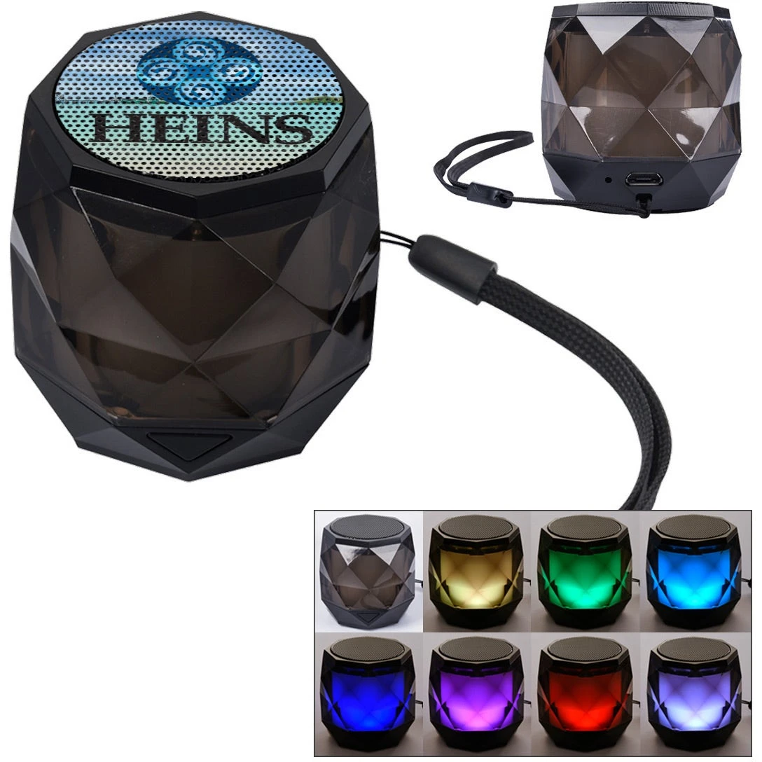 Wireless speaker featuring high definition Bluetoothâ„¢ 4.2 Technology. Simply pair your device to enjoy dynamic stereo sound. Multi-color LED lights change color when in use. Perfect for your home, office, or outdoor activities. Charging audio I/O cord included. Pairs from up to 30 feet away. 200 mAh lithium polymer battery included. Up to 2 hours of play time. Wrist strap. Non-slip bottom. The Bluetoothâ„¢ word mark and logos are registered trademarks owned by the Bluetooth SIG, Inc. and any use of such marks by Quality Logo Products, Inc. is under license. Other trademarks and trade names are those of their respective owners.