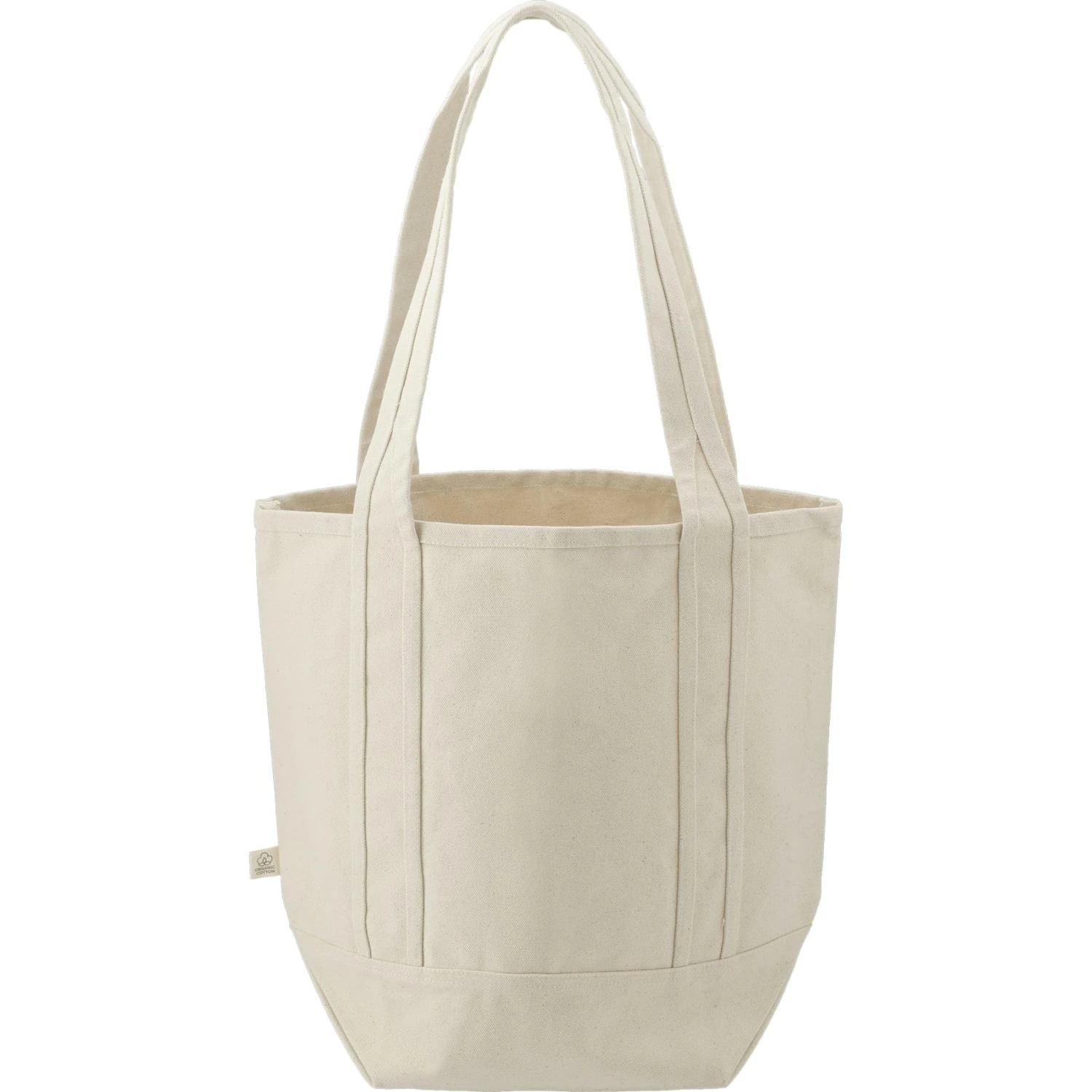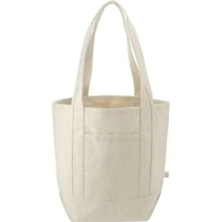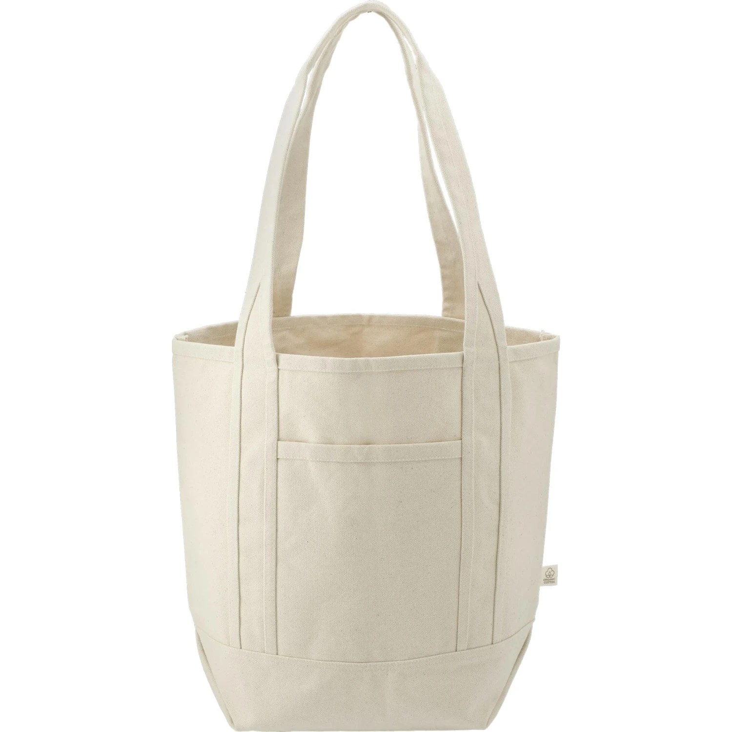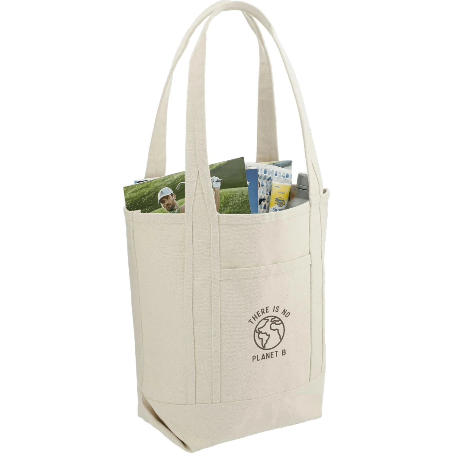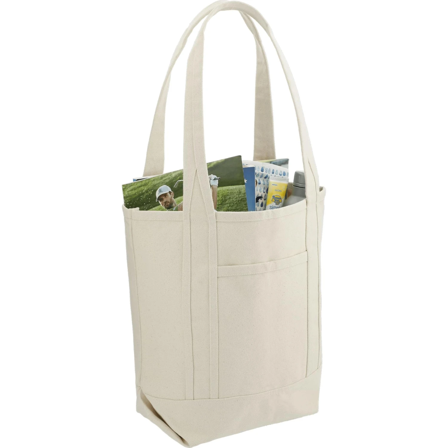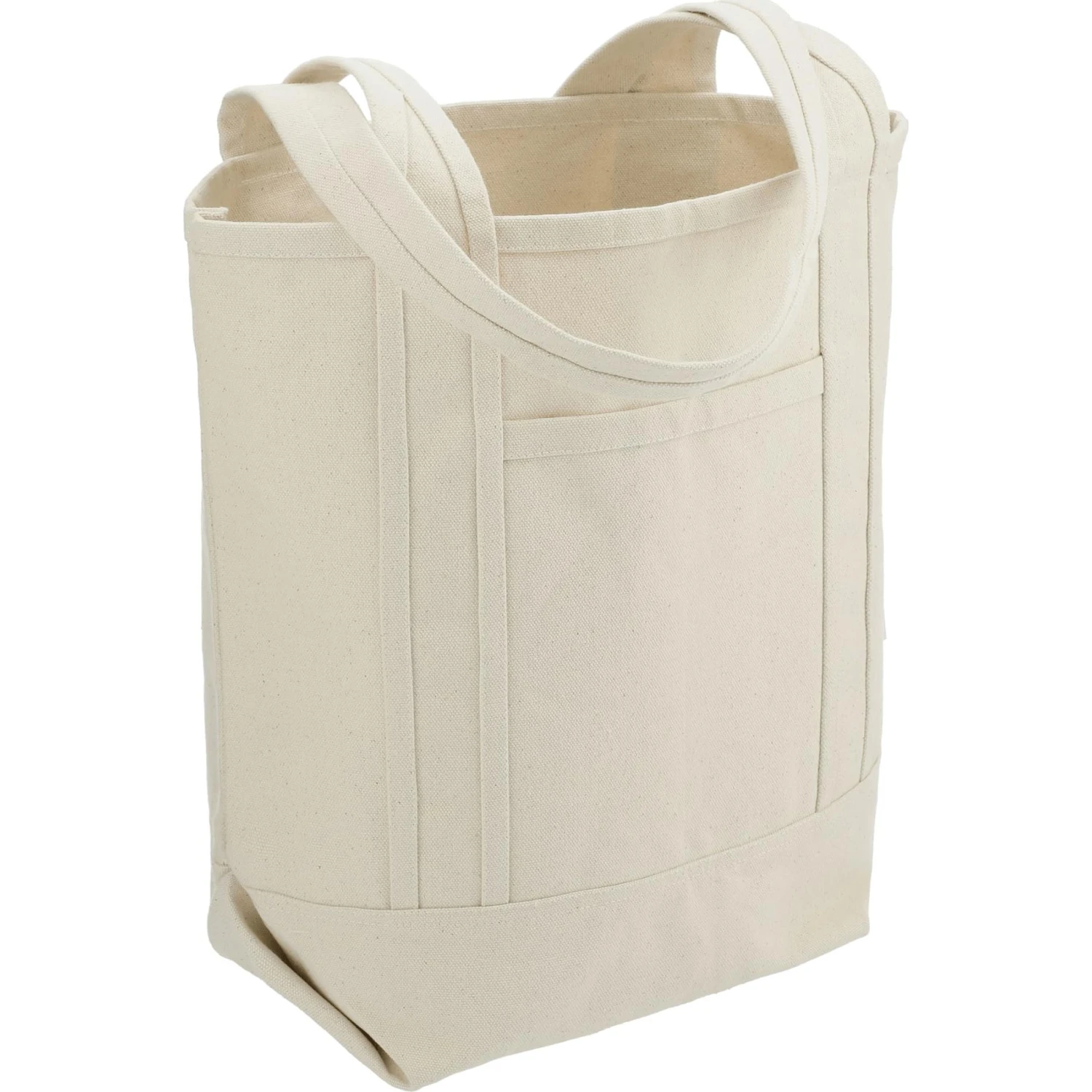 The Organic Cotton Boat Tote Bag is made from GOTS OE Cotton. This sustainable take on a classic style features a front slash pocket and double 12.5″ drop handles.