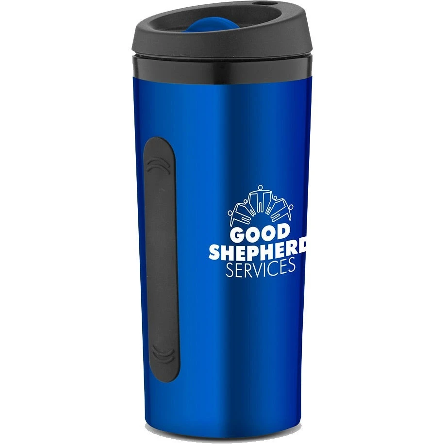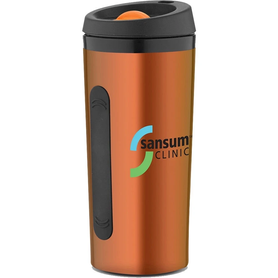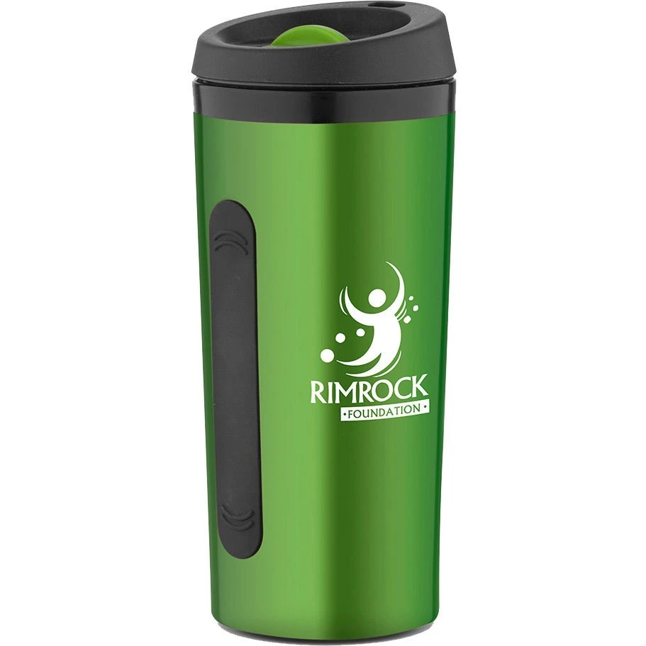16 Ounce travel tumbler with stainless steel exterior and plastic interior. Screw-on black plastic lid with color accent. Thumb slide closure lid for spill prevention. Double wall enclosure keeps the exterior cool to the touch and prevents condensation when drinking hot or cold beverages. Black silicone strip on both sides provide comfort grip while holding. Hand wash recommended, not microwave safe.