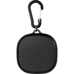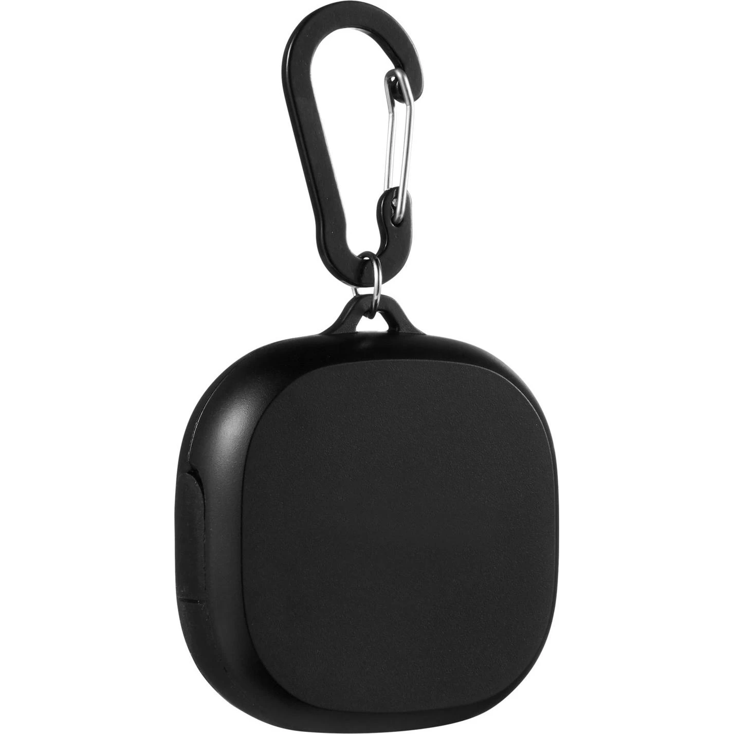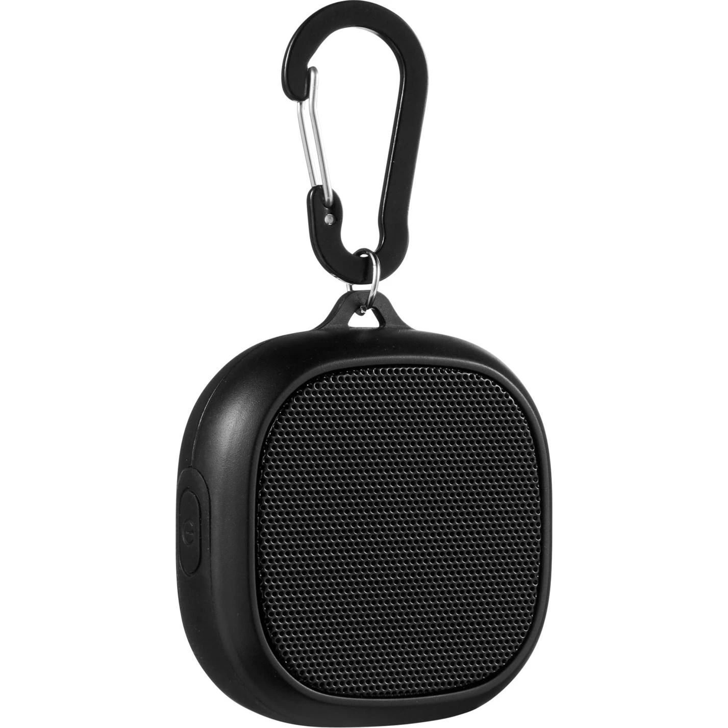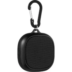 ABS plastic. Wireless version 5.0 with rechargeable 300mAh lithium polymer battery. 3W speaker output. Approximate 30-foot wireless range. USB-C charging cable included. Features a carabiner clip that can be attached to your backpack or bag.