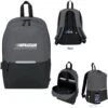 Heathered polyester. Double zipper closure to main compartment. Main compartment has open padded laptop sleeve, two pen holders and an open slash pocket. Fits laptops up to 17″. Inner 210T PU liner. Front pocket with slide zipper closure. One top webbed handle and one padded carry handle. Adjustable padded shoulder straps. Mesh on back panel, inside top handle and underneath shoulder straps. Packed in a non-woven storage bag.